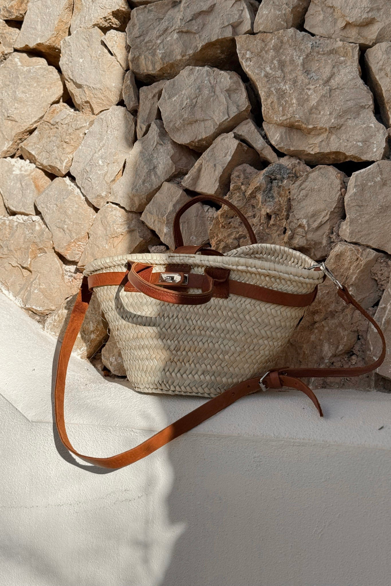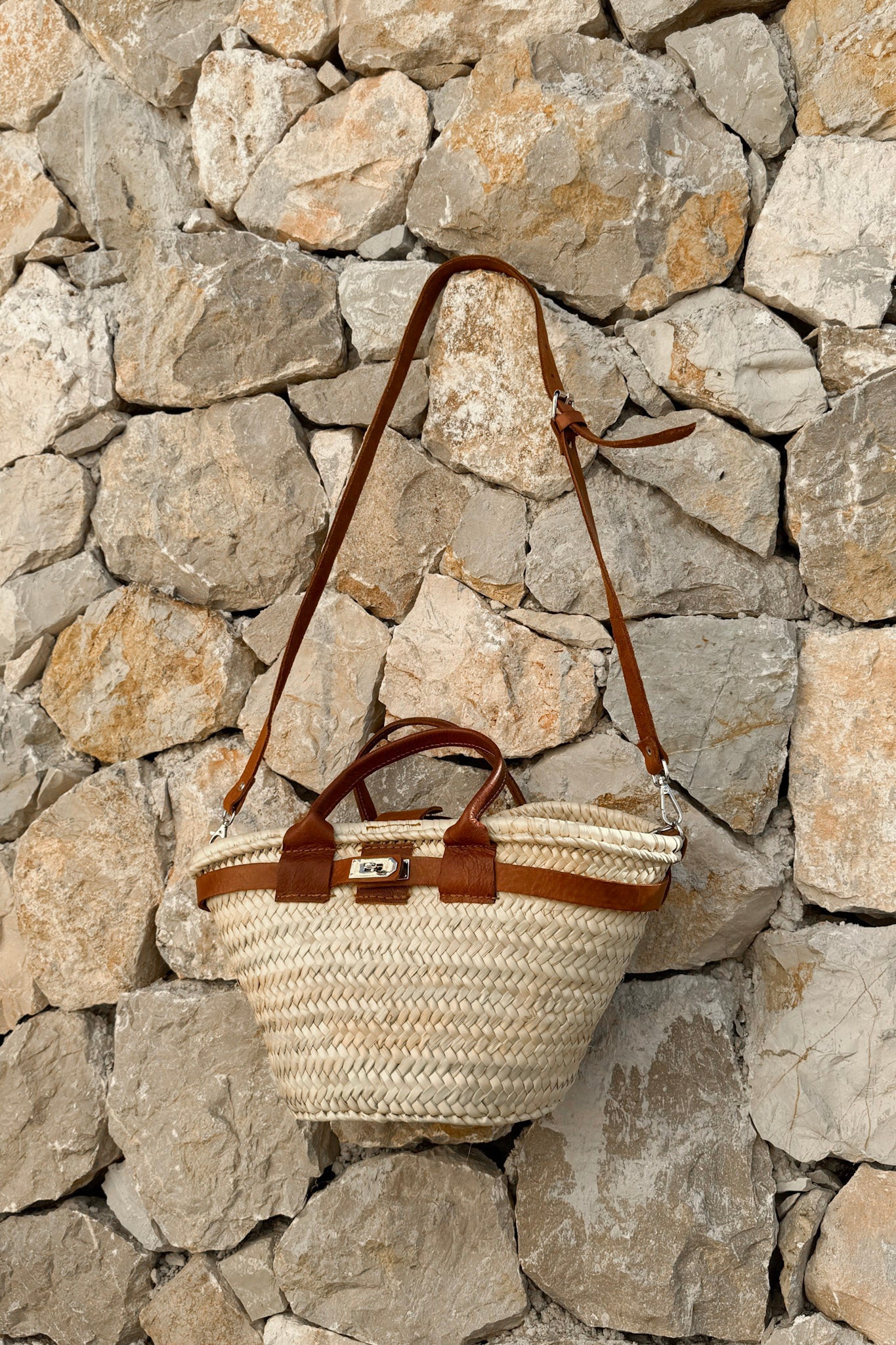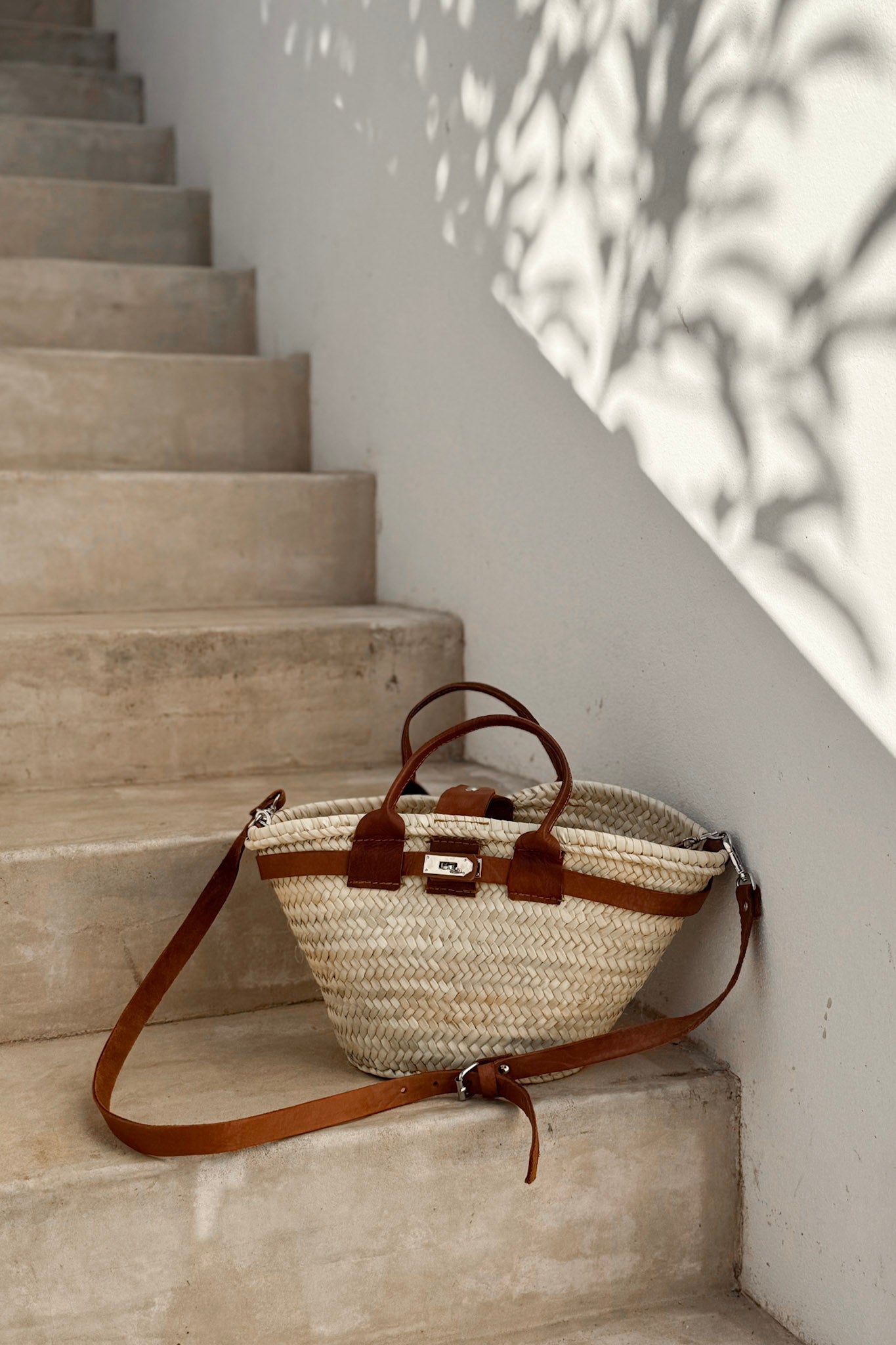 Ajaton ja käytännöllinen korikassi, joka on valmistettu käsin punotusta palmunlehdestä. Luonnollinen materiaali tekee kassista kevyen mutta kestävän, ja kaunis punos tuo siihen rentoa, välimerellistä tunnelmaa. Kontrastina toimivat ruskeat nahkaiset yksityiskohdat ja säädettävä olkahihna, jotka lisäävät käyttömukavuutta ja antavat modernin ilmeen.