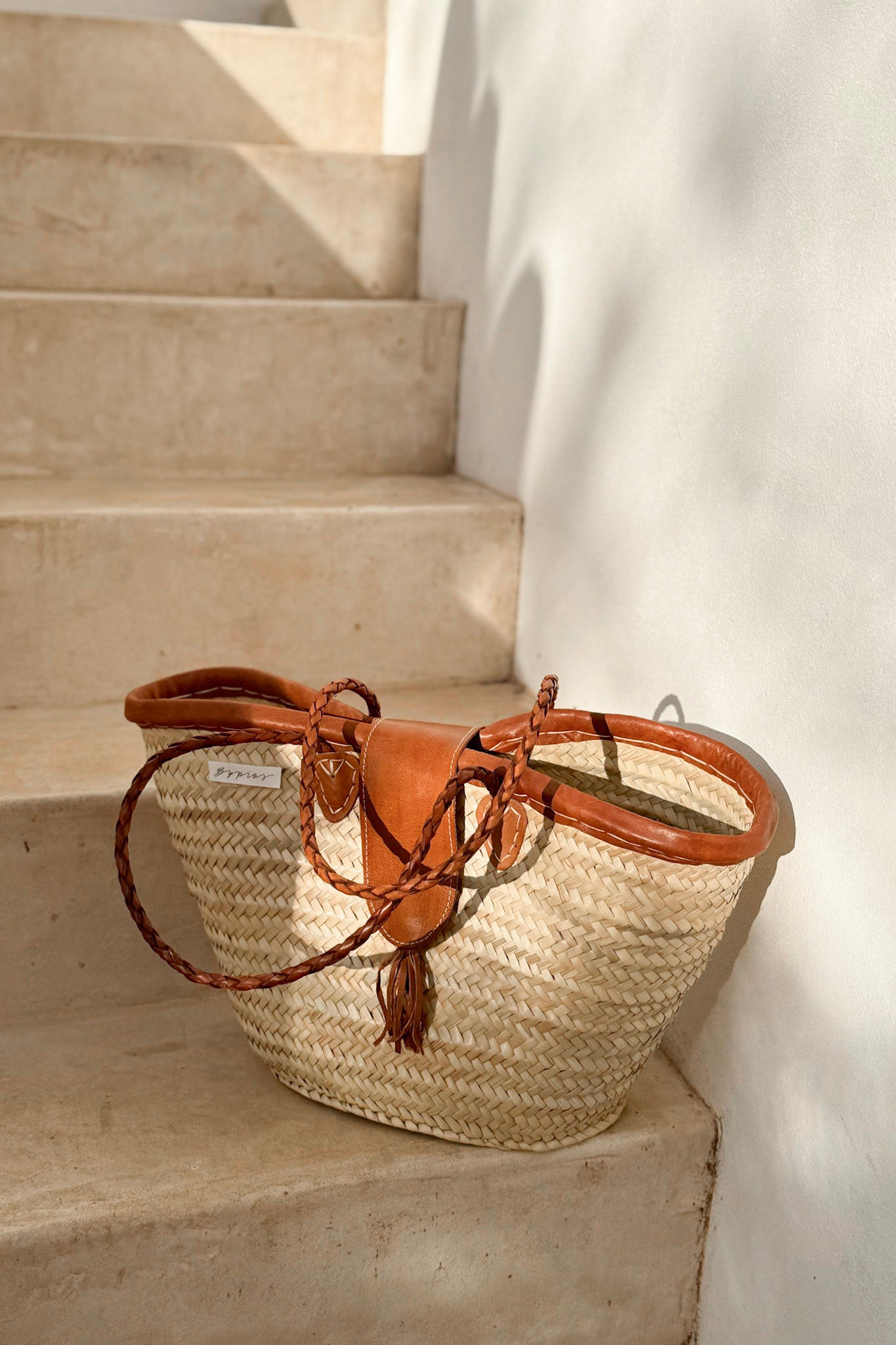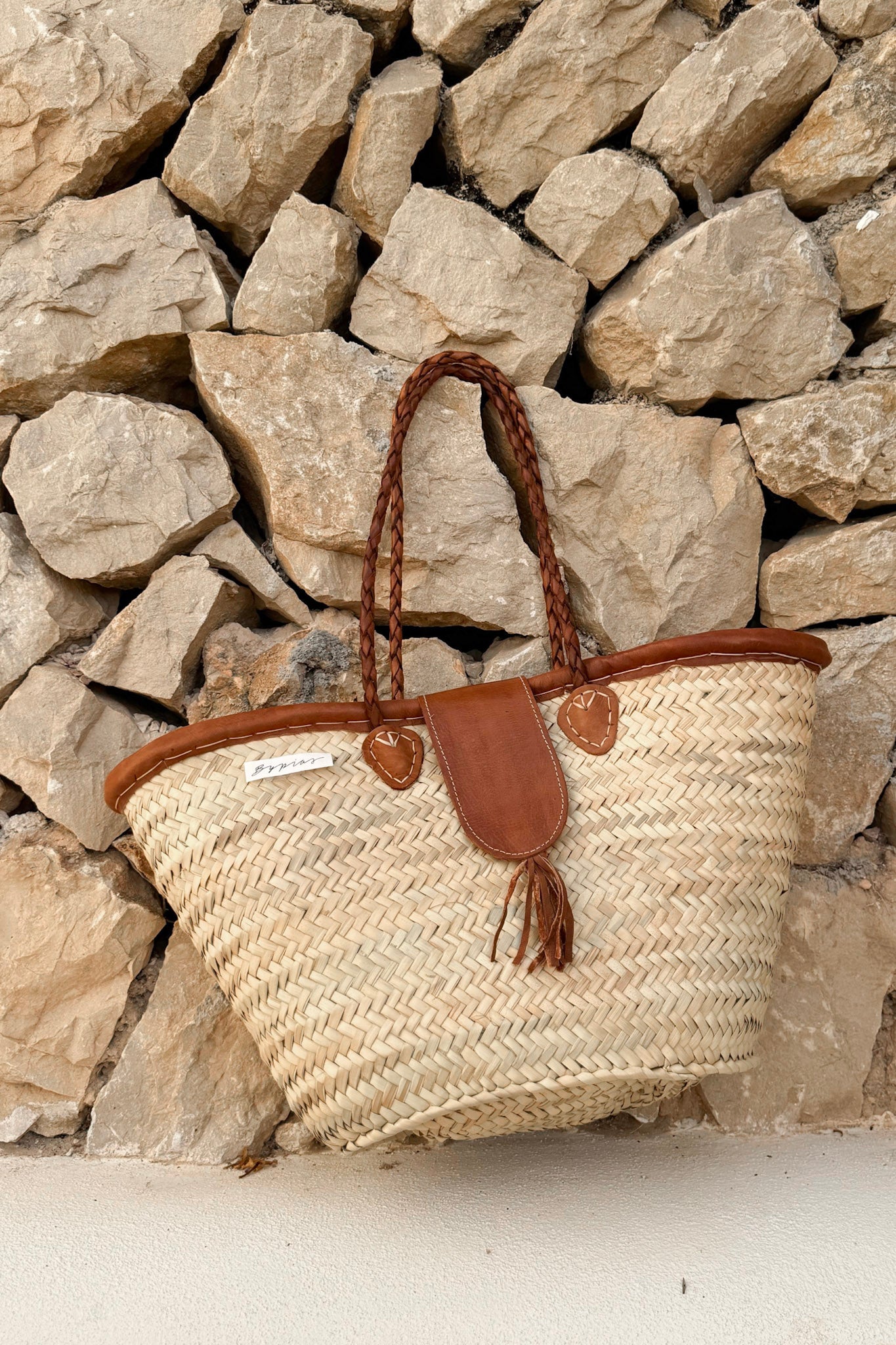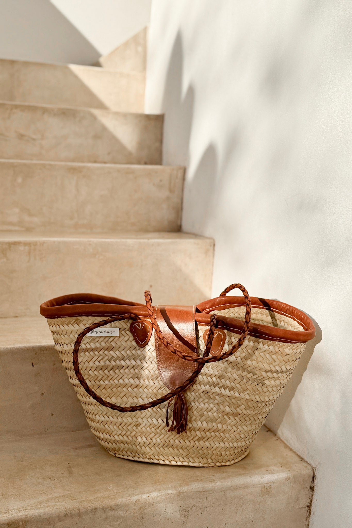 Ajaton korikassi, jossa on kauniit nahkaiset yksityiskohdat. Kassi on valmistettu punotusta luonnonmateriaalista ja viimeistelty nahkaisilla kahvoilla, reunuksella sekä sulkemisläpällä tupsulla. Tilava ja kevyt malli sopii erinomaisesti arkeen, rannalle ja kesäretkille.
