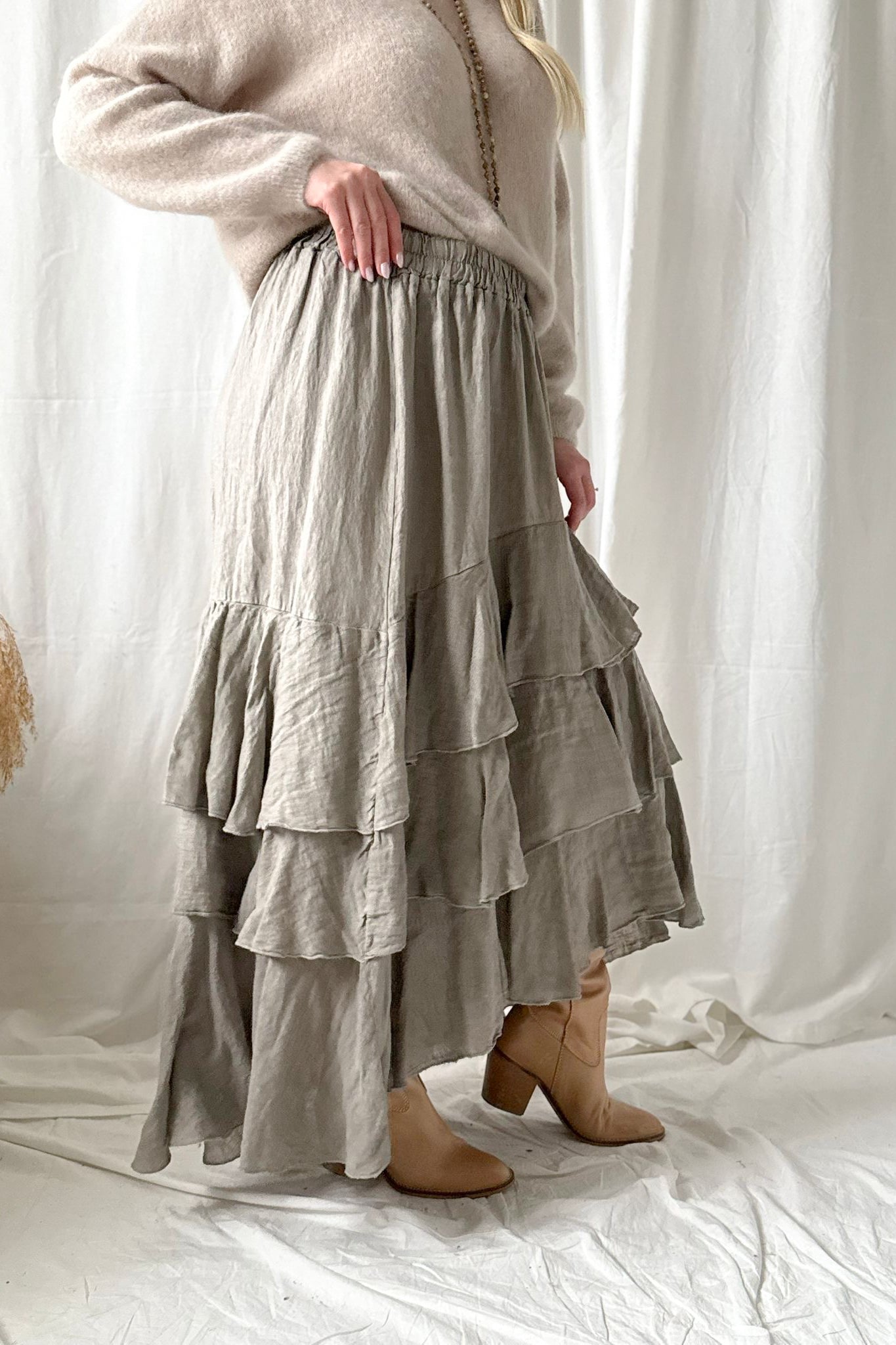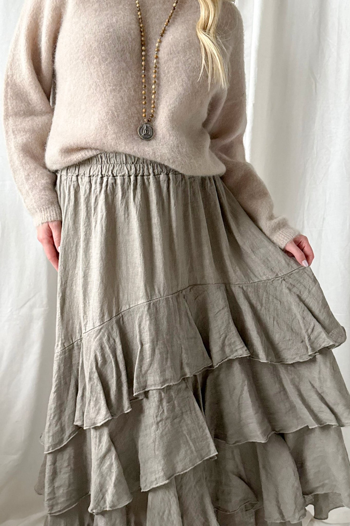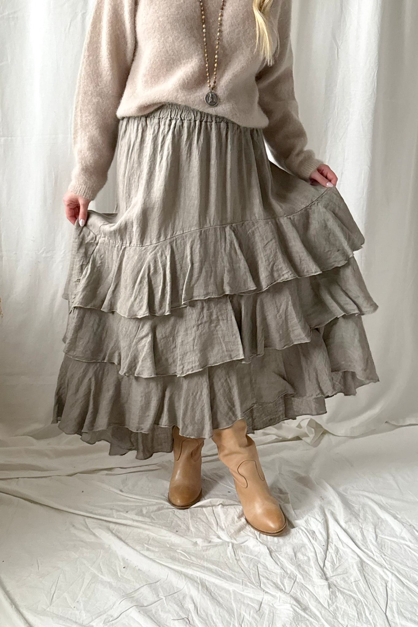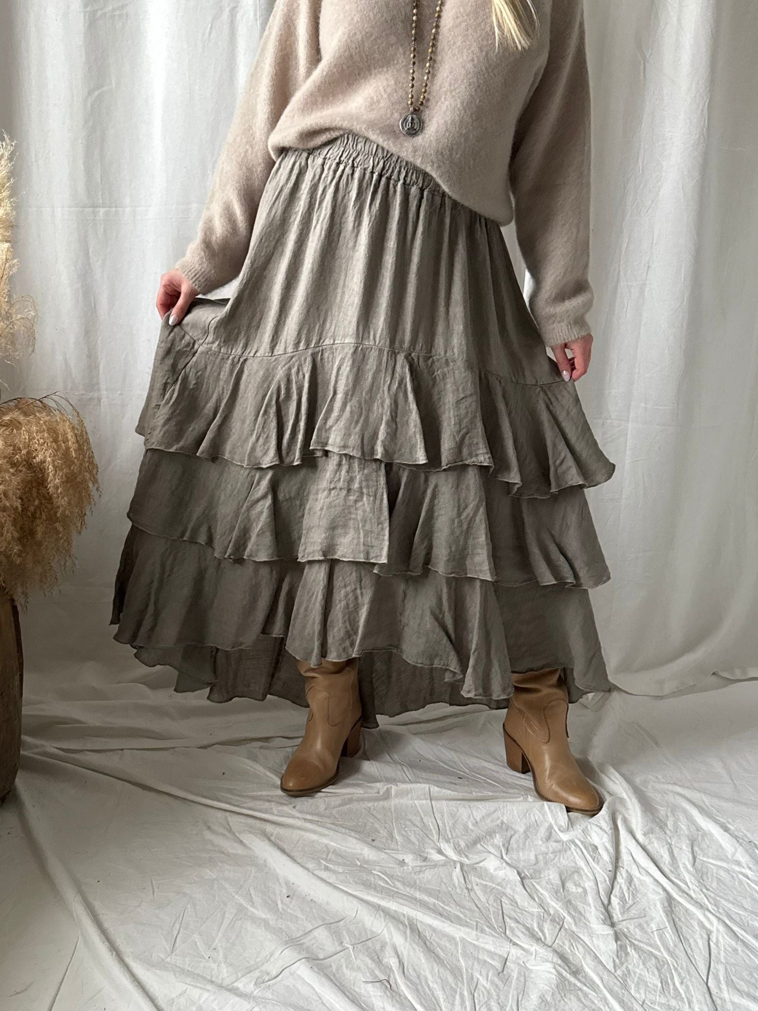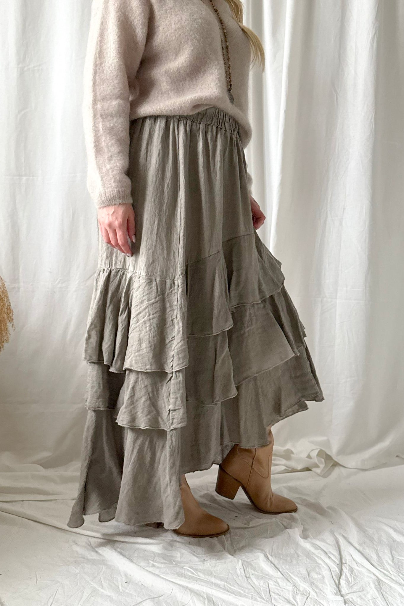 Kauniisti laskeutuva pellavahame, jossa hameen frillat on ommeltu kolmeen kerrokseen. Kauniit frillat antavat hameelle volyymiä ja liehuvan vaikutelman. Hameen vyötärössä tukeva joustovyötärö.
