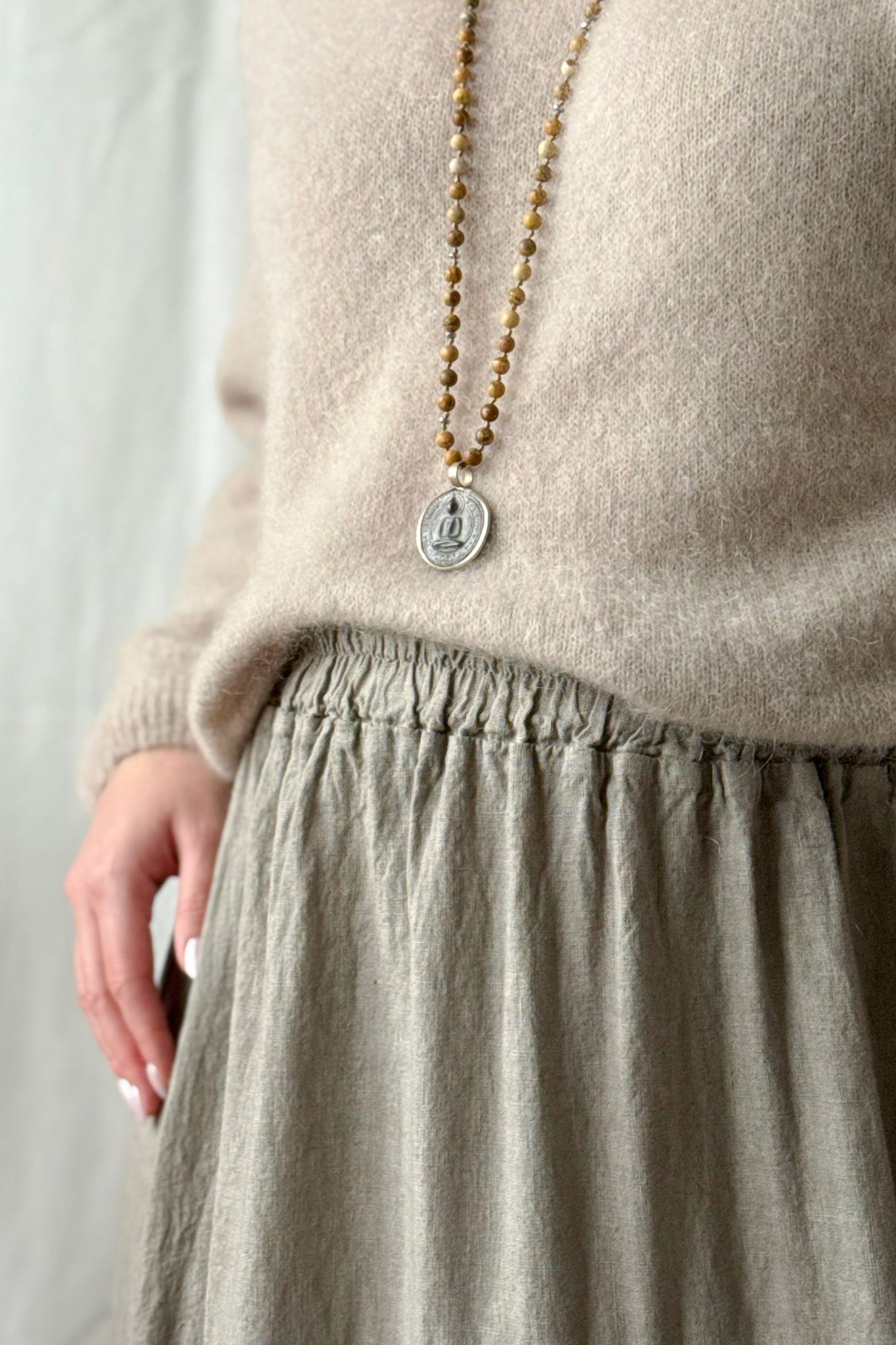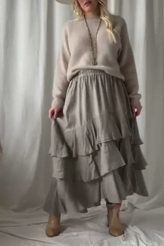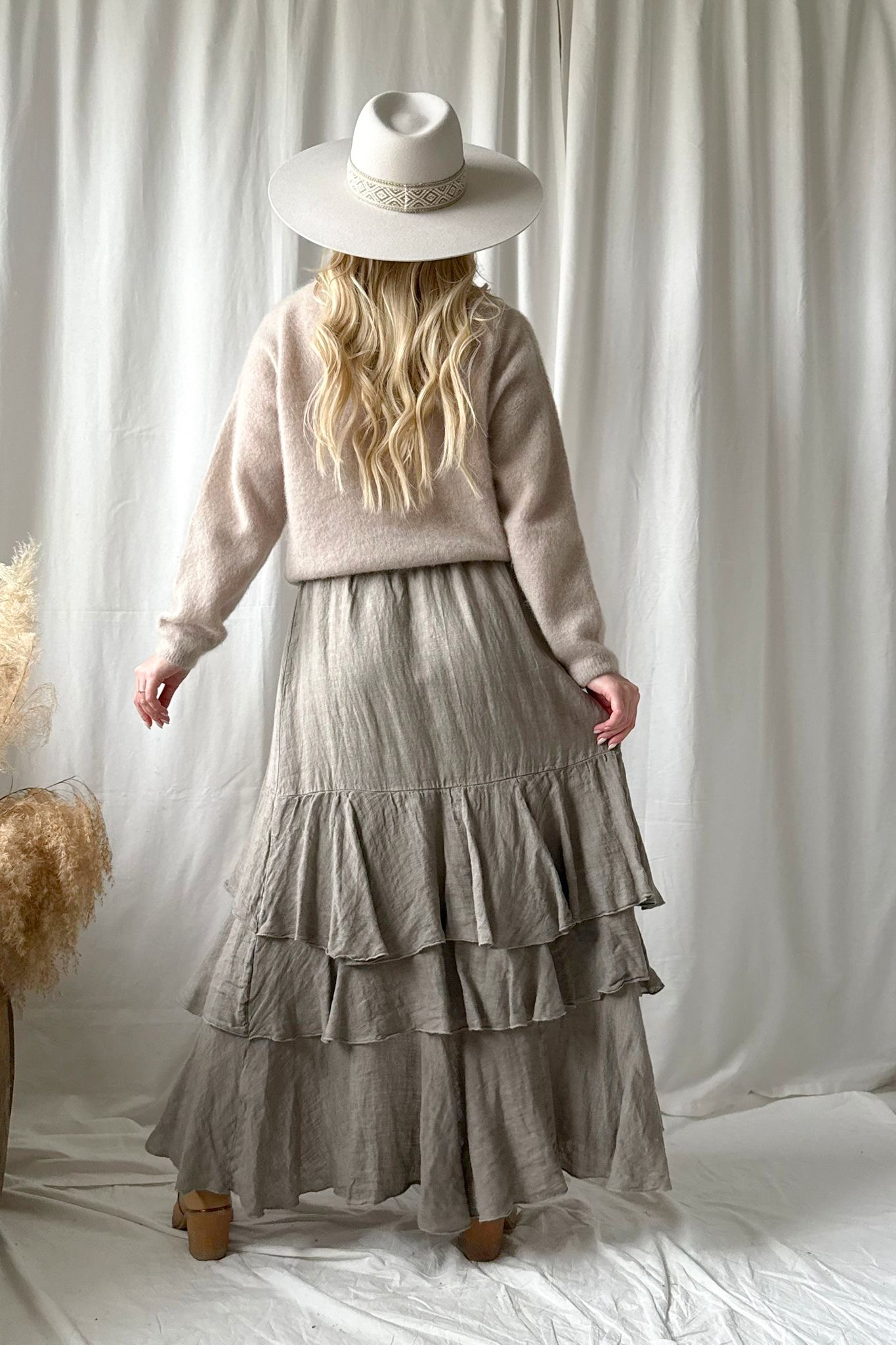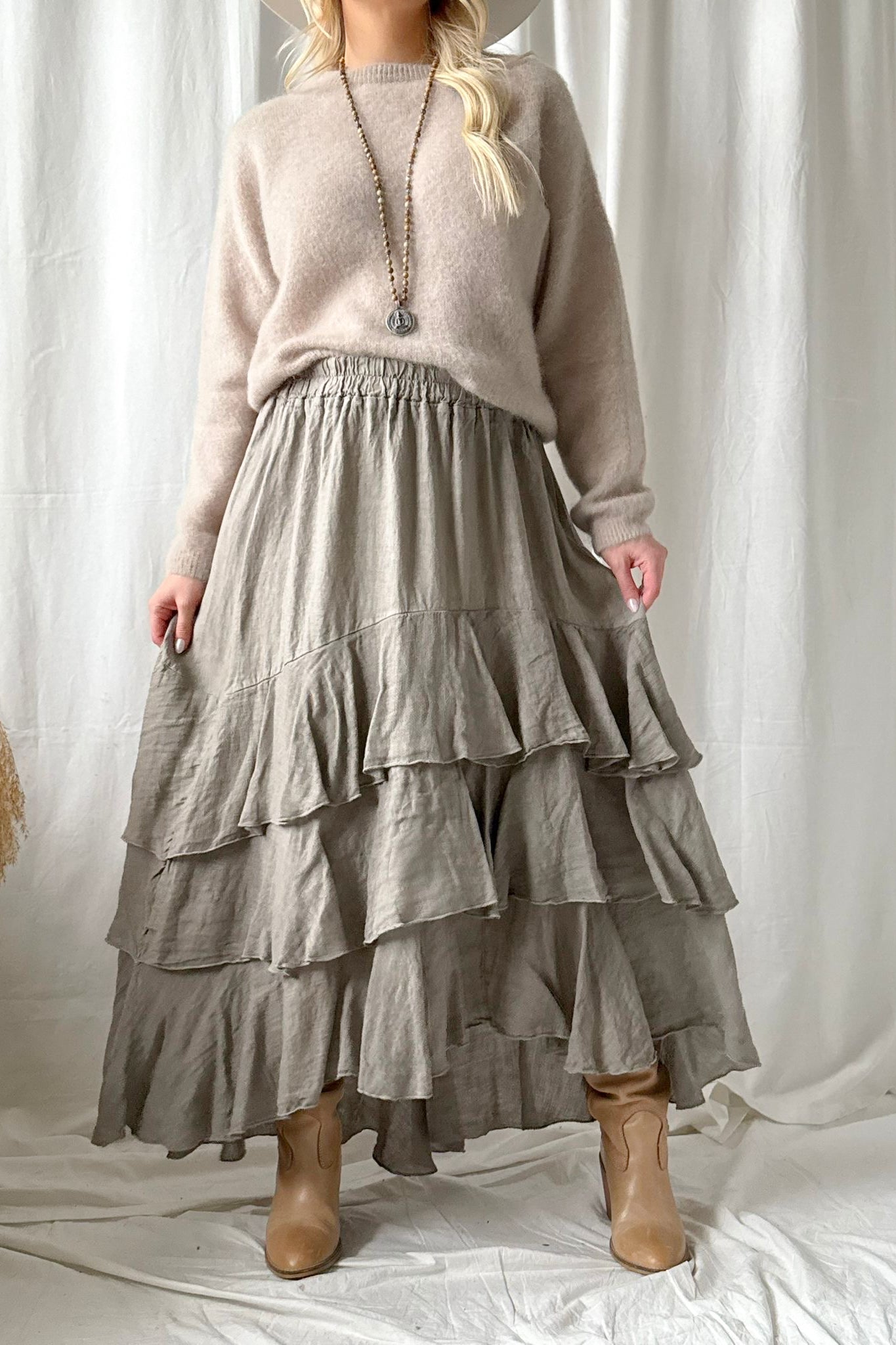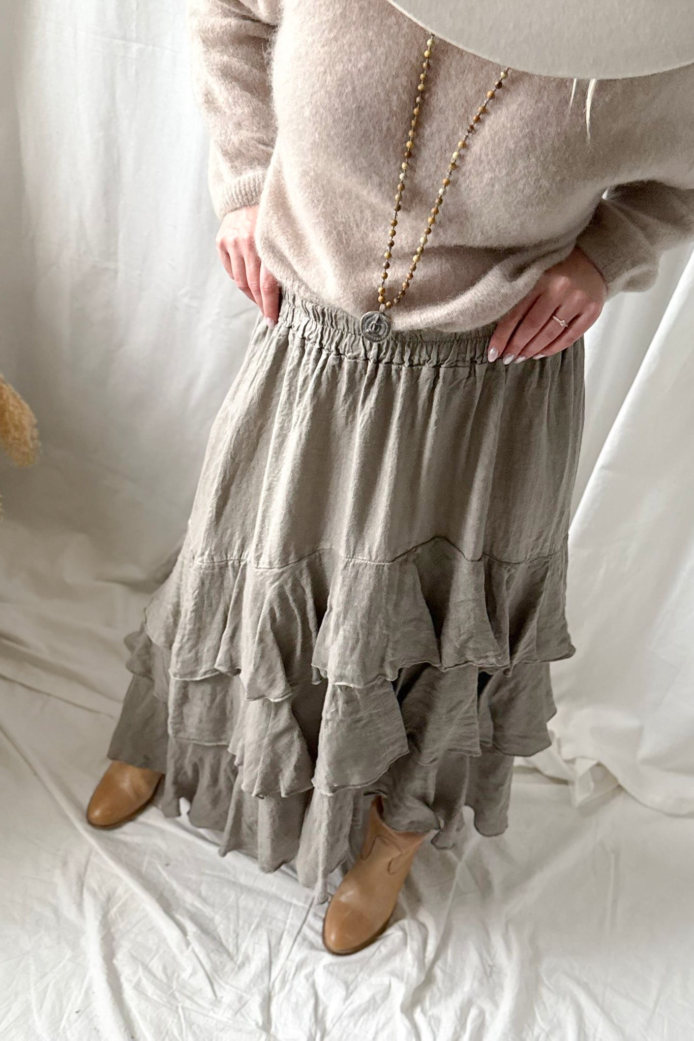 Kauniisti laskeutuva pellavahame, jossa hameen frillat on ommeltu kolmeen kerrokseen. Kauniit frillat antavat hameelle volyymiä ja liehuvan vaikutelman. Hameen vyötärössä tukeva joustovyötärö.