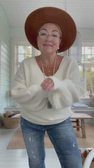 Ylellisen tuntuinen ja kutisematon neule, jossa runsaasti alpakanvillaa. Venyvä ja joustava, pussimaiset hihat ja riittävästi mittaa hihoissa, pituudessa pidemmillekin.