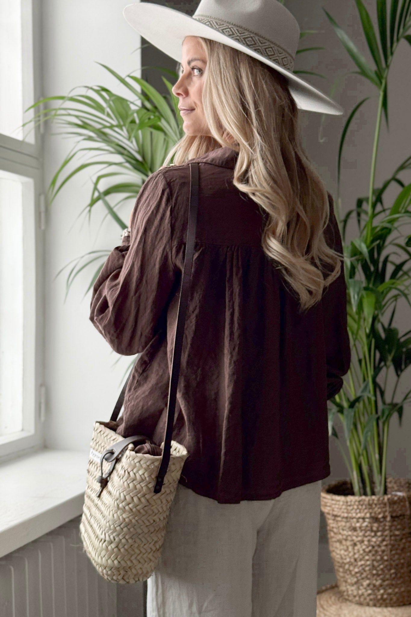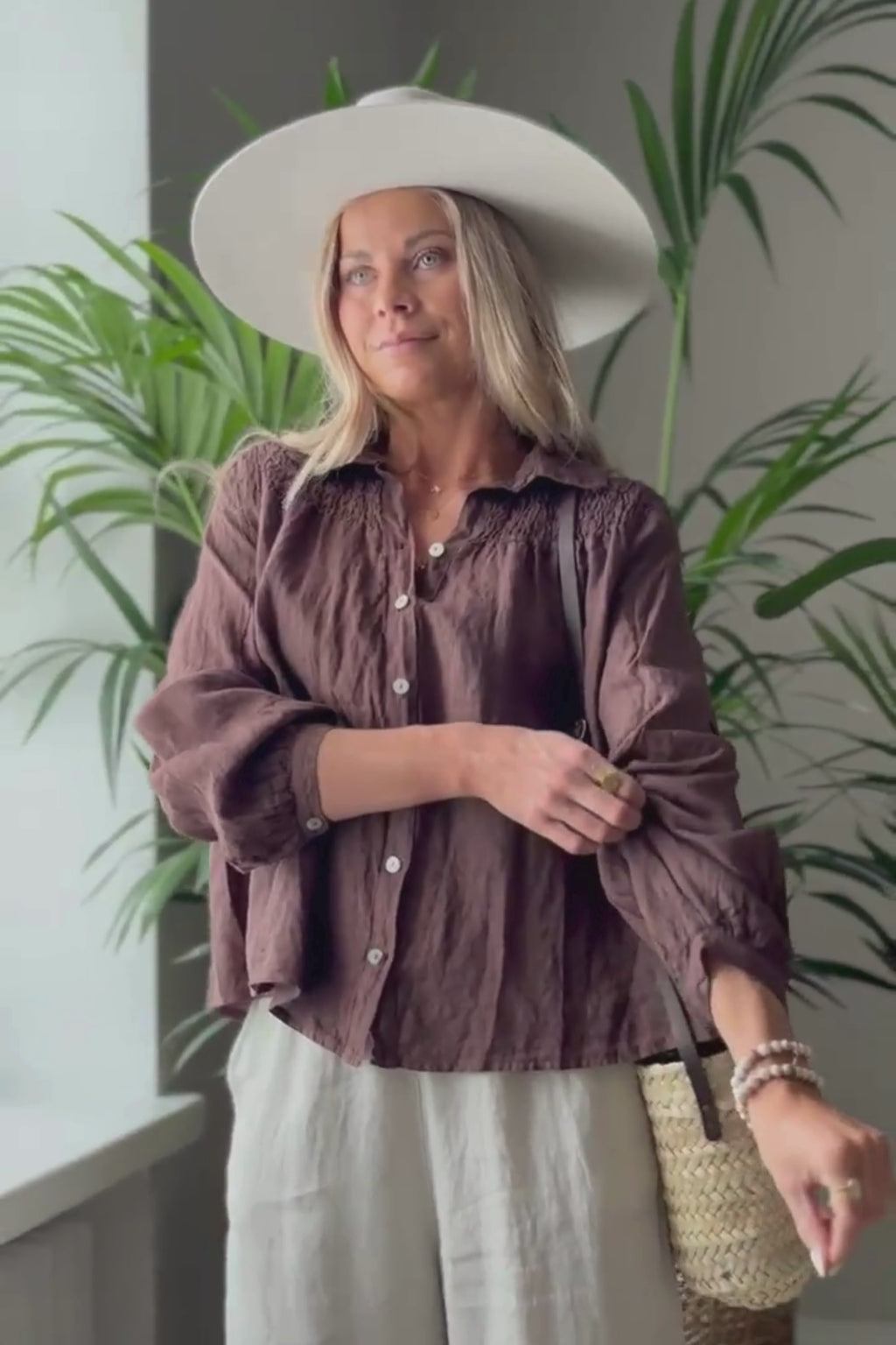 Väljänmallinen lyhyt pellavapaita, jossa on kaulukset ja edessä kaunis rypytysyksityiskohta. Kokopitkät hihat tuovat malliin tasapainoa, ja helmiäisnapitus edessä sekä hihansuissa viimeistelee ilmeen. Selkäpuolen poikkisauma ja hillitty frilladetalji lisäävät paitaan kevyttä ilmettä ja rakennetta.