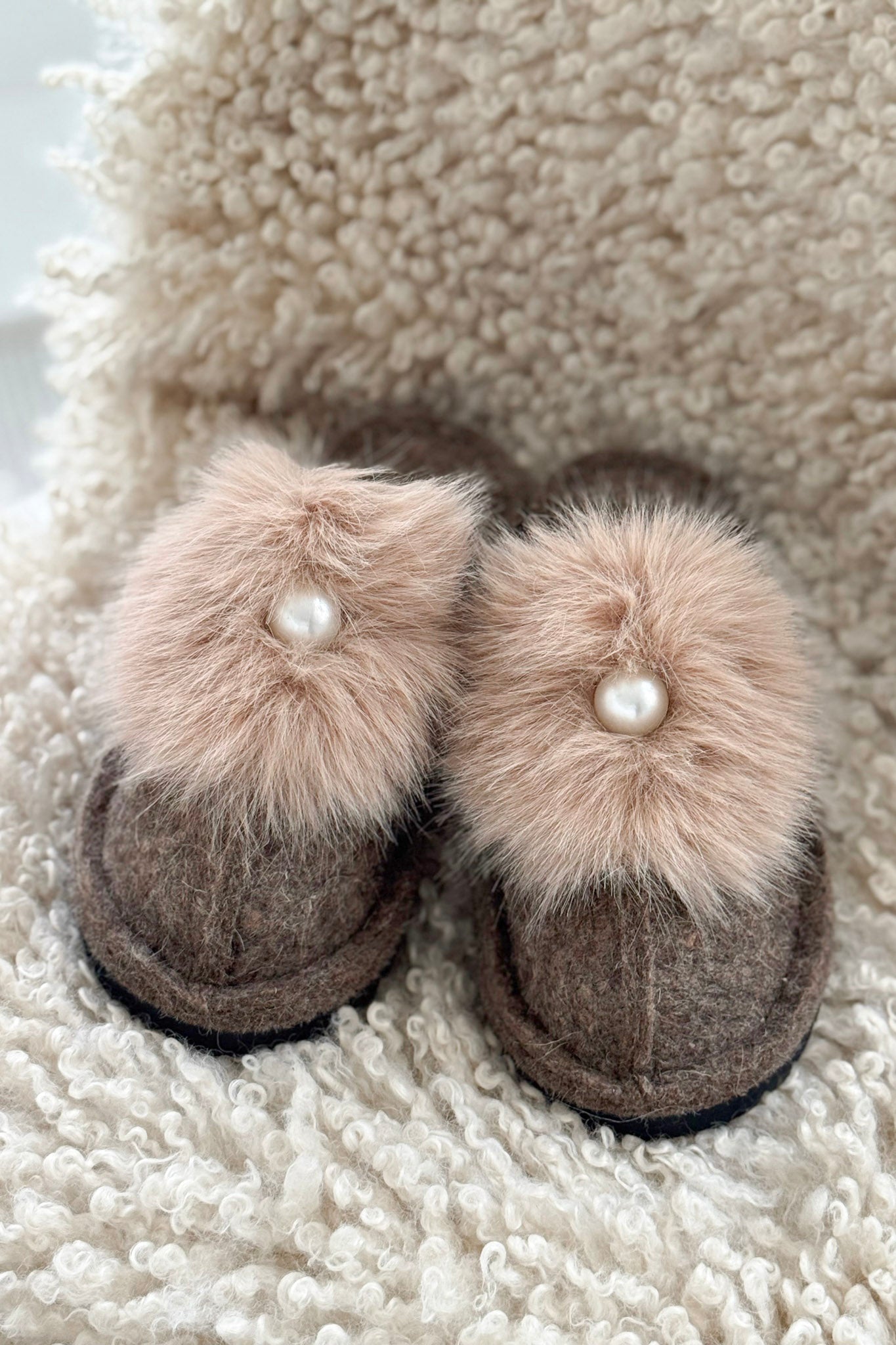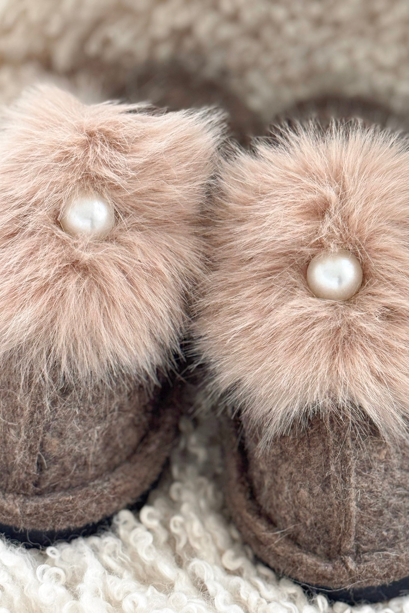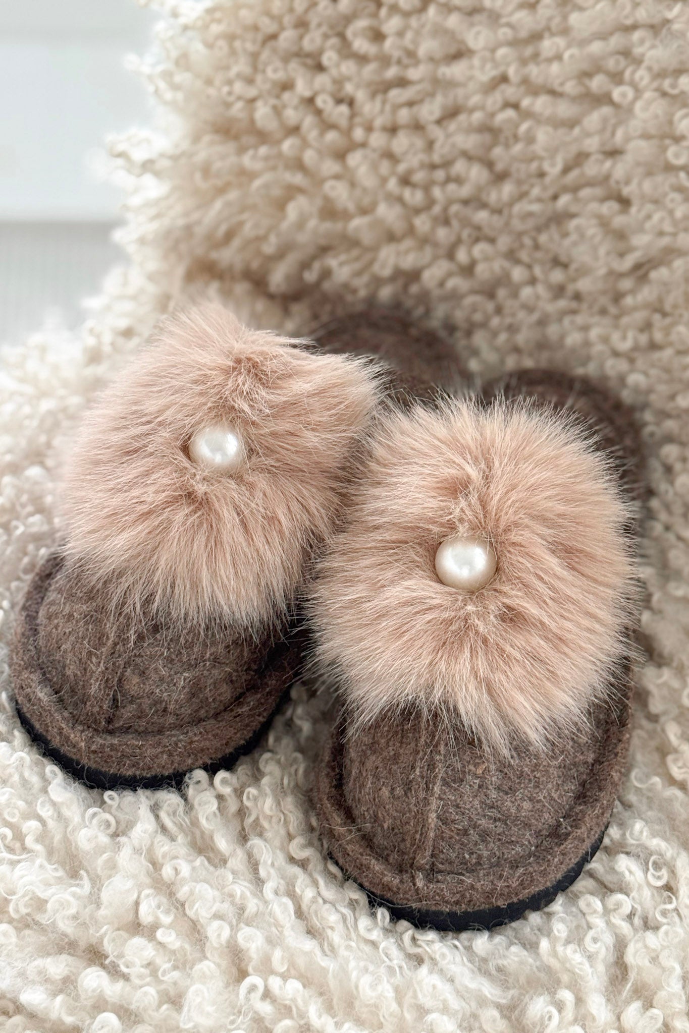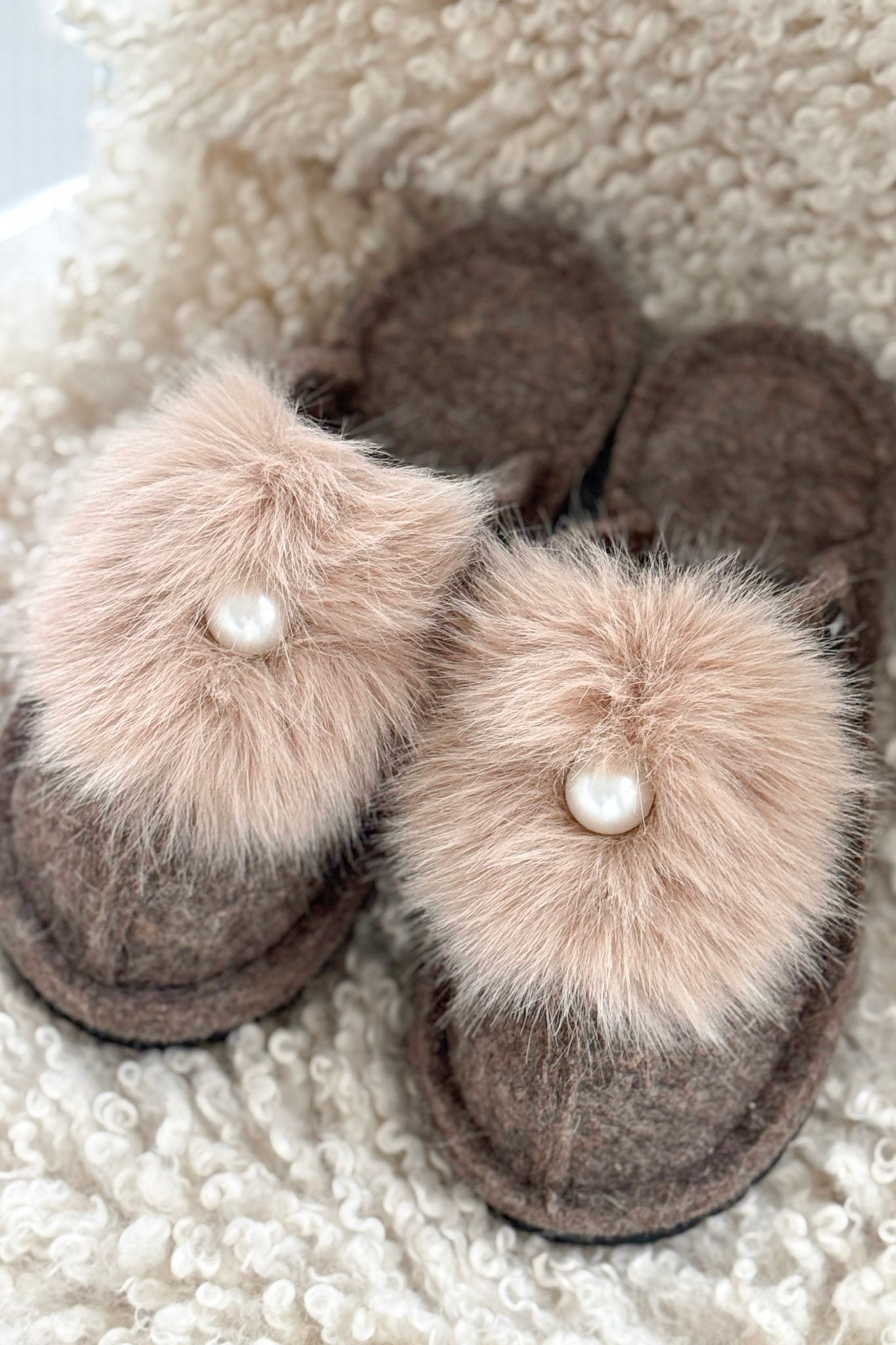 Kauniit ja pehmeät beiget huopatossut tuovat lämpöä ja mukavuutta joka askeleeseen. Suomessa valmistetut tossut ovat 100 % villaa, mikä tekee niistä kestävät ja luonnollisesti hengittävät. Tekoturkistupsu ja koristehelmi antavat tossuille suloisen ilmeen, ja paksu pohjallinen tuo lisää pehmeyttä sekä sopii lyhytaikaiseen ulkokäyttöön. Tyylikäs, huolellinen viimeistely tekee näistä tossuista ihanan käytännöllisen ja kauniin valinnan arkeen.