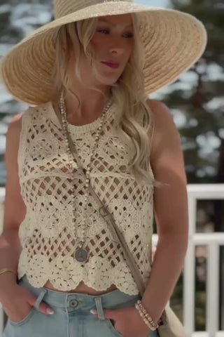 Ihanan pehmeä puuvillaneulostoppi Hanko Beach Pop-up valikoimasta. Topilla on leveät olkaimet ja pyöreä pääntie.