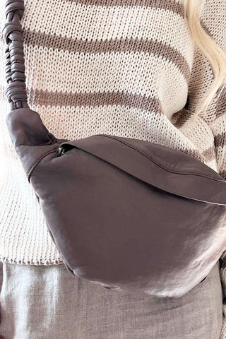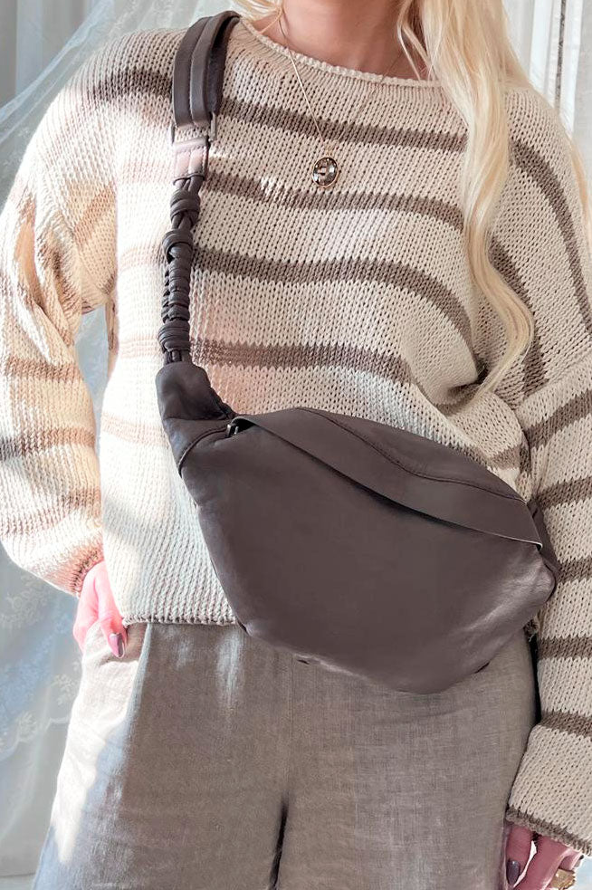 Depechen vyölaukku, joka on koristeltu kaunein punoksin. Laukun hihna on säädettävä. Laukun sisällä on yksi avotasku ja yksi vetoketjullinen tasku.