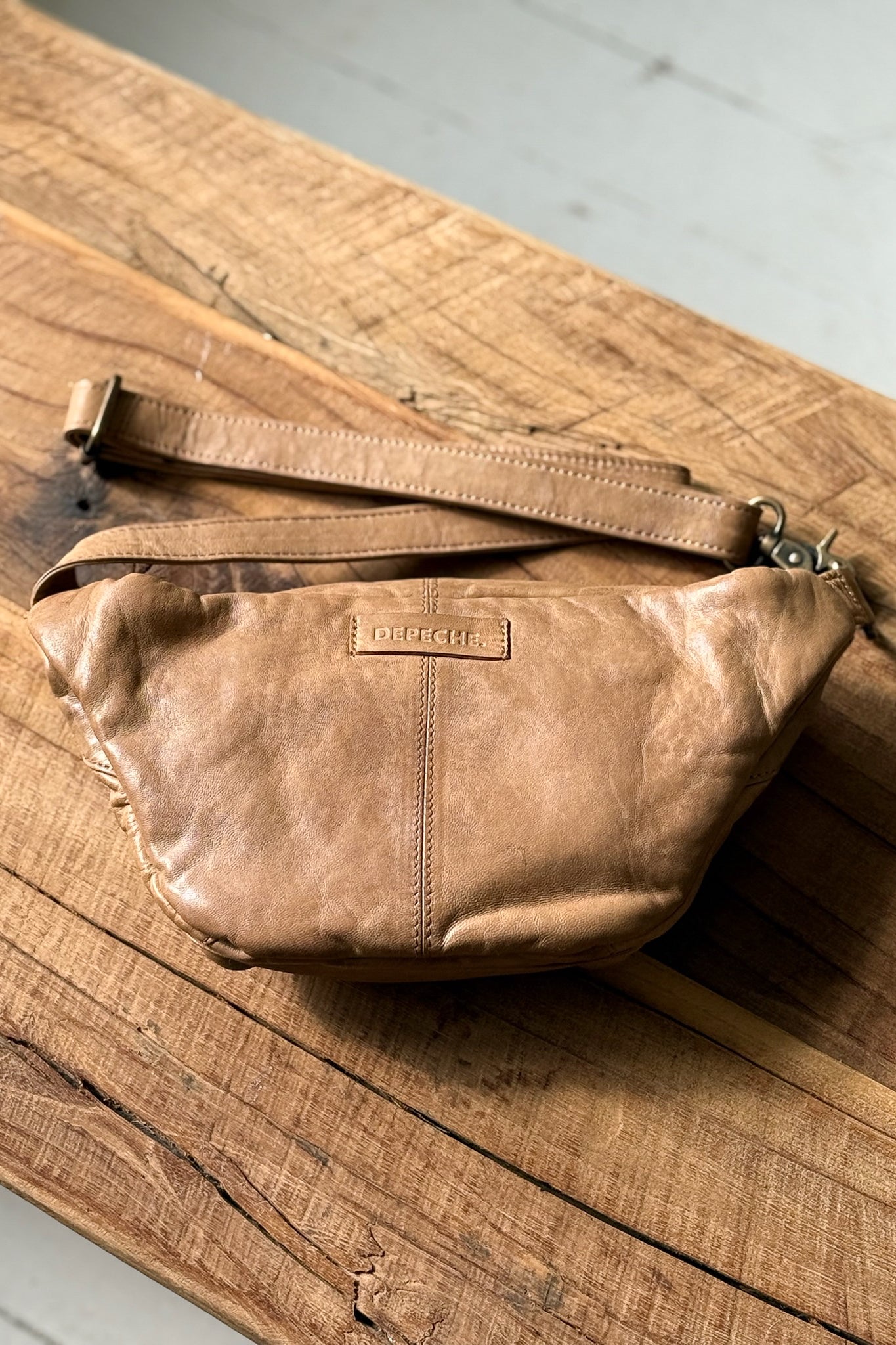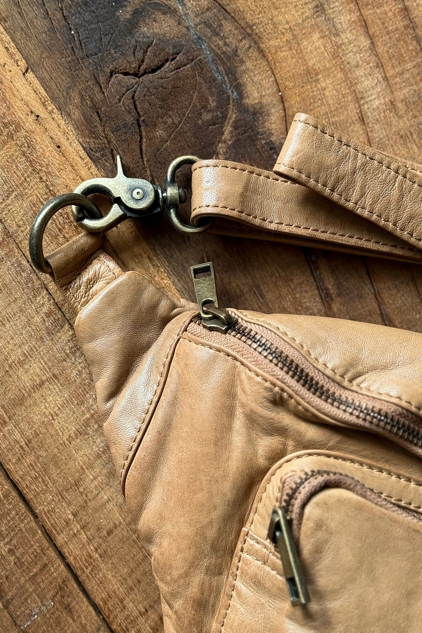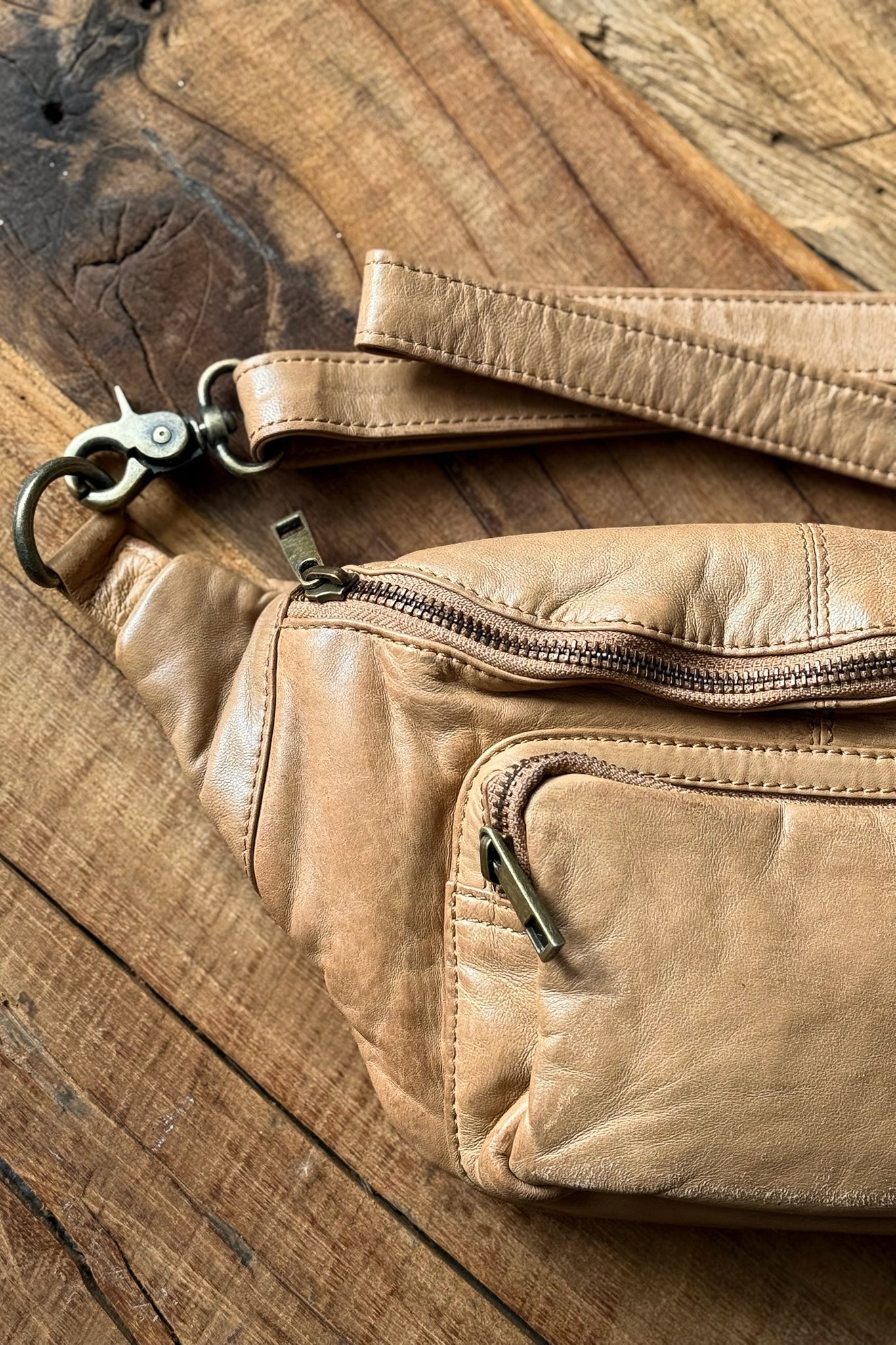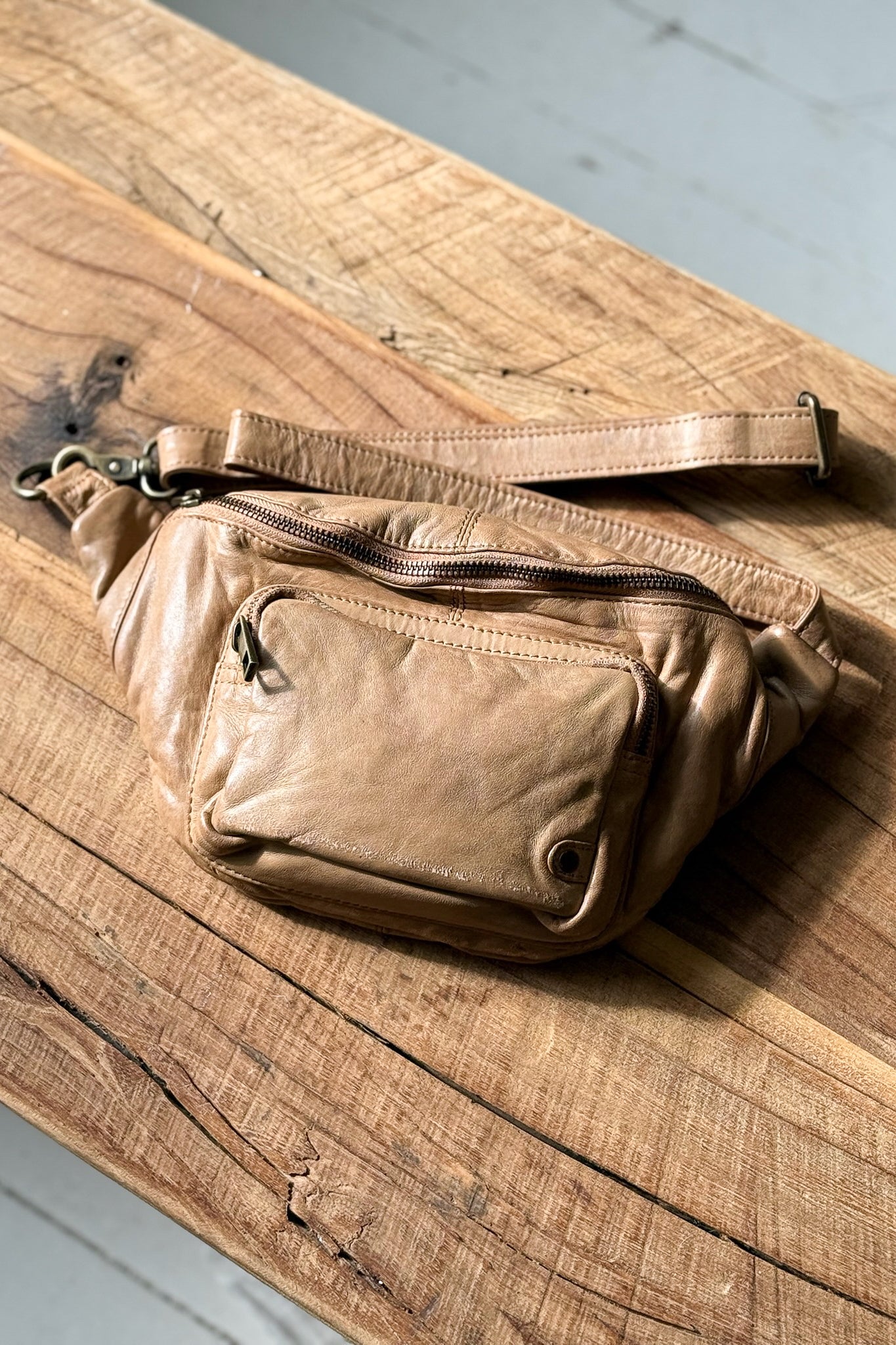 Rinnan yli trendikkäästi puettava vyölaukku. Laukku on laadukasta, pehmeää nahkaa. Vetoketjutasku edessä, säädettävä olkahihna. Sisäpuolella vuori ja sisätasku, jonne menevät turvallisesti vaikkapa maksukortit ja avaimet. Edessä on vielä kätevä pikkutasku.