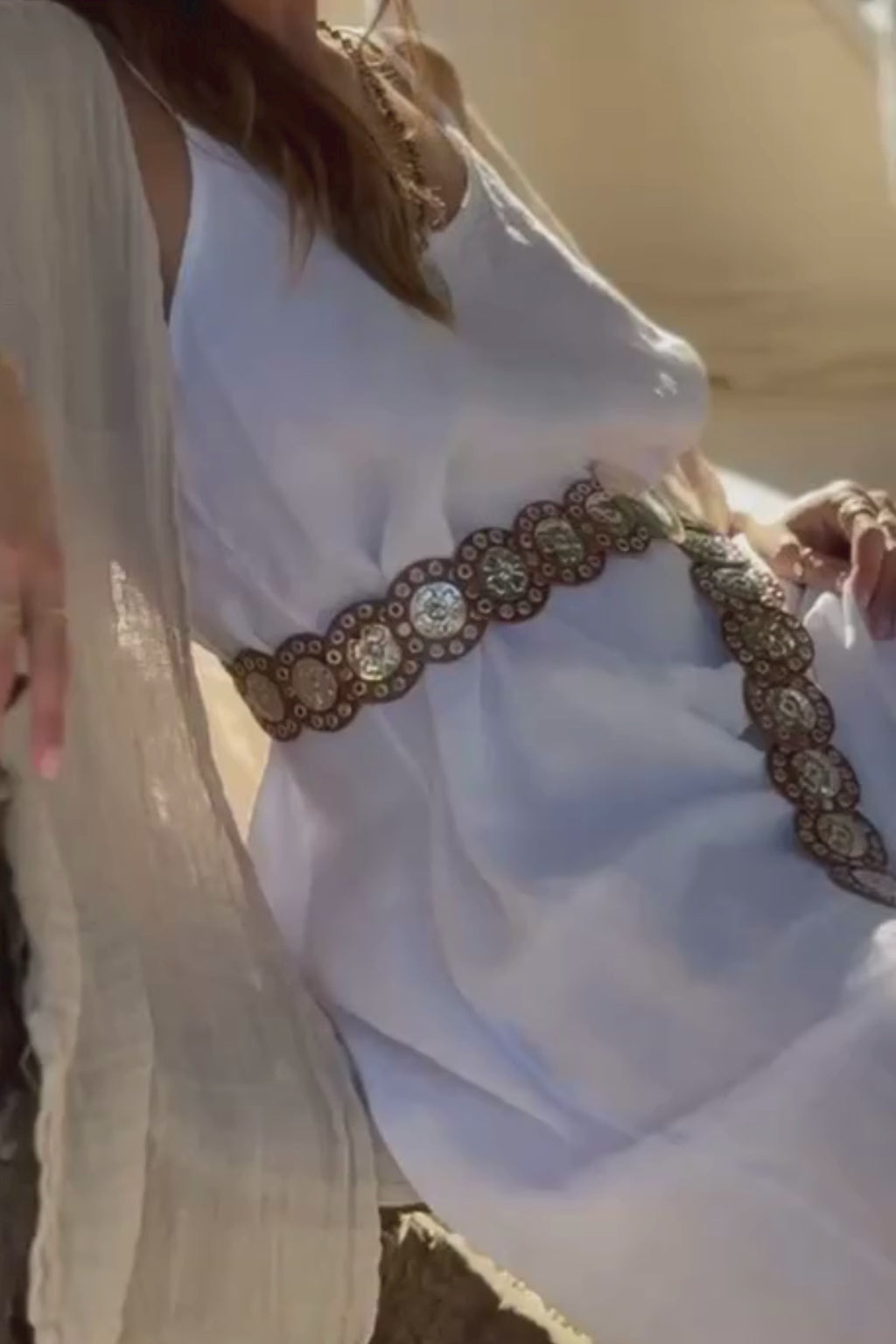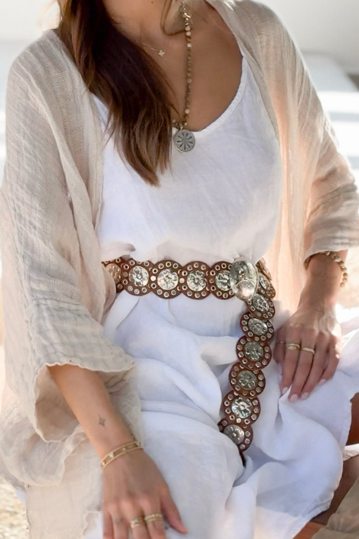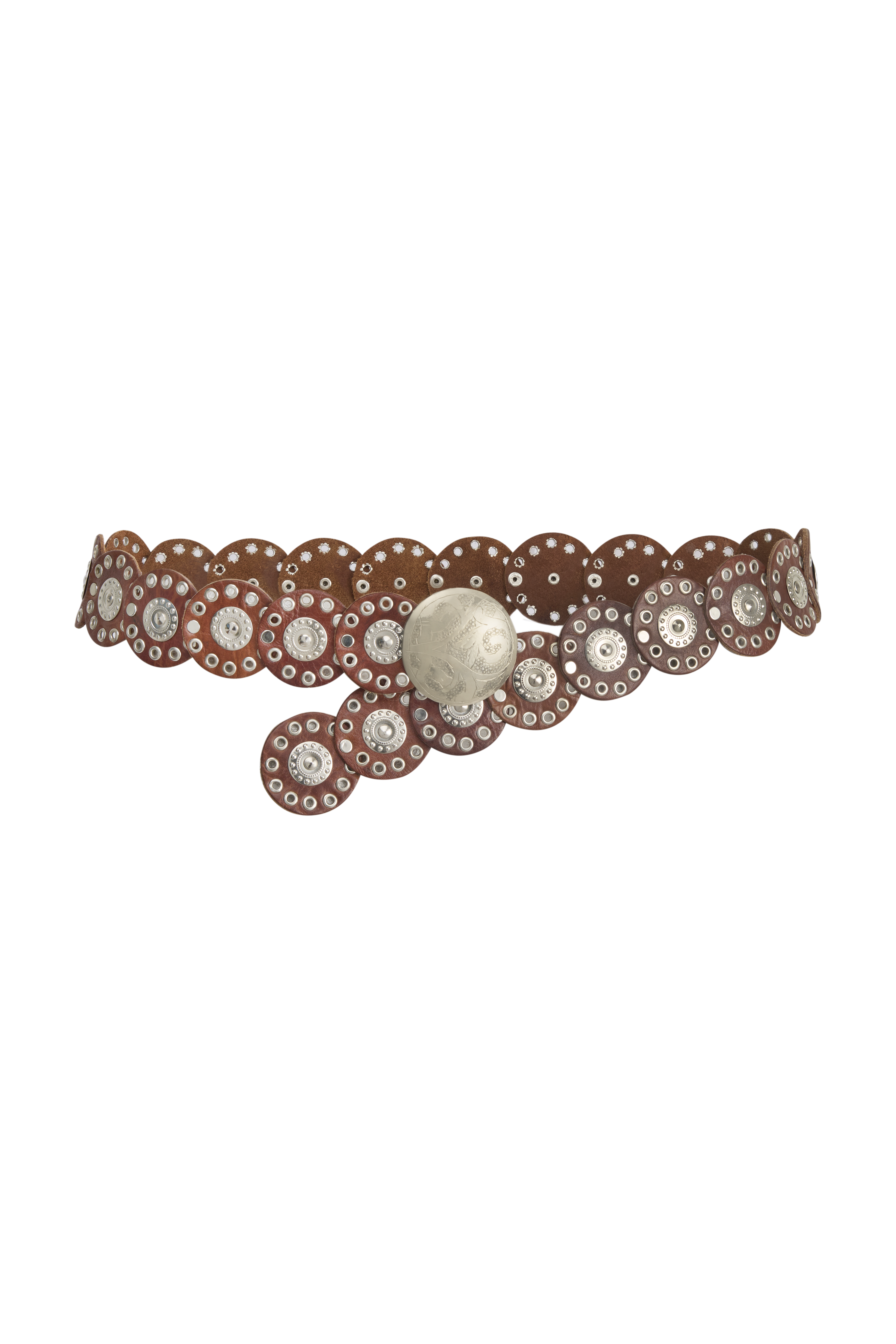 Koristeellinen nahkavyö, jossa on pyöreät metallikoristeet ja näyttävä solki. Vyön soljen voi kiinnittää mihin tahansa vyön metallireikään, mikä tekee vyöstä helposti itselleen säädettävän ja monikäyttöisen. Ajaton ja boheemi design sopii täydellisesti mekkojen, tunikoiden ja farkkujen pariksi sekä arkeen että juhlavampiin kokonaisuuksiin.