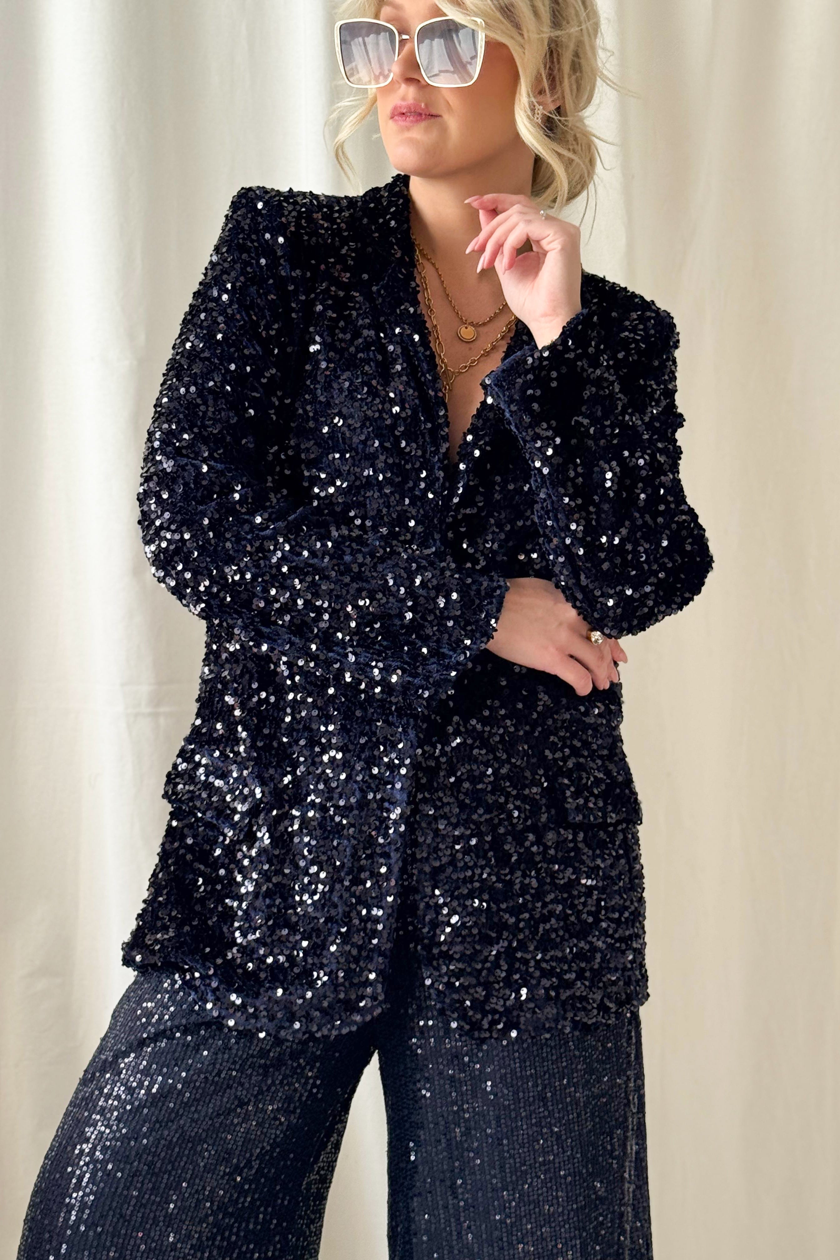 It's time to glow! Ylellisesti istuva ja säkenöivä paljettibleiseri, jossa edessä yksi nappi sekä koristetaskut. Sisäpuolella pehmeä vuorikangas ja olkapäissä kevyet toppaukset.