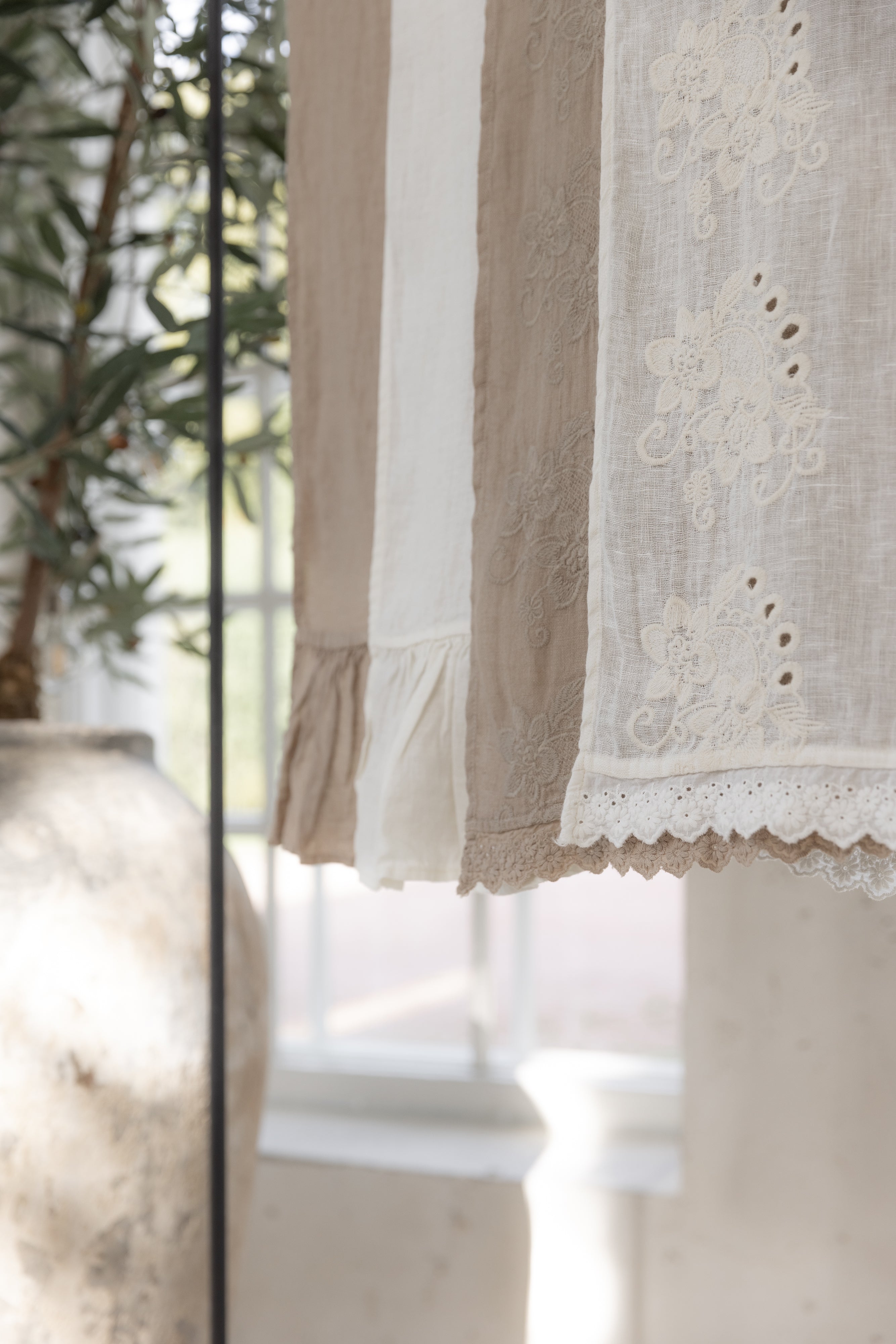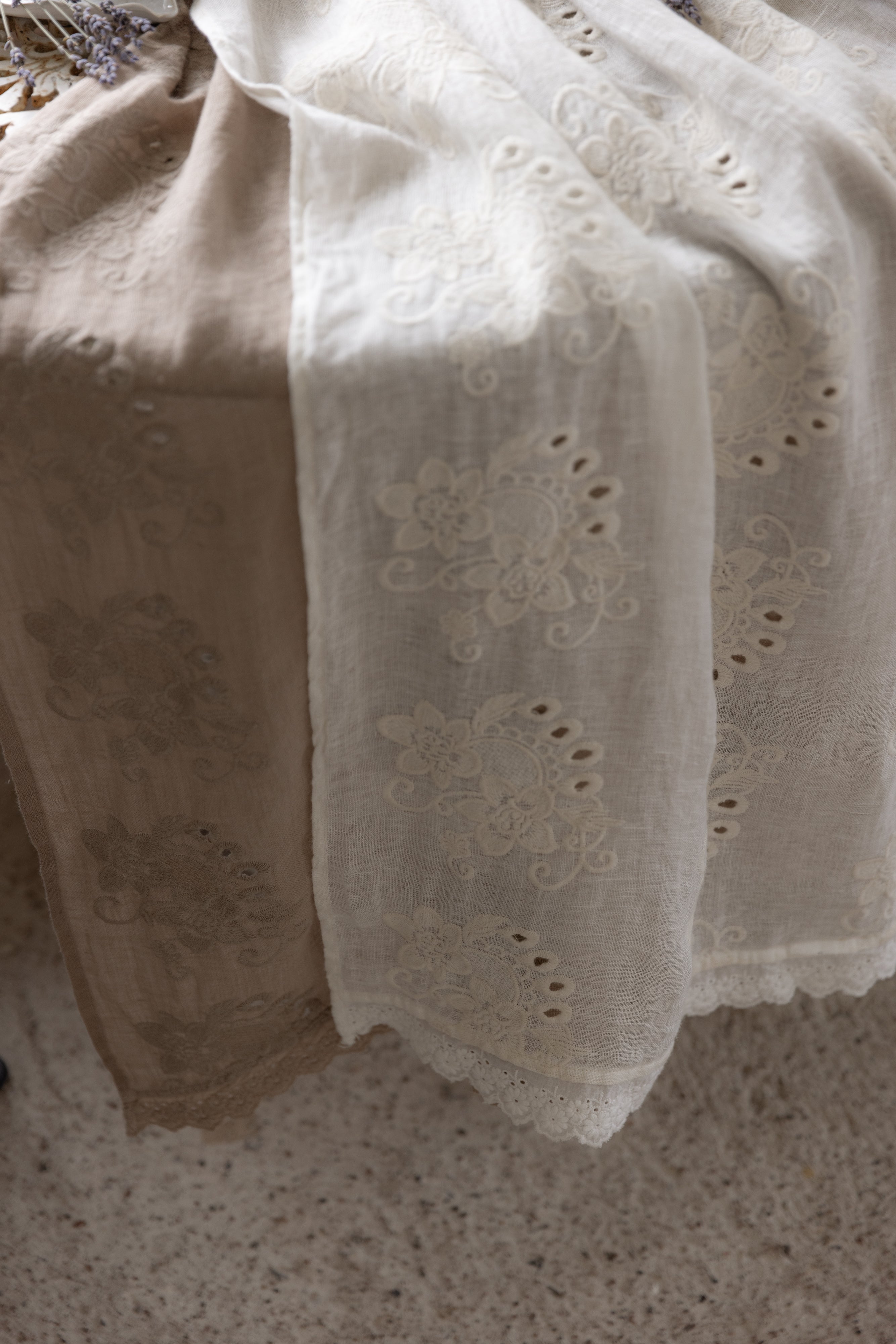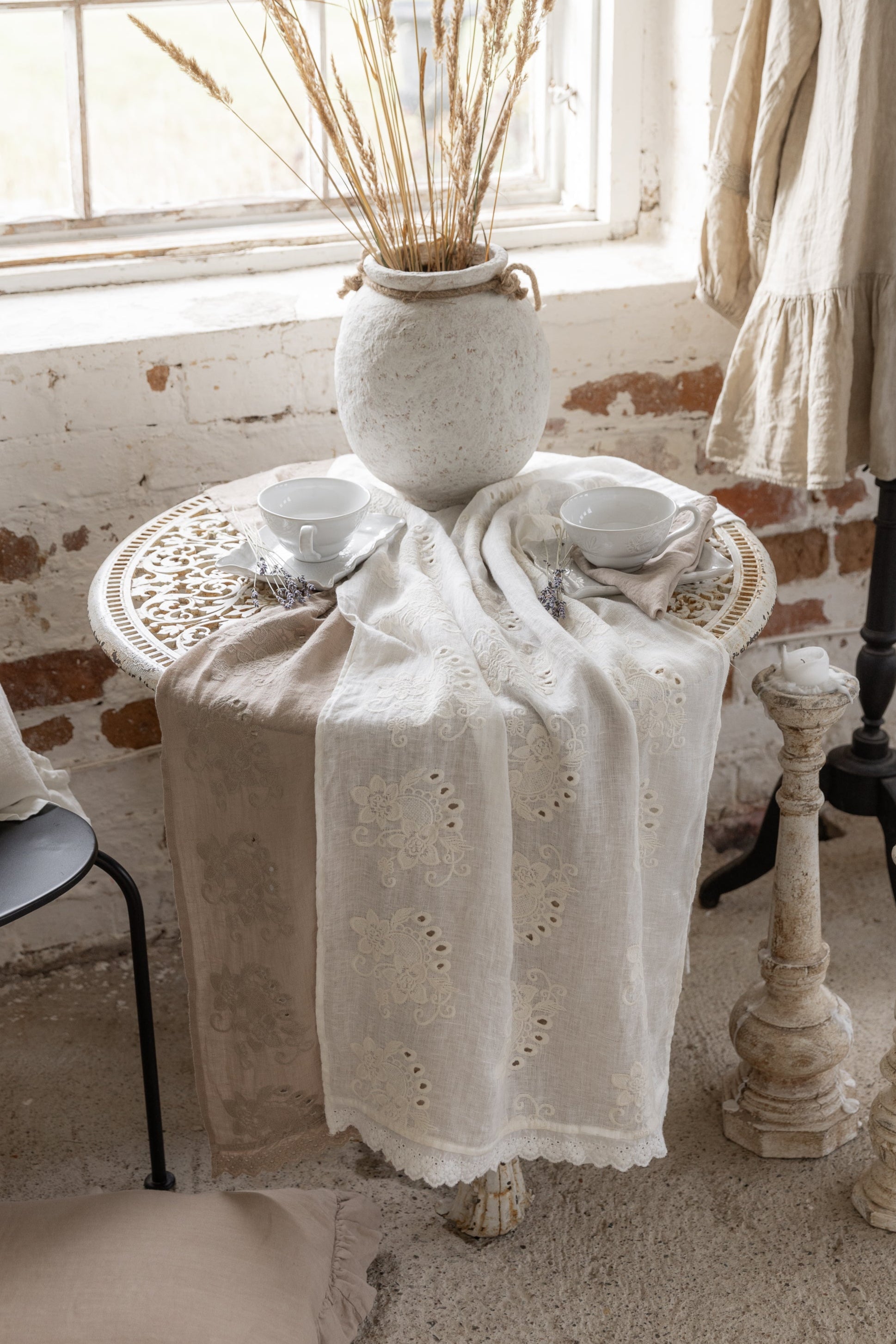Bohemiana Home -malliston Brocante-kaitaliina hurmaa ajattomalla eleganssillaan ja ranskalaisella vintage-viehätyksellään. 100 % pellavasta valmistettu kaitaliina on koristeltu upealla pitsibrodeerauksella, joka luo kattaukseen romanttista tunnelmaa ja hienostuneisuutta.