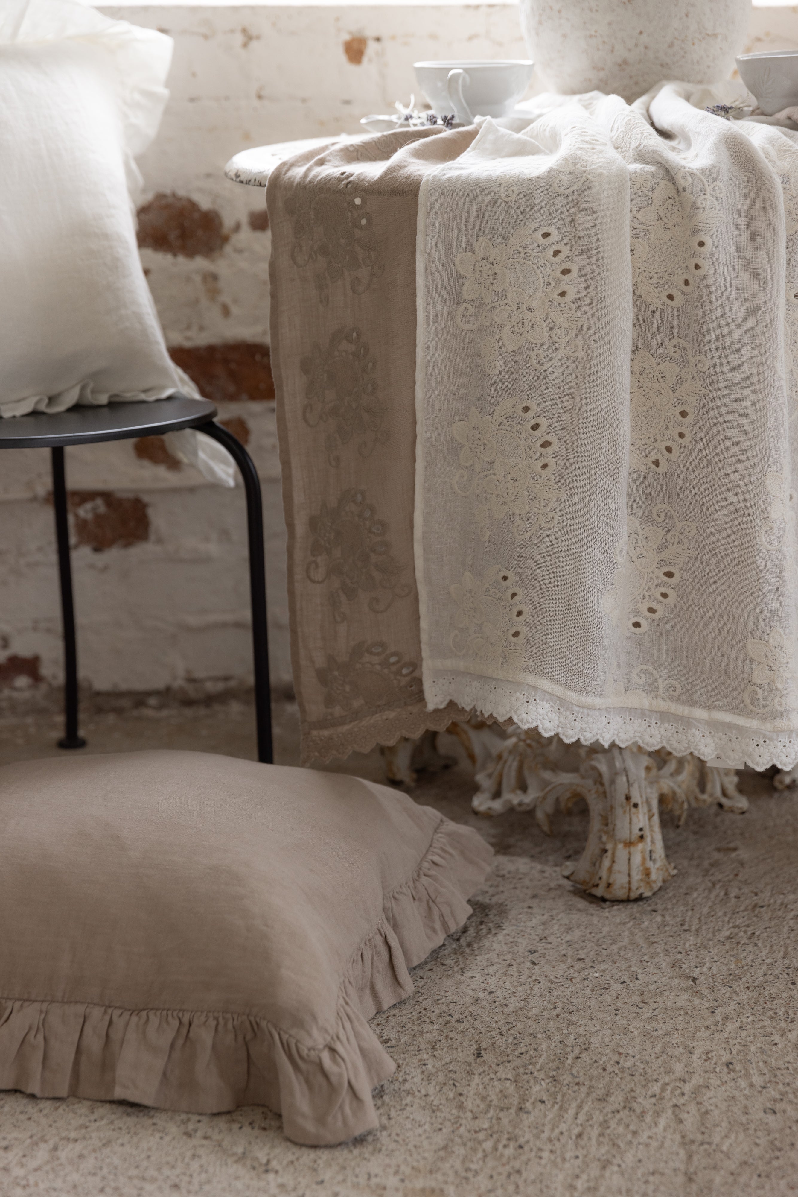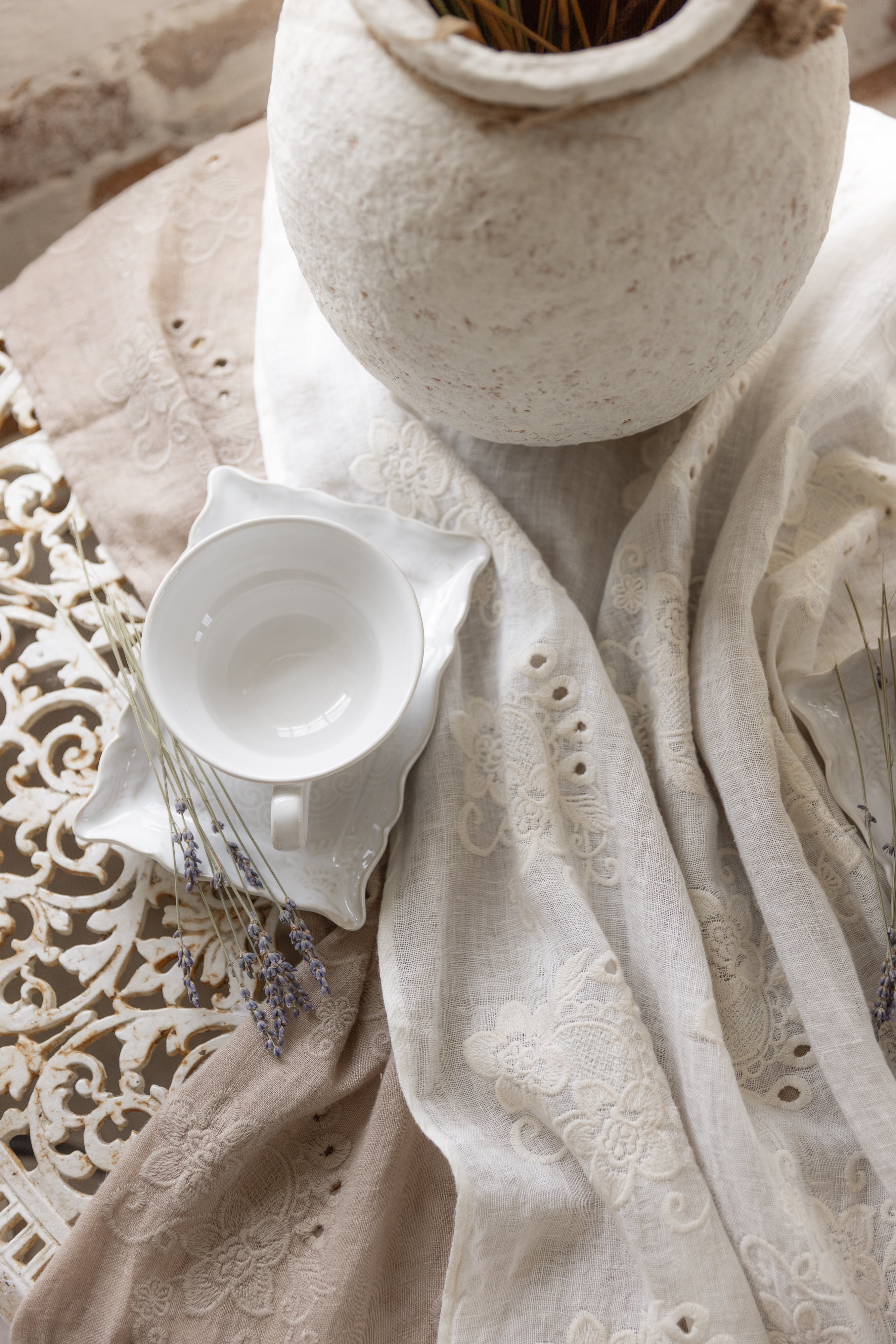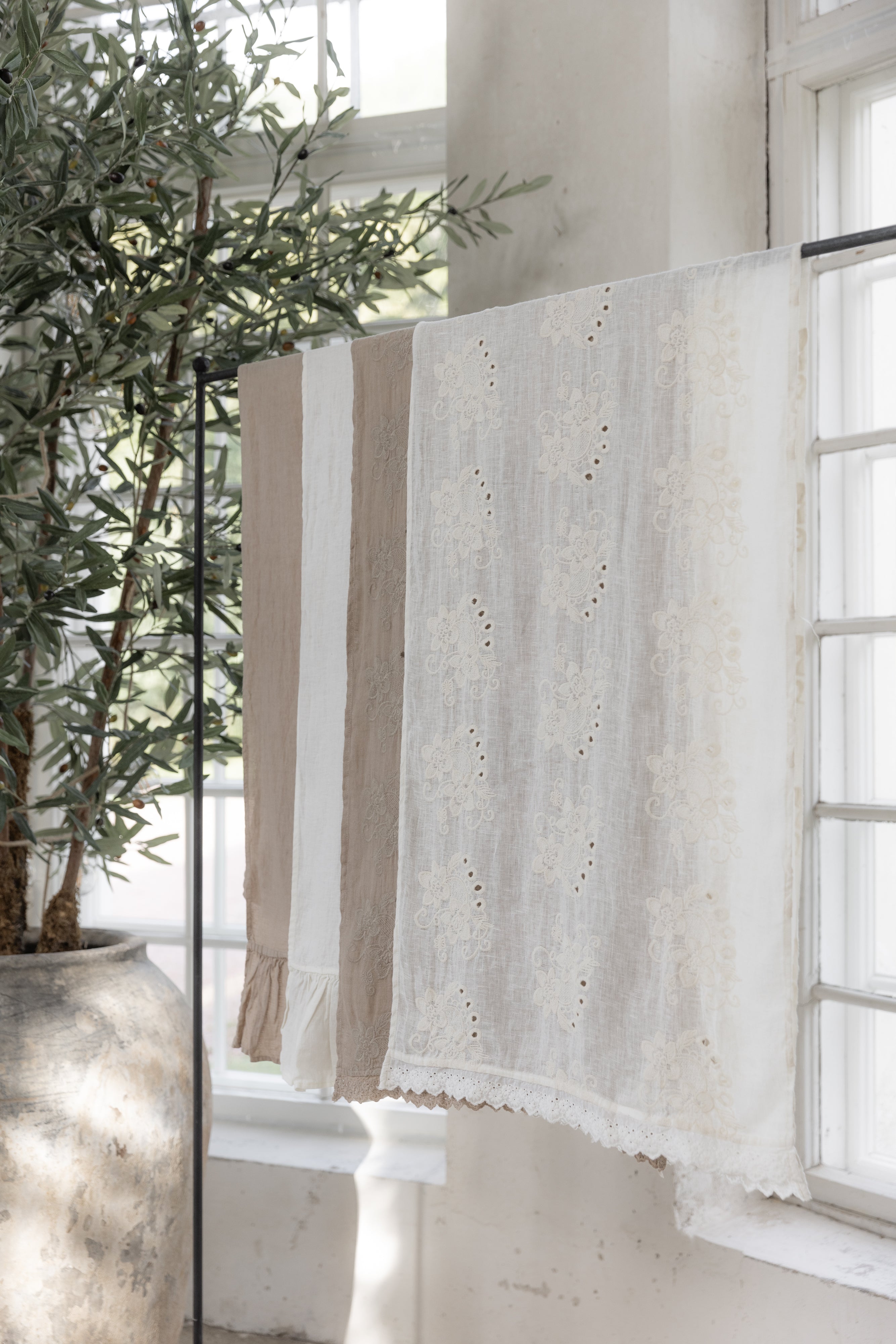Bohemiana Home -malliston Brocante-kaitaliina hurmaa ajattomalla eleganssillaan ja ranskalaisella vintage-viehätyksellään. 100 % pellavasta valmistettu kaitaliina on koristeltu upealla pitsibrodeerauksella, joka luo kattaukseen romanttista tunnelmaa ja hienostuneisuutta.