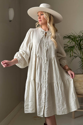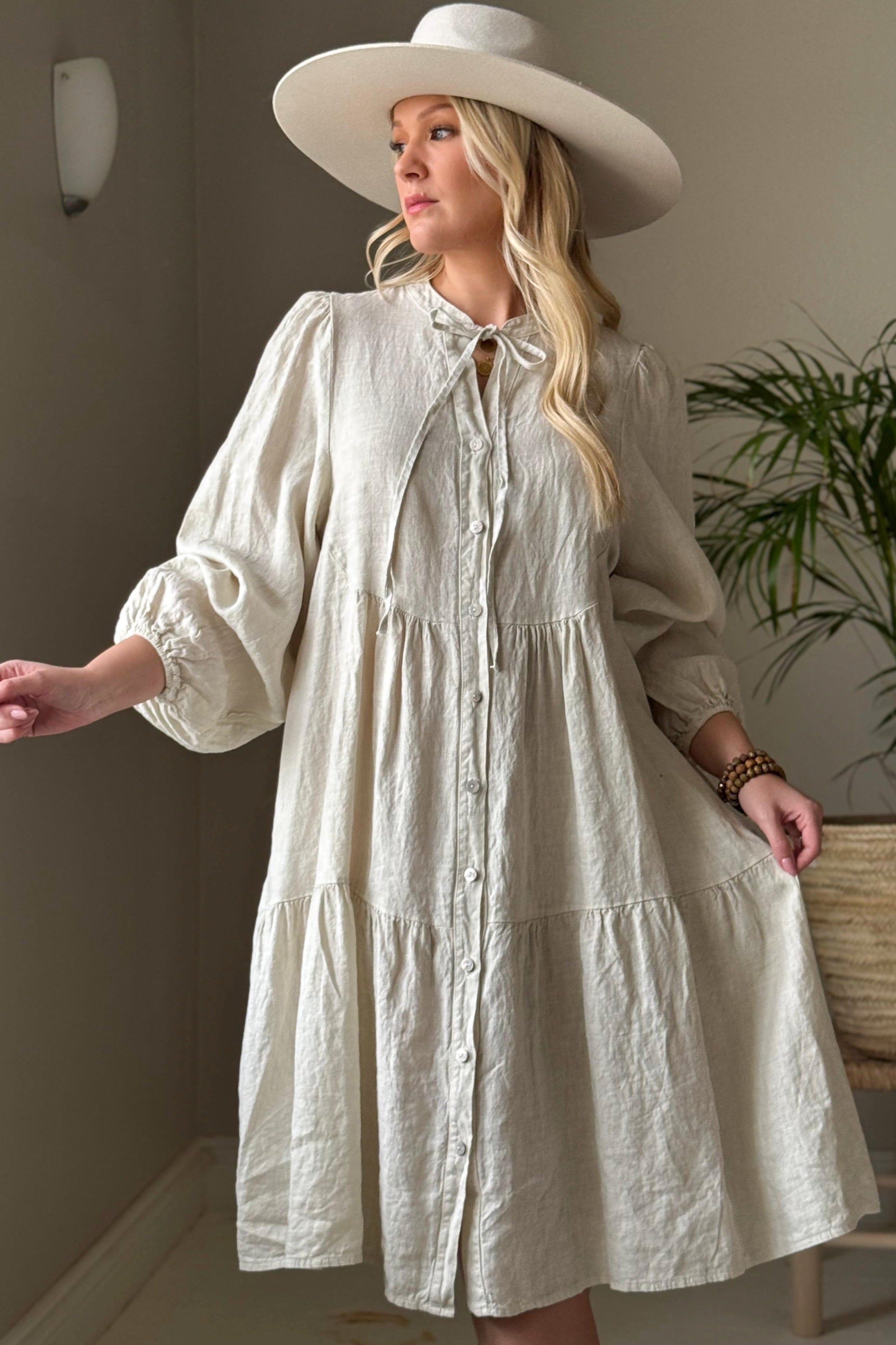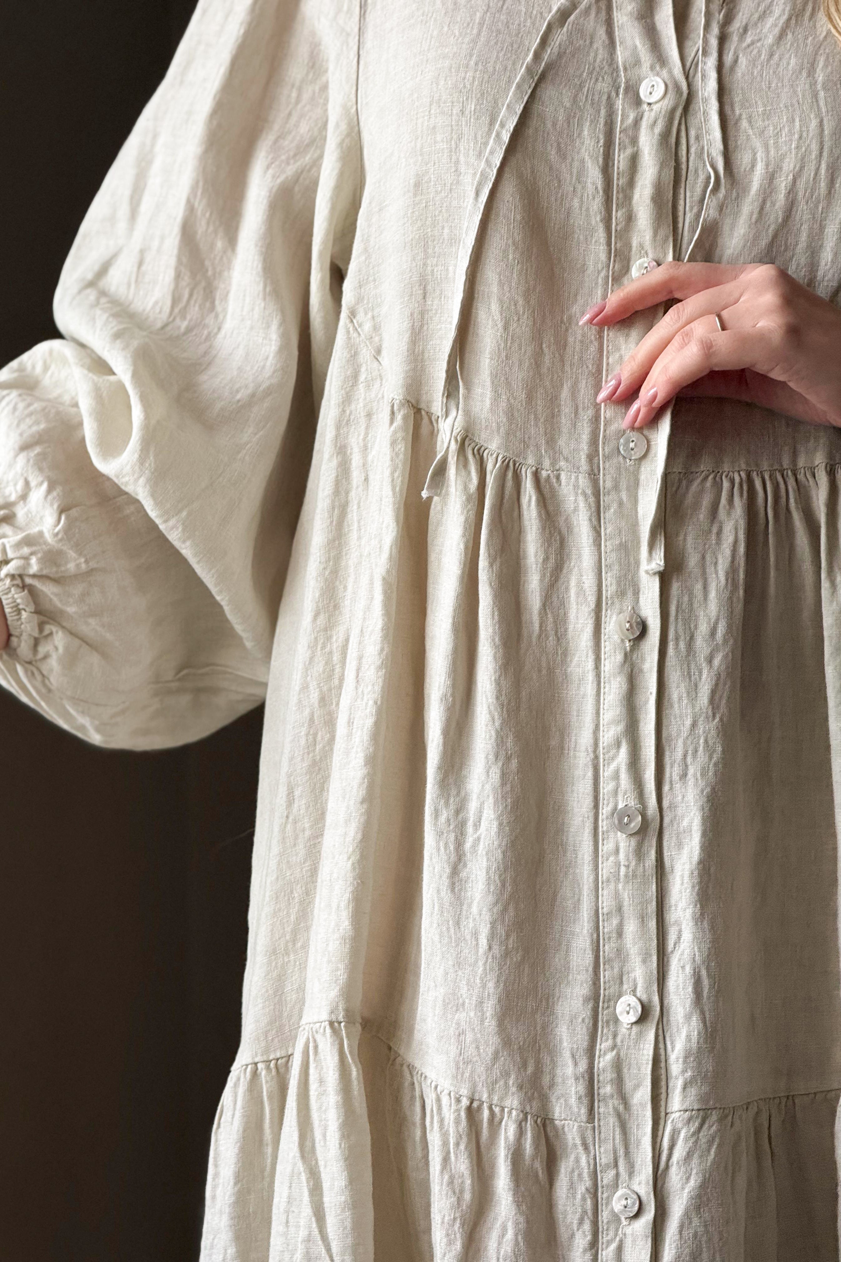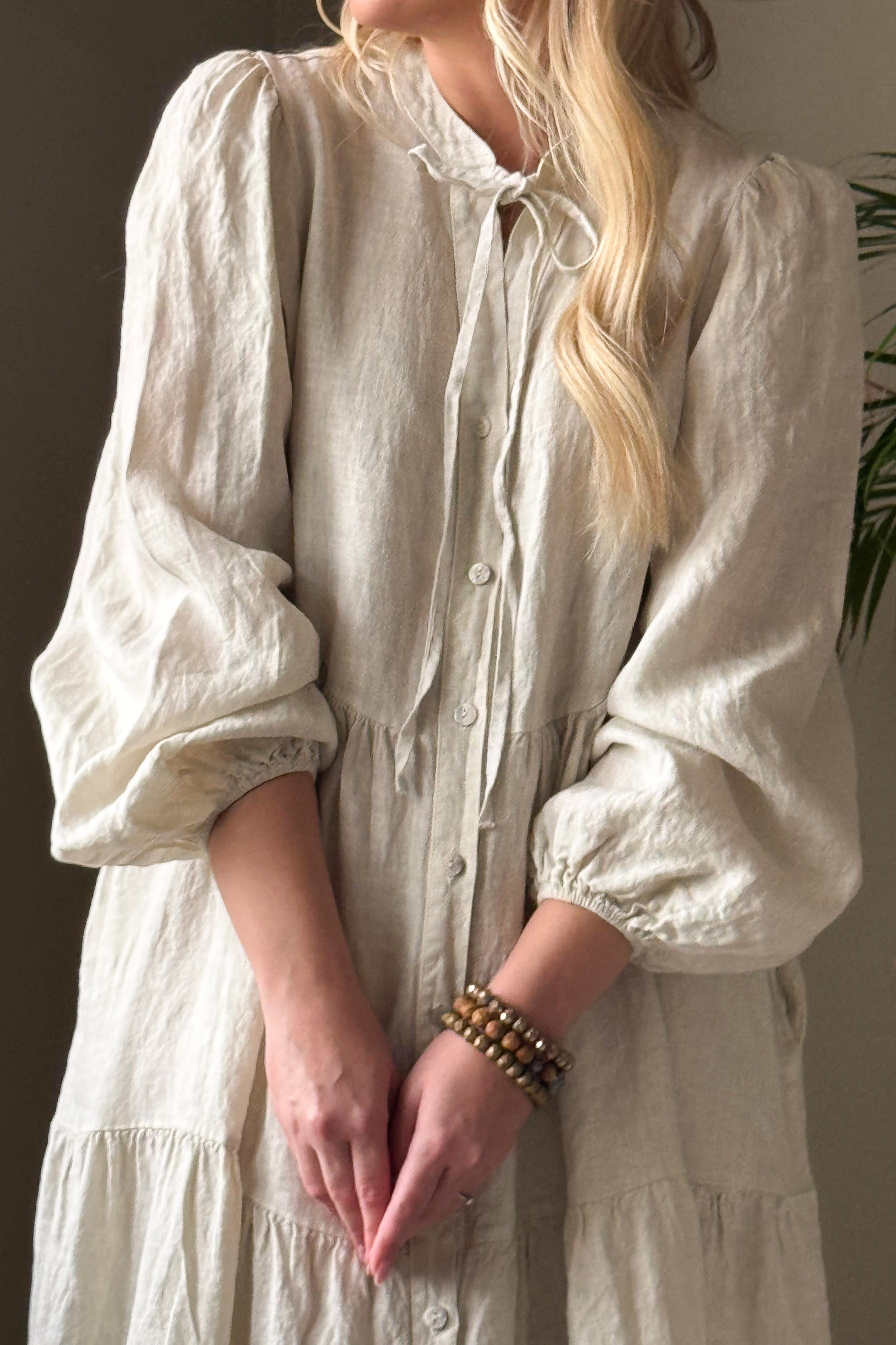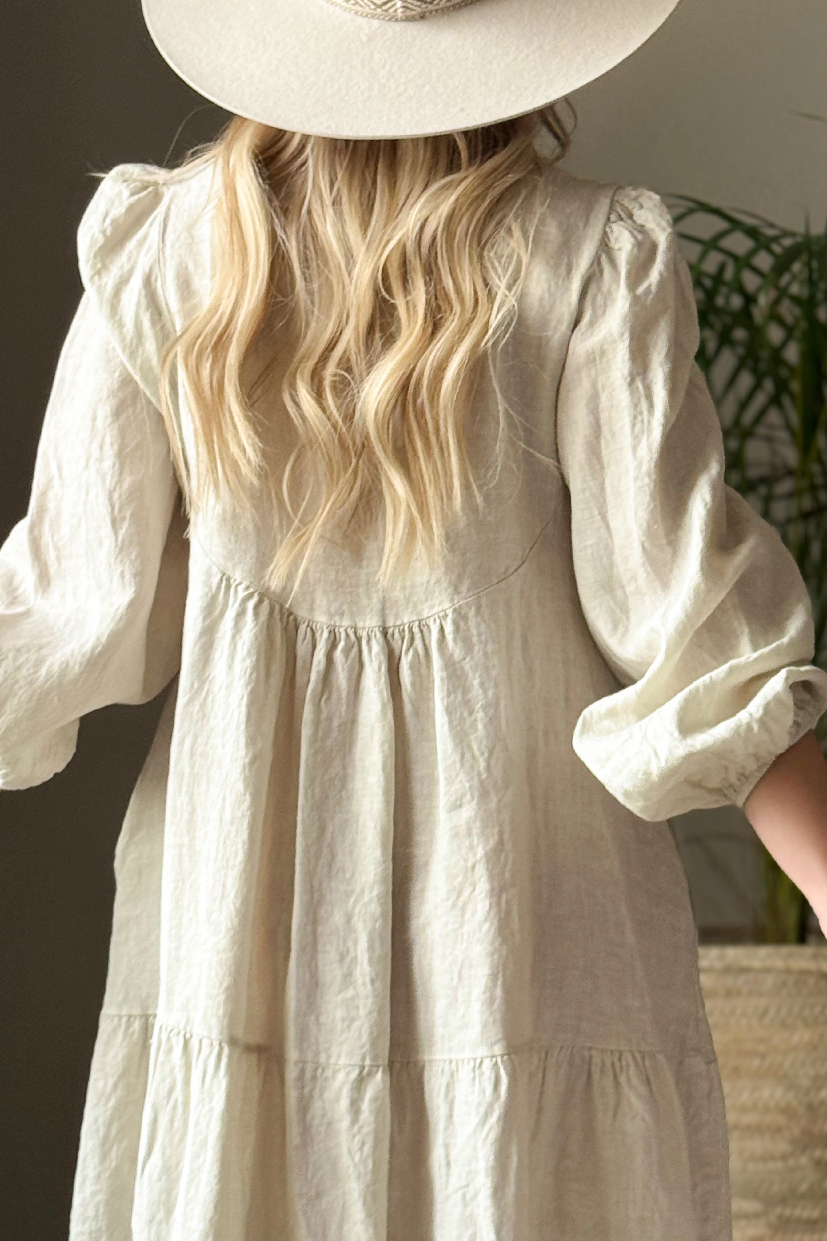 Upea pellavainen paitamekko, jossa kauniit puhvitetut hihat, helmassa frillat sekä edessä napitus. Sivuilla käytännölliset piilotaskut.