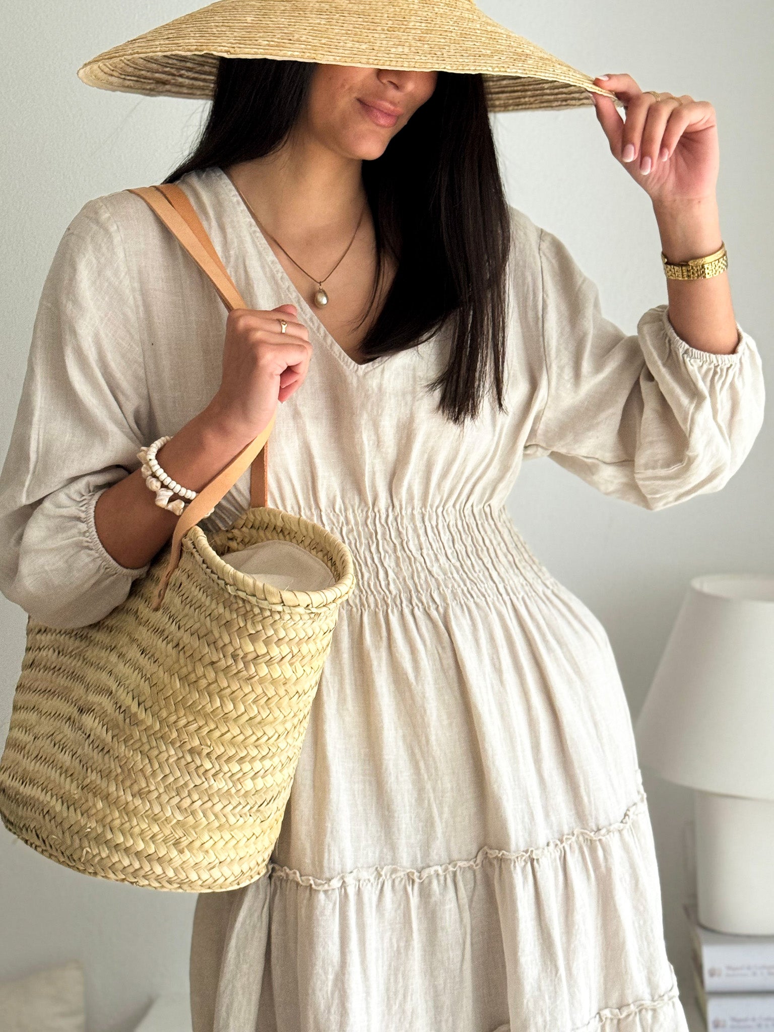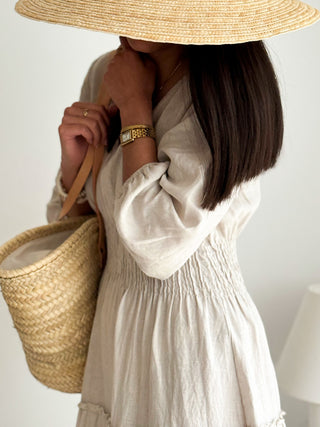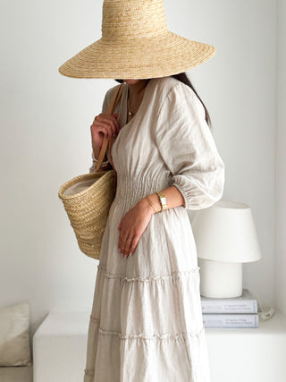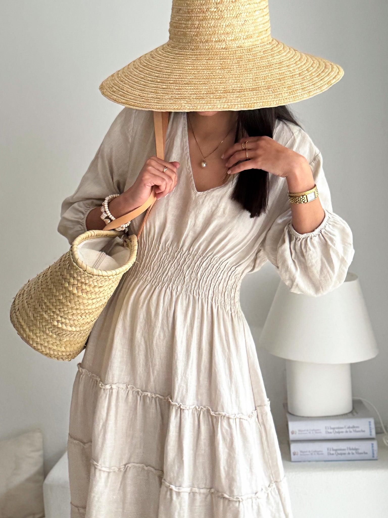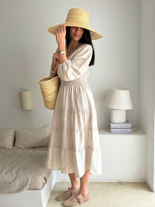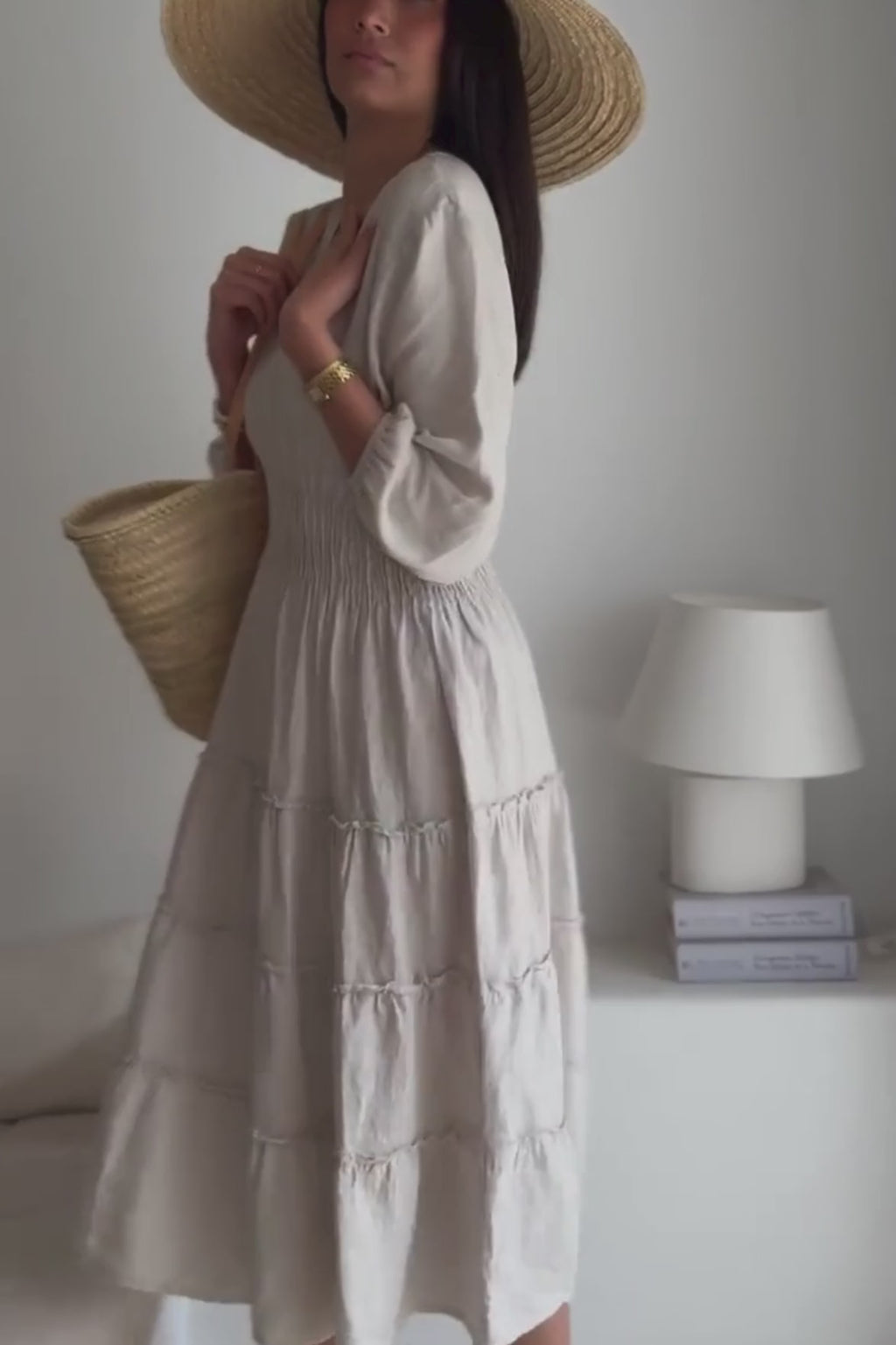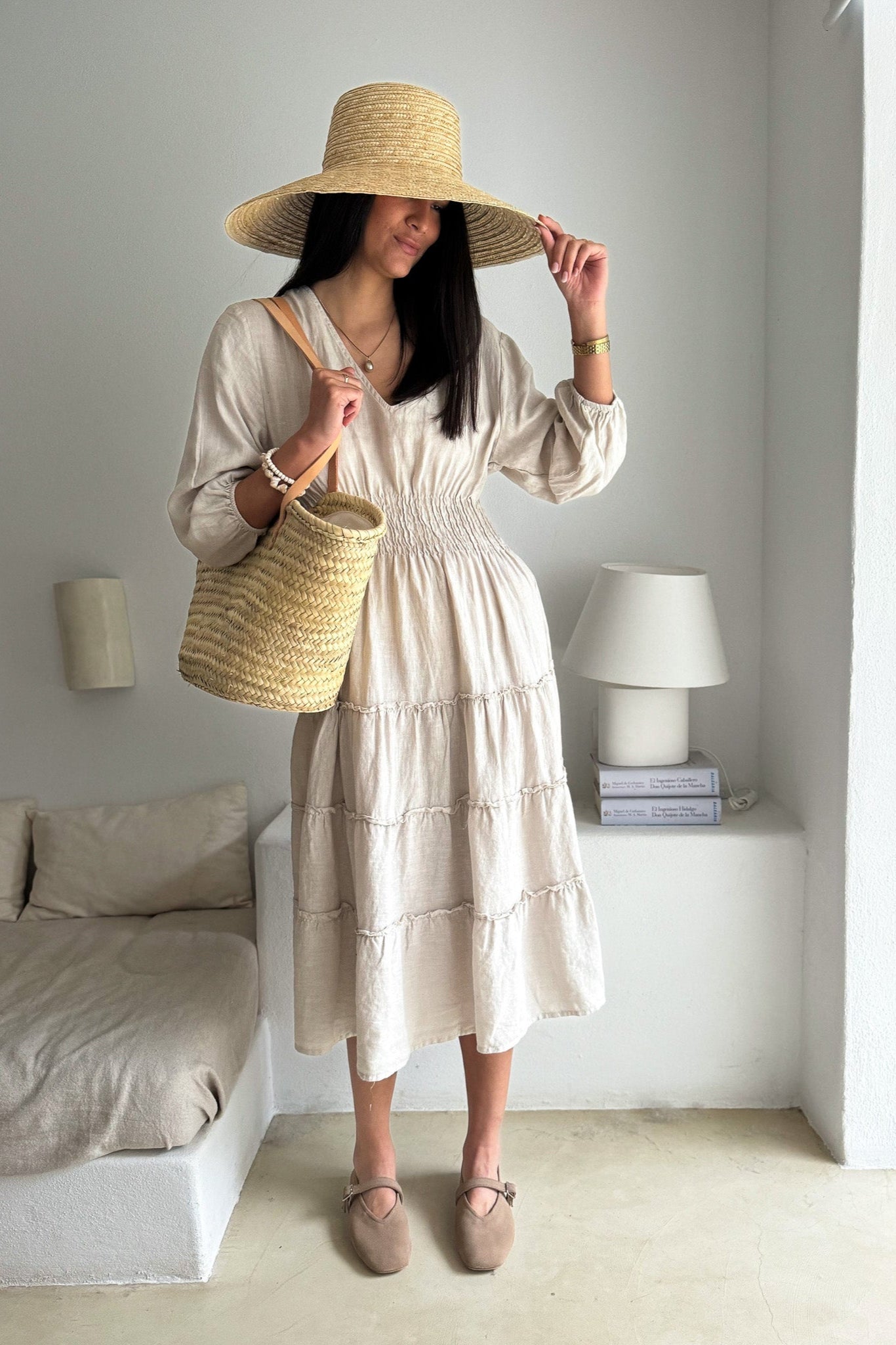 Hurmaavan naisellinen pellavamekko, jossa näyttävät frillat helmassa kolmessa tasossa. Leveä joustorypytys vyötäröllä luo upean siluetin. Pellavamekossa on puolipitkät hihat, joissa kuminauharypytys sekä imarteleva V-pääntie.