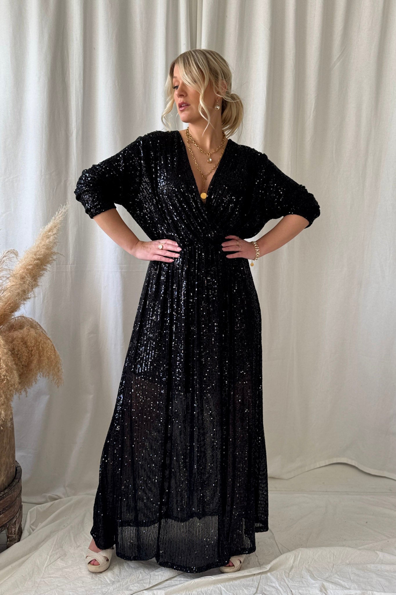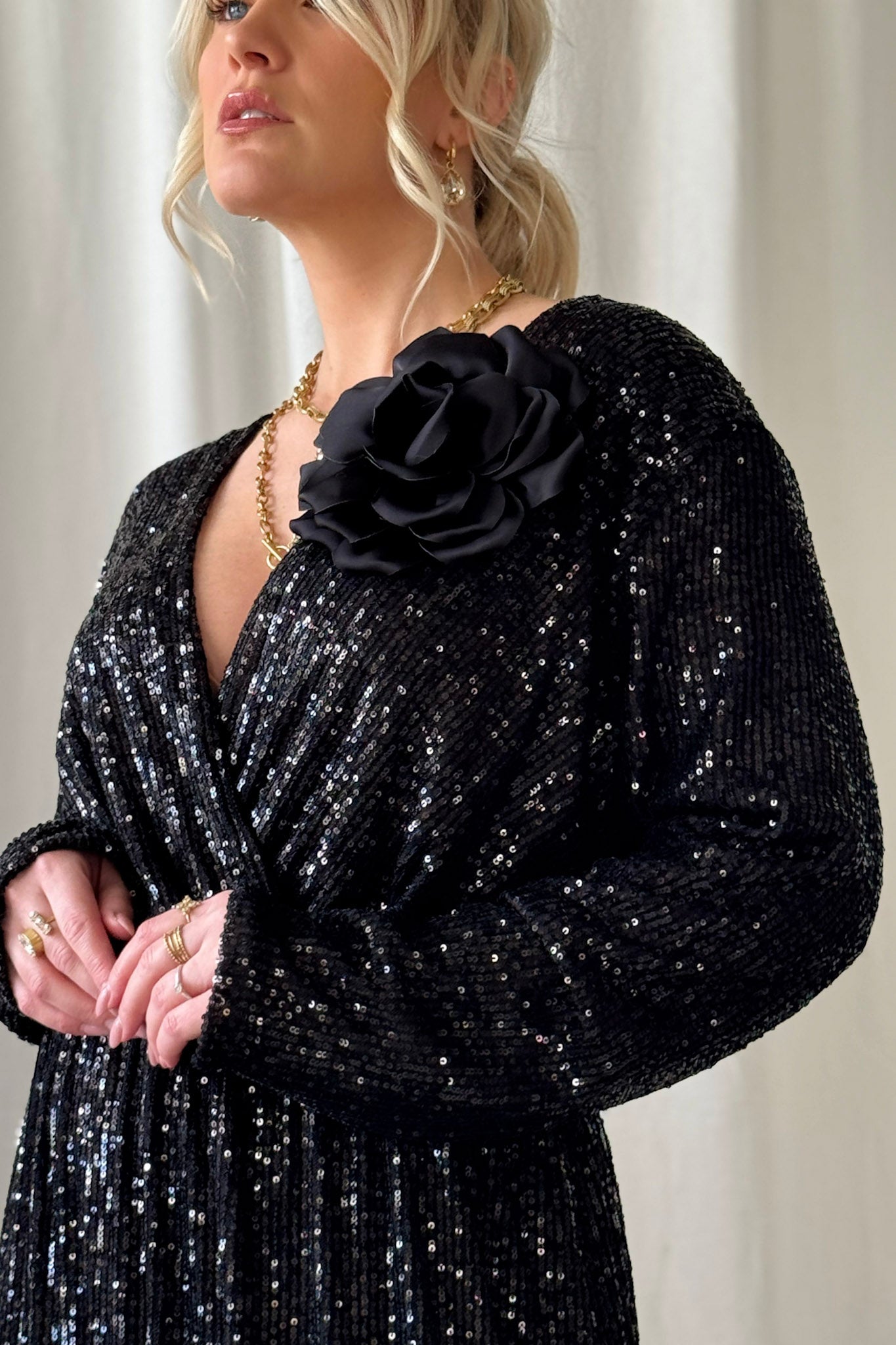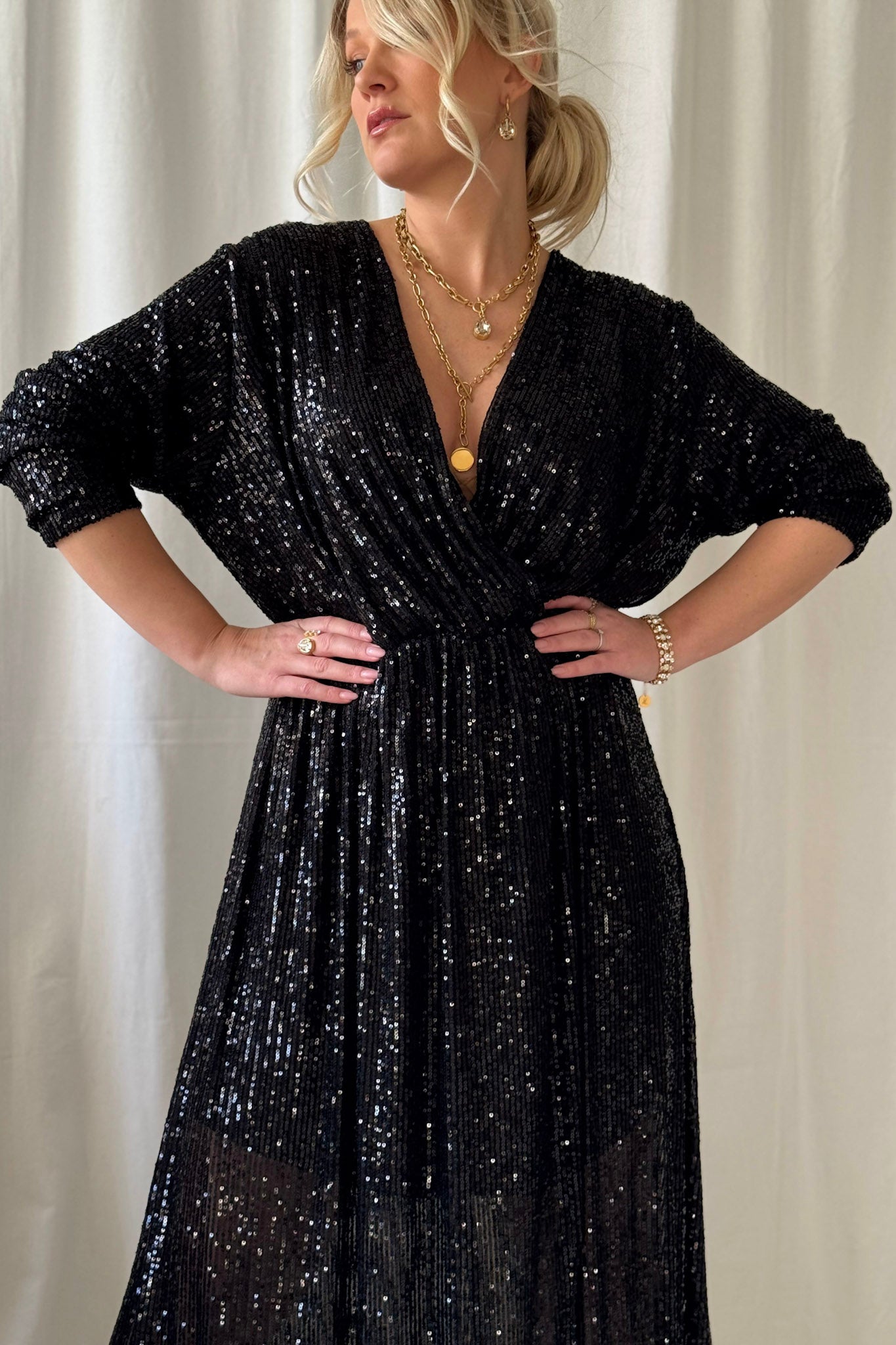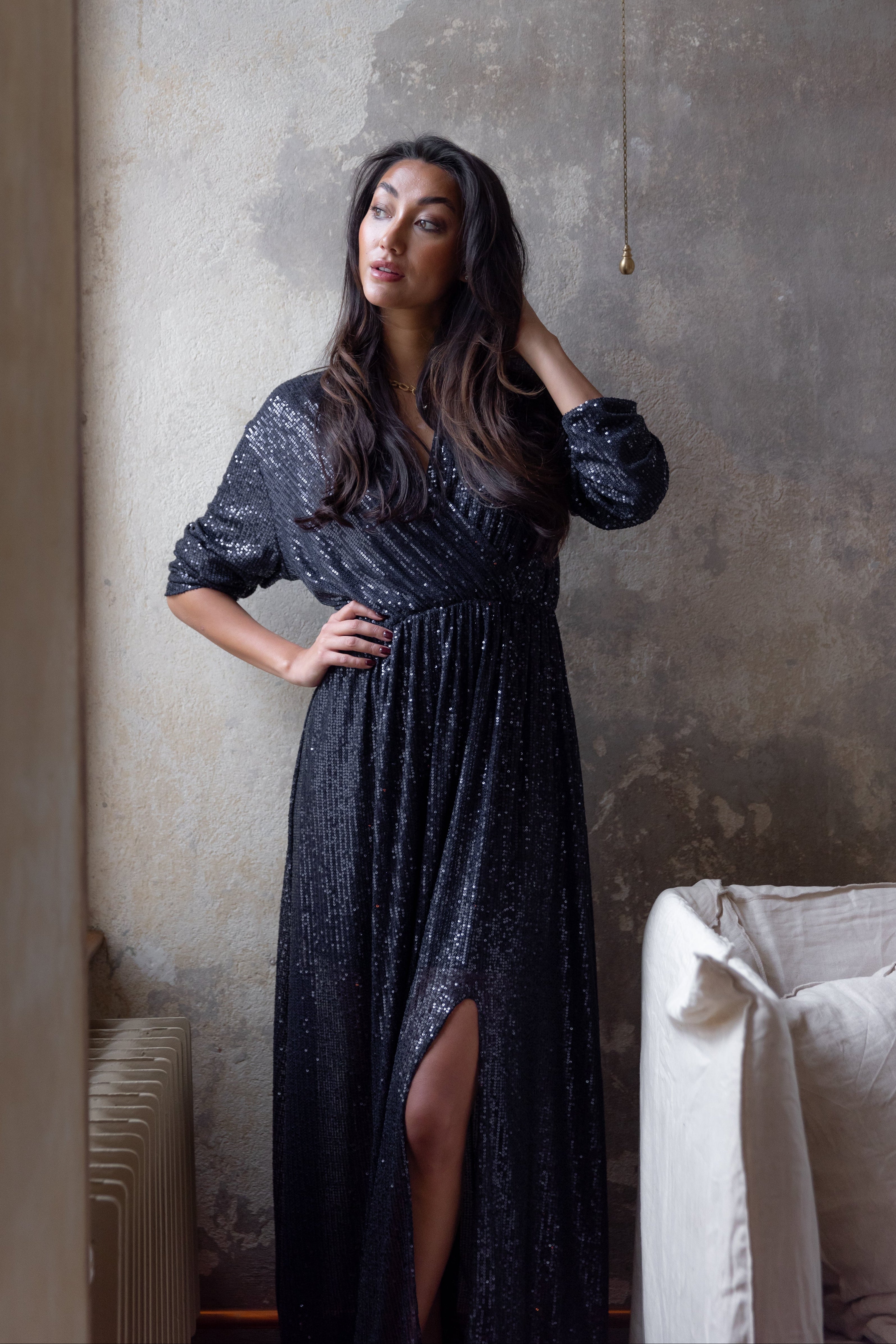 It's time to glow! Ylellisesti laskeutuva paljettimekko jossa syvään uurrettu halkio edessä. Kiinniommeltu lyhyempi reiteen ulottuva vuorikangas täyspitkät suorat hihat ja edessä kietaisupääntie.