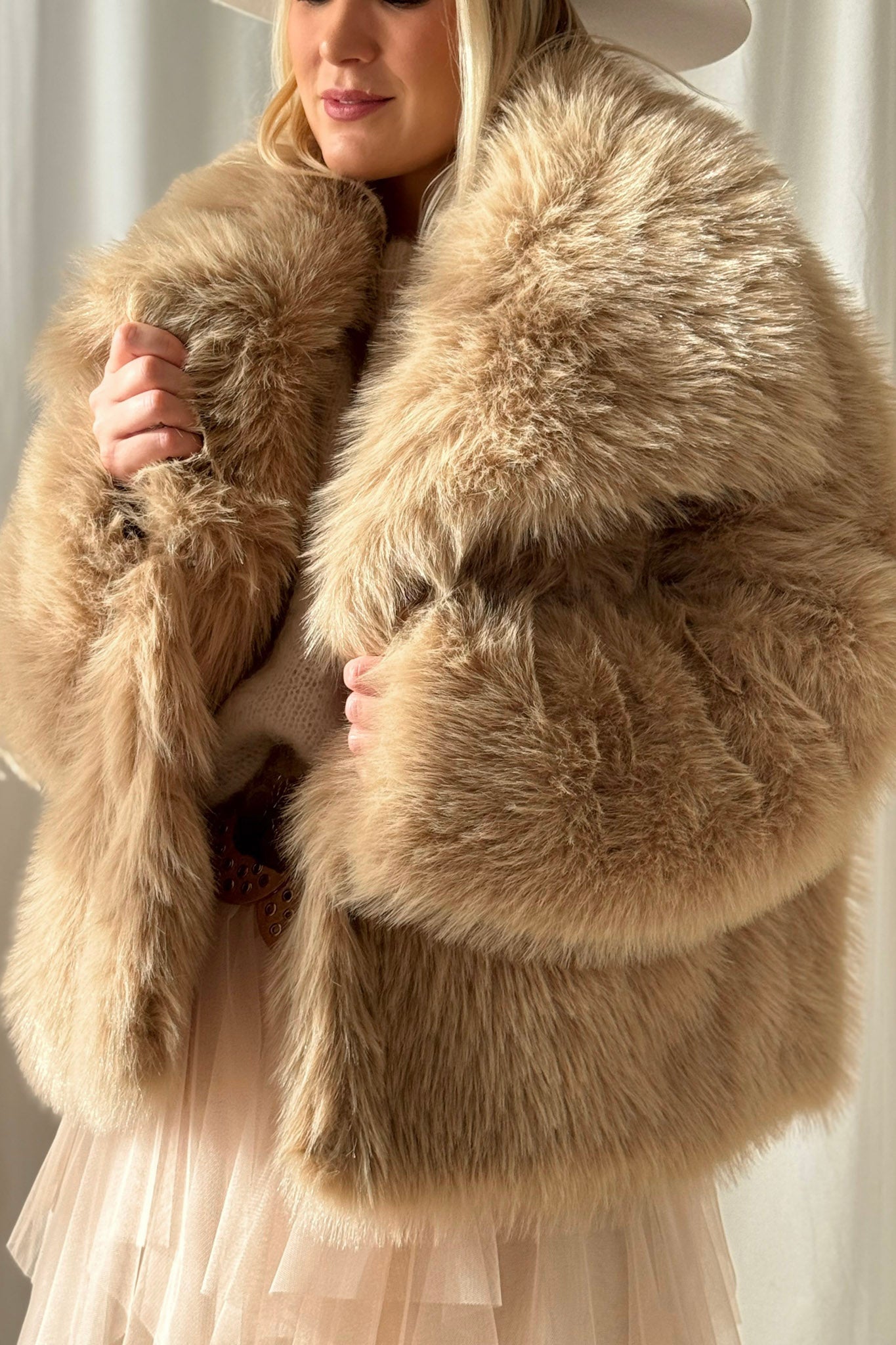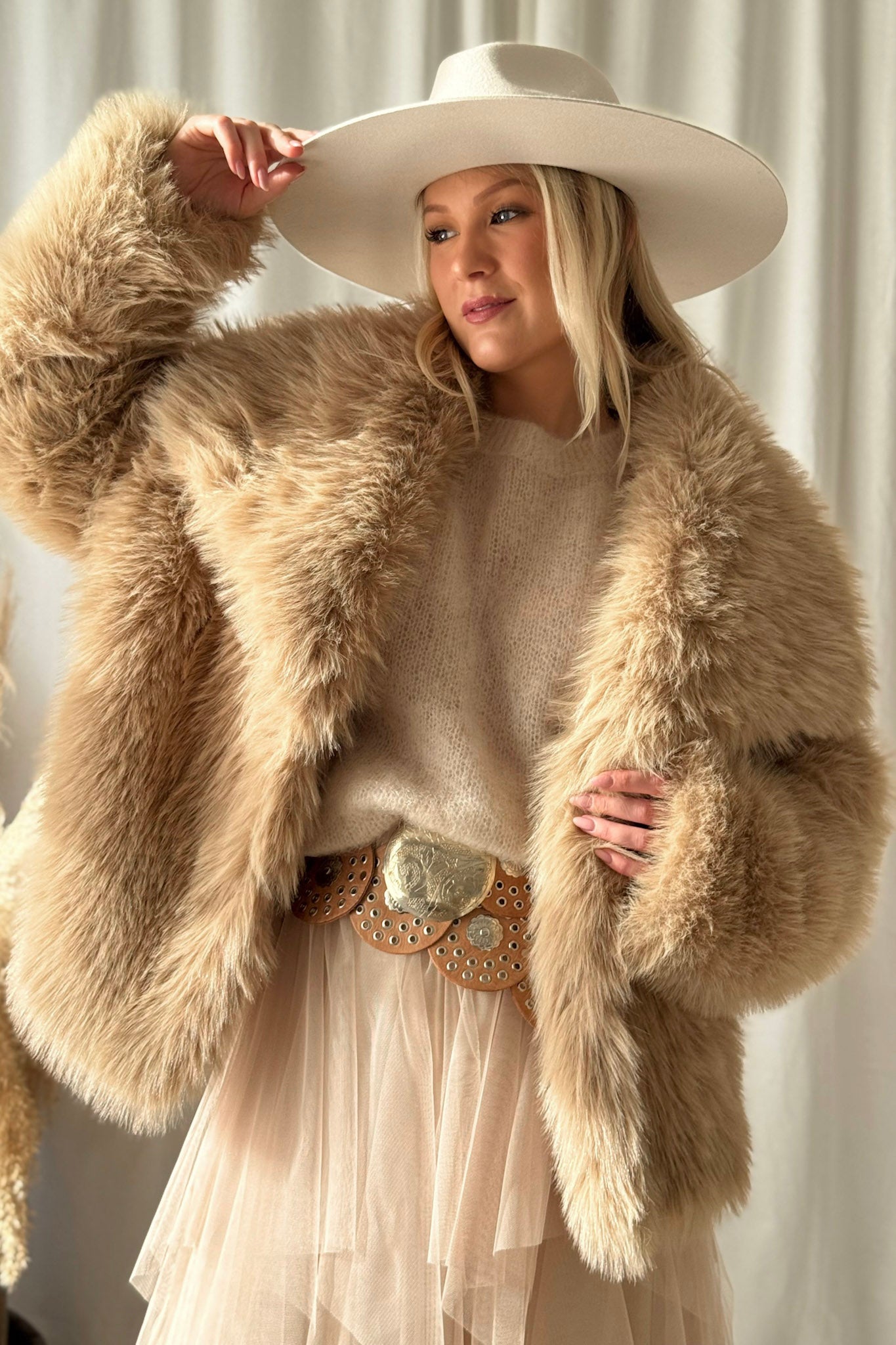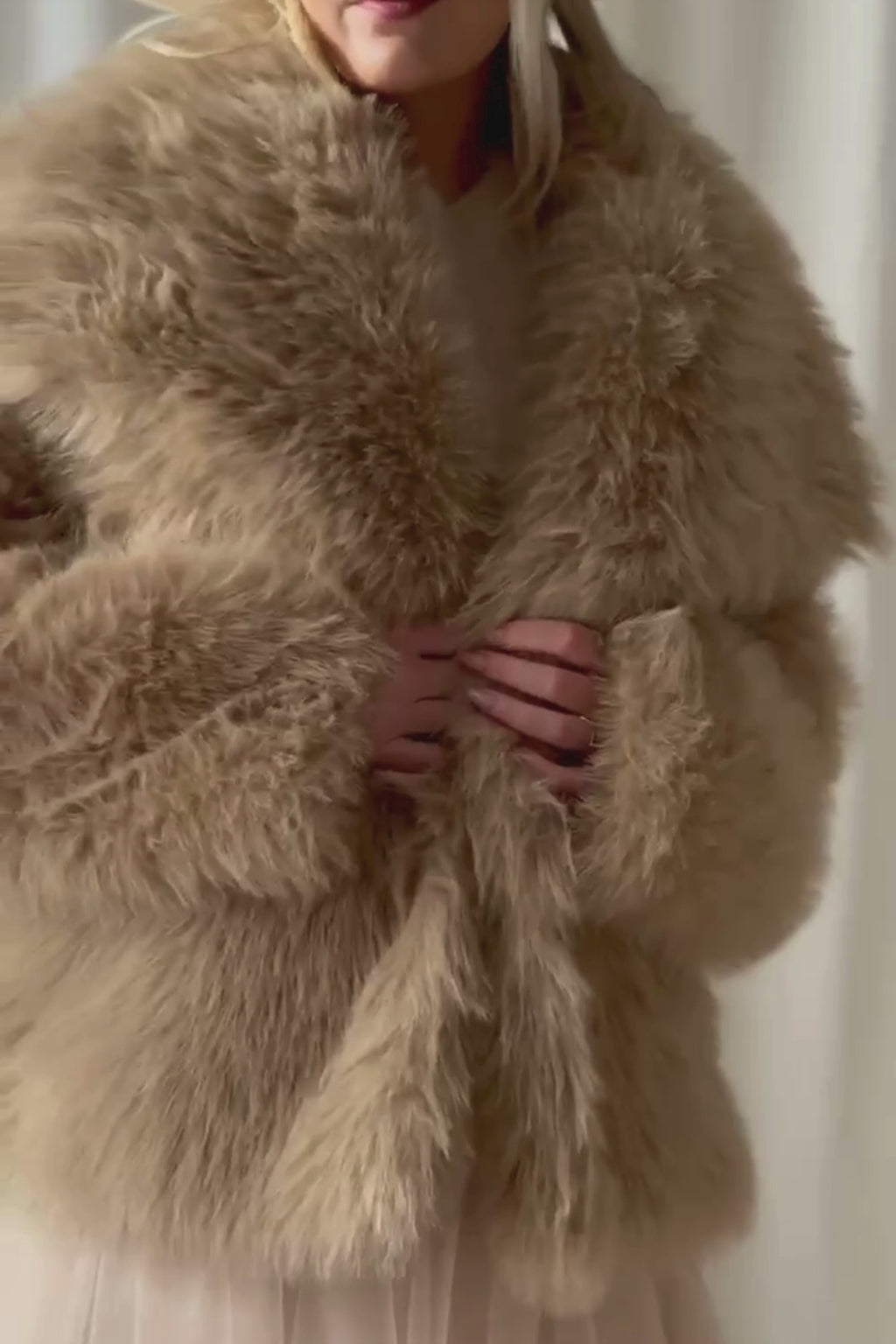 Ihanan muhkea ja näyttävä karvatakki tuntuu lämpimältä halilta päällä. Takissa nappikiinnitys ja sivutaskut.