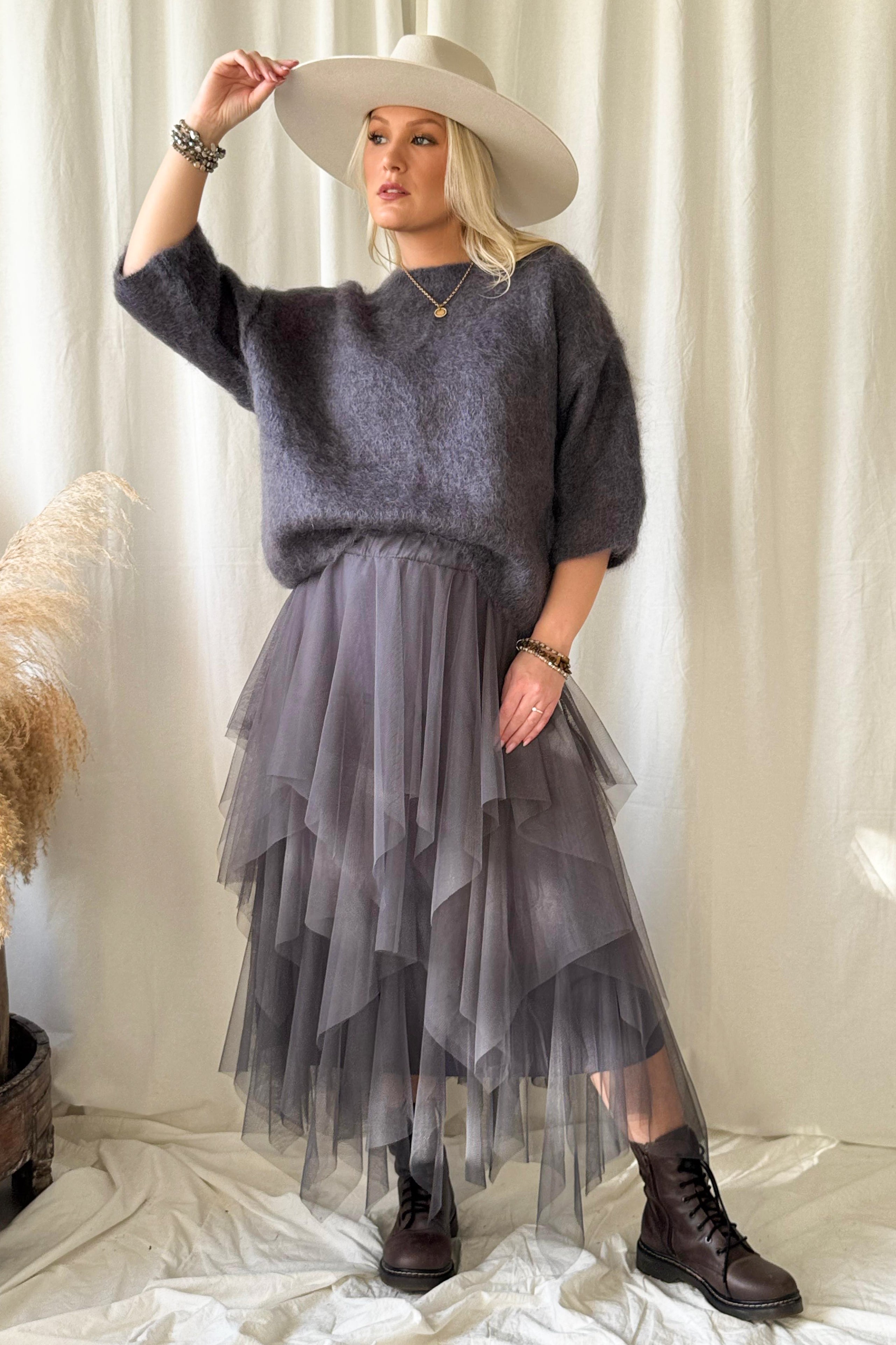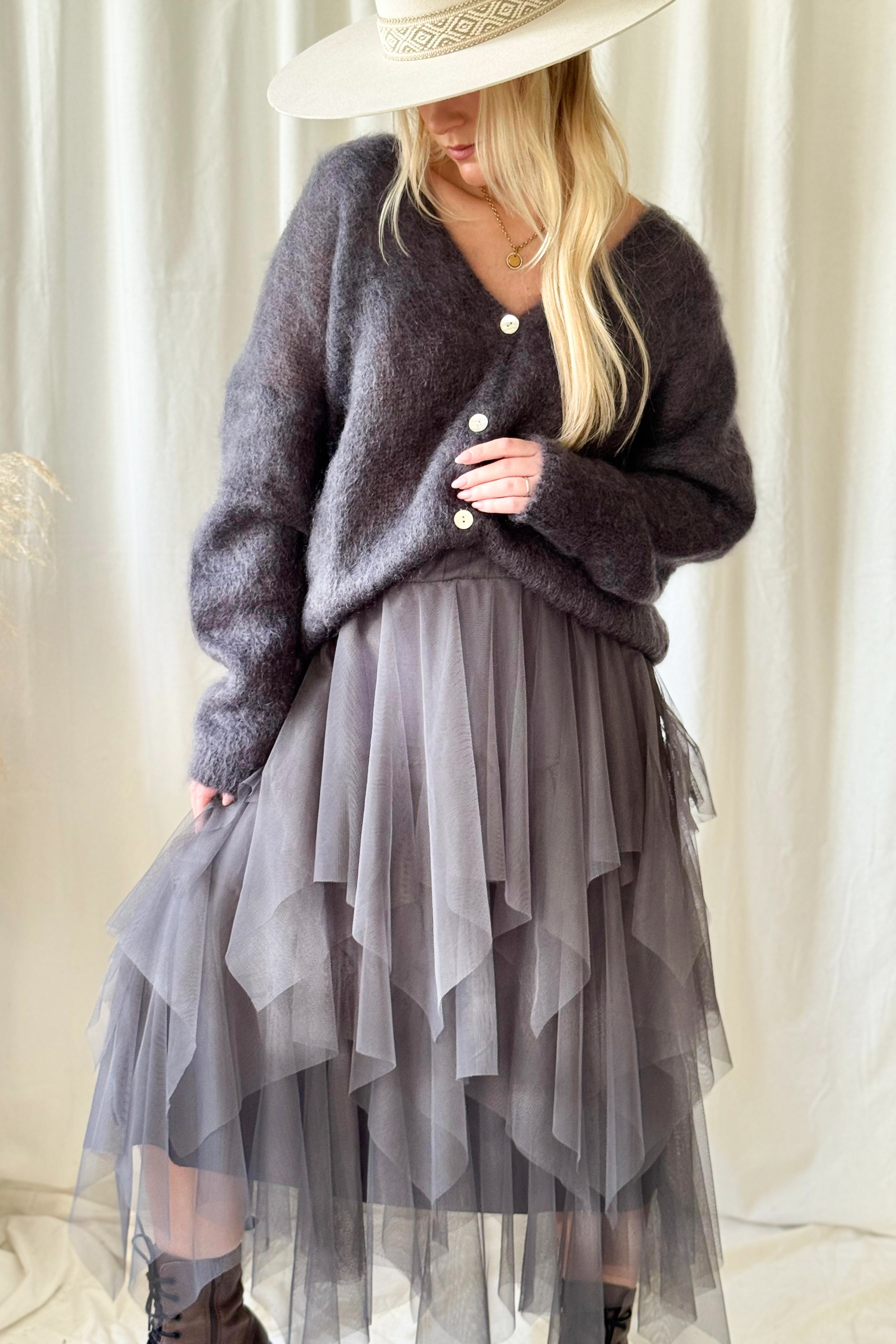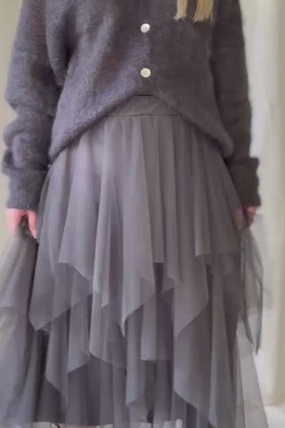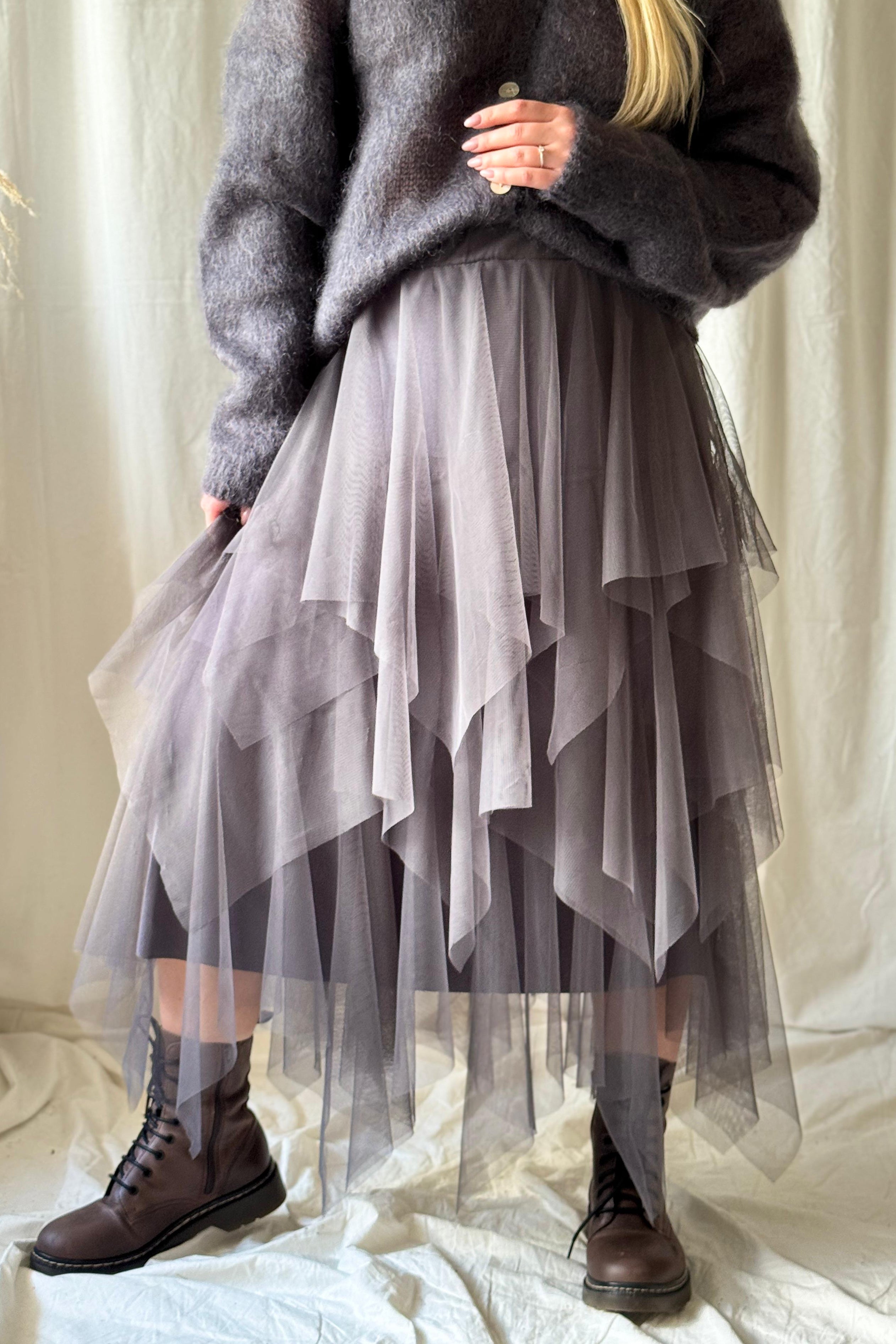 Unelmainen tyllihame, jonka viistosti leikatut kerrokset hulmuavat upeasti liikkuessa. Vyötäröllä tyllikankaalla vuorattu kuminauha. Kaksi kokoa, joista pienempi käy 34-38 kokoiselle ja reilumpi 40-42 kokoiselle. Vuorihame on joustavaa viskoositrikoota.