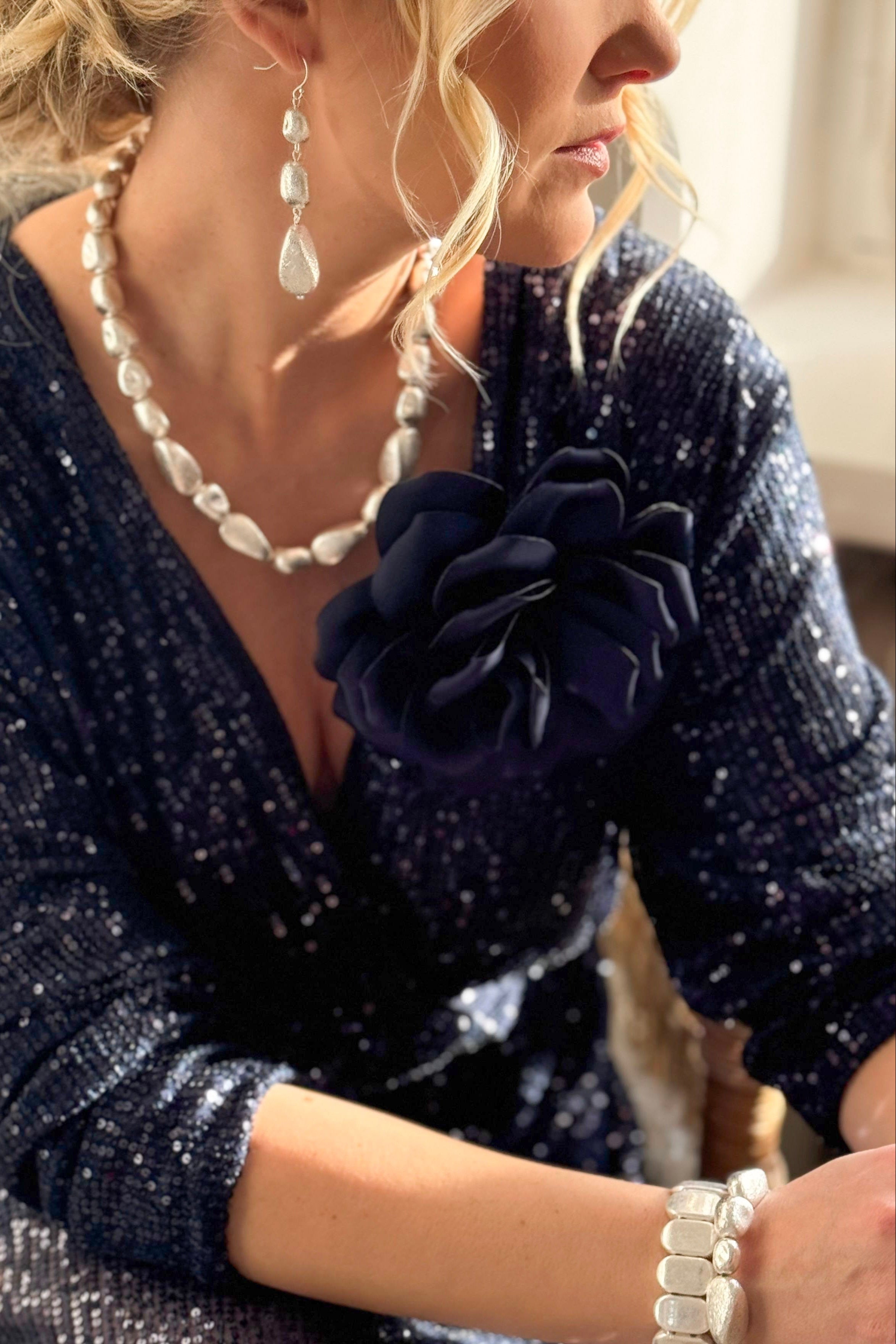 Satiininhohtoinen kookas ruusuke rintaan tai hiuksiin. Ruusukkeessa on klipsi sekä hakaneula kiinnitystä varten.