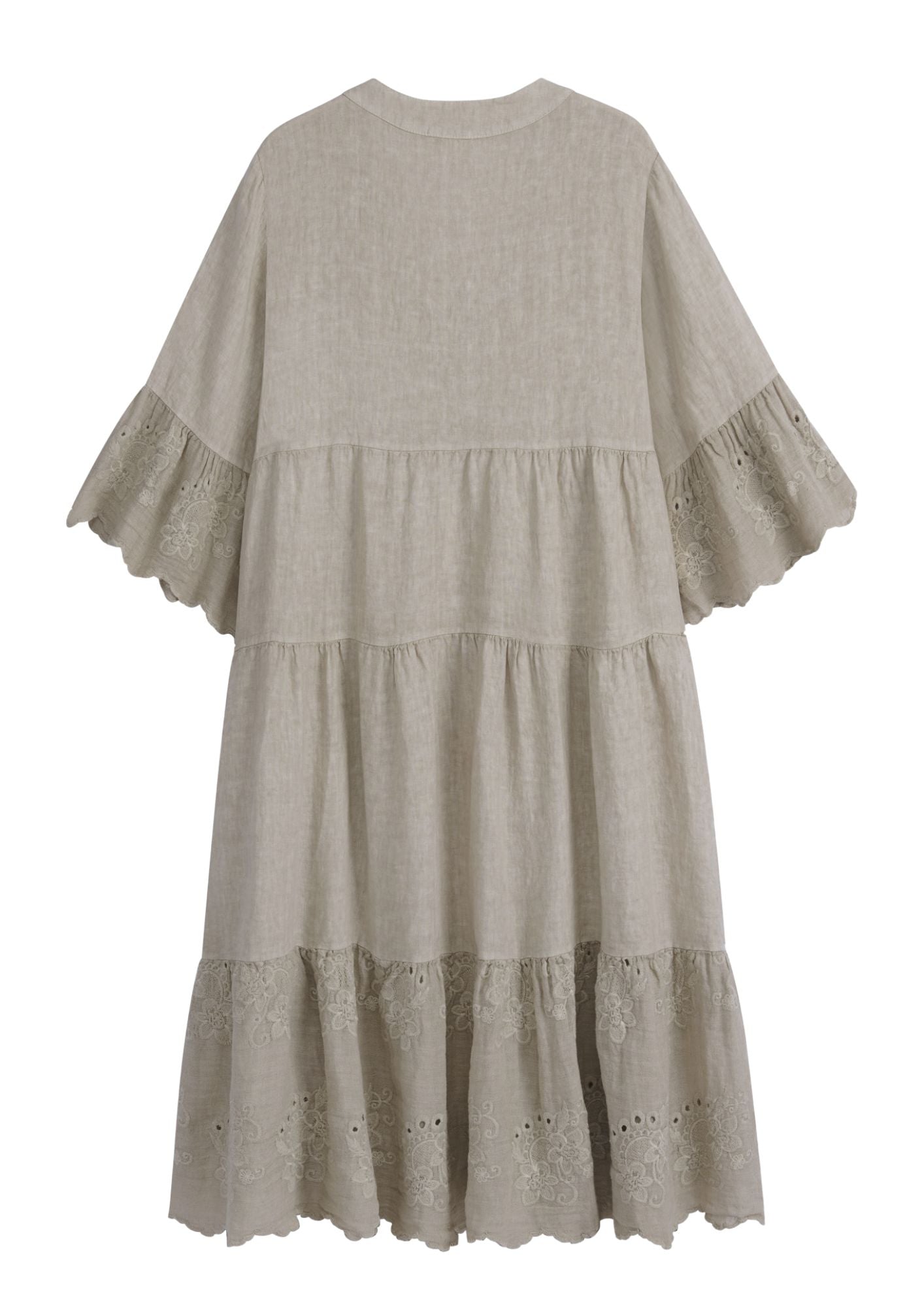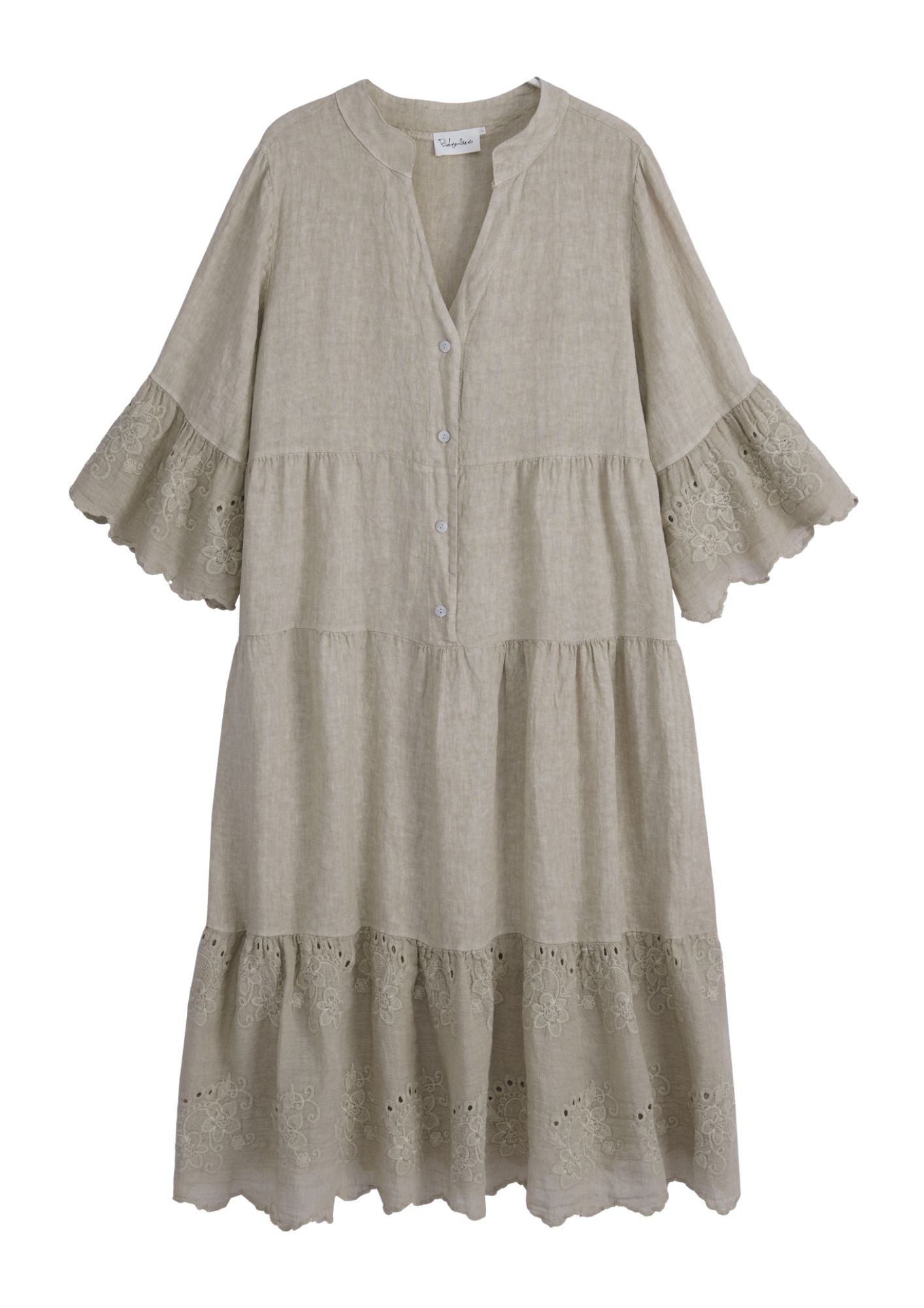 Lumoava, A-linjainen pellavamekko, jossa pystykaulus ja V-pääntie. Puolipitkät, alaspäin levenevät hihat. Hihansuissa ja helmassa upea, aplikoitu röyhelö. Frillat kolmessa tasossa tuovat mekkoon romanttista runsautta. Helmiäisnapitus edessä.
