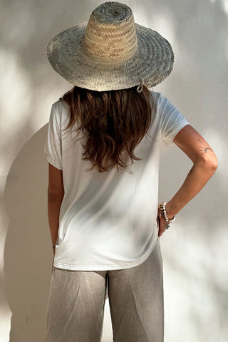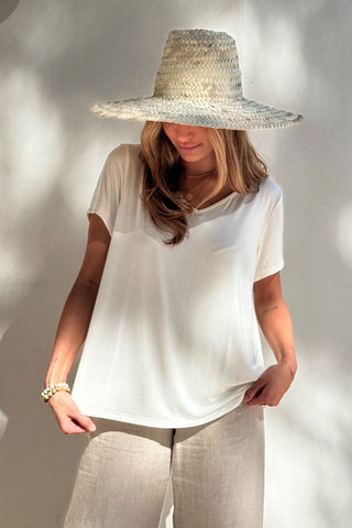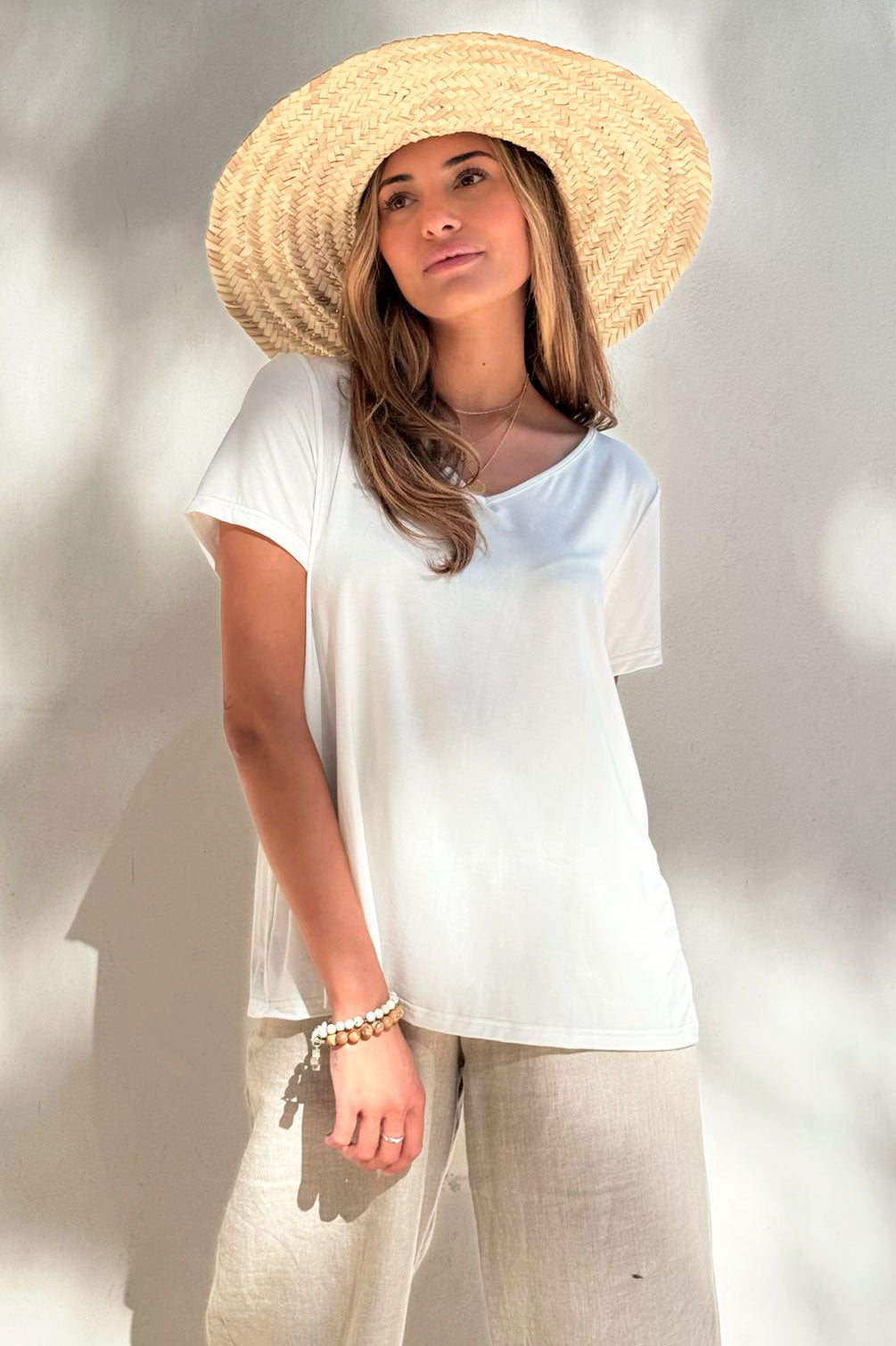 Kevyt bamboo t-paita, jossa lyhyet hihat ja v-kaulus. Joustava ja ylellisen ilmava materiaali on ihanan tuntuinen päällä.
