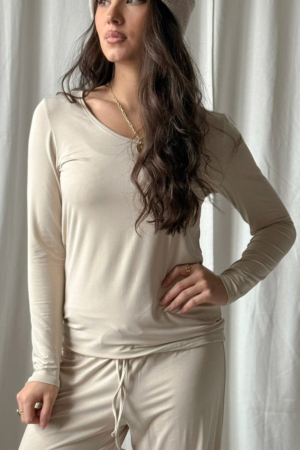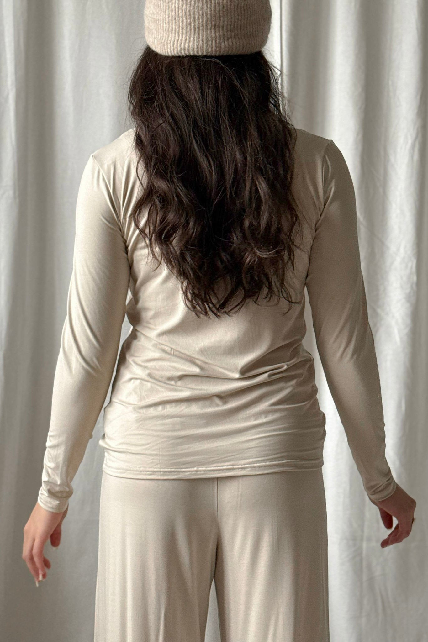Kevyt bamboo pitkähihainen paita, jossa pyöreä pääntie. Joustava ja ylellisen ilmava materiaali on ihanan tuntuinen päällä ja sopii jokaisen vaatekaappiin. Kapeat hihat.