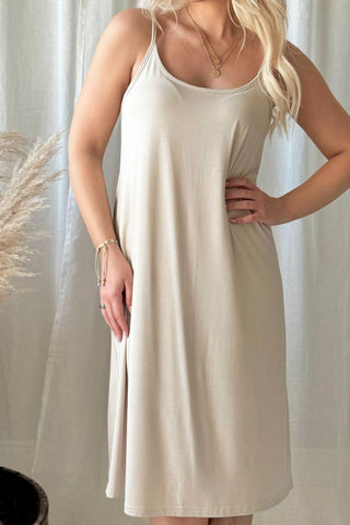 Bamboo alusmekko ohutta ja laskeutuvaa materiaalia. Hieman a-linjainen, säädettävät olkaimet. Kuvan malli on 160cm pitkä.
