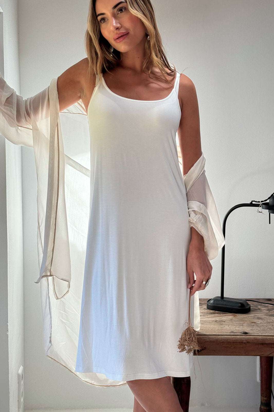 Bamboo alusmekko ohutta ja laskeutuvaa materiaalia. Hieman a-linjainen, säädettävät olkaimet. Kuvan malli on 170cm pitkä.