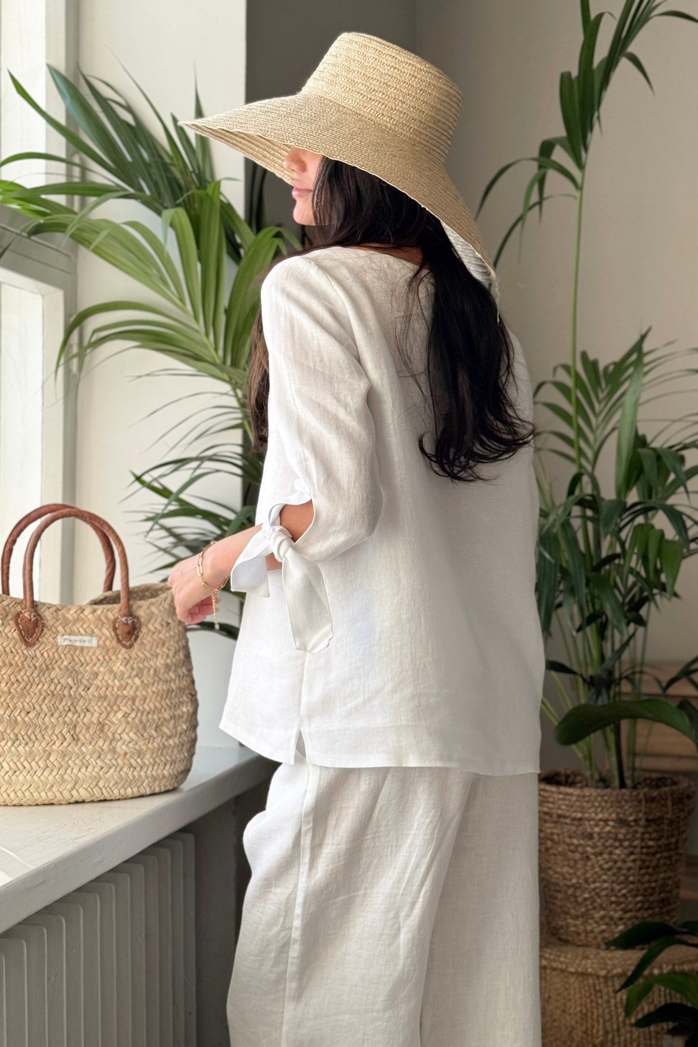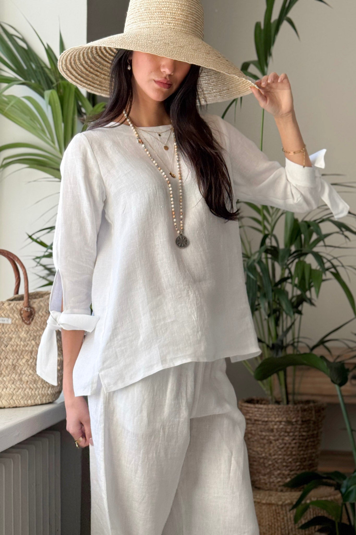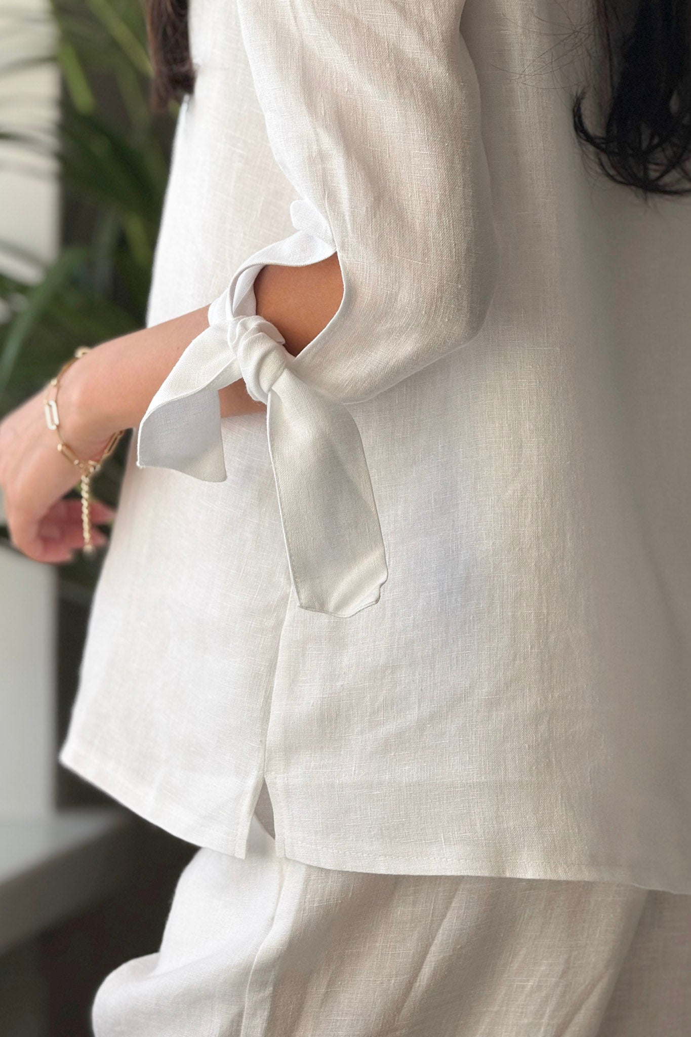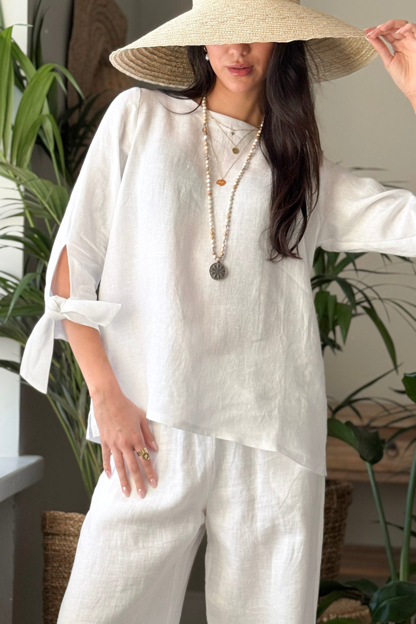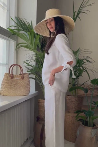 Tyylikäs pellavapaita, jossa on venemallinen pääntie sekä kauniit halkiot hihoissa. Hihansuut solmitaan rusetille, mikä antaa paidalle elegantin ja persoonallisen ilmeen. Monikäyttöinen paita sopii erinomaisesti sekä arkeen että juhlaan.