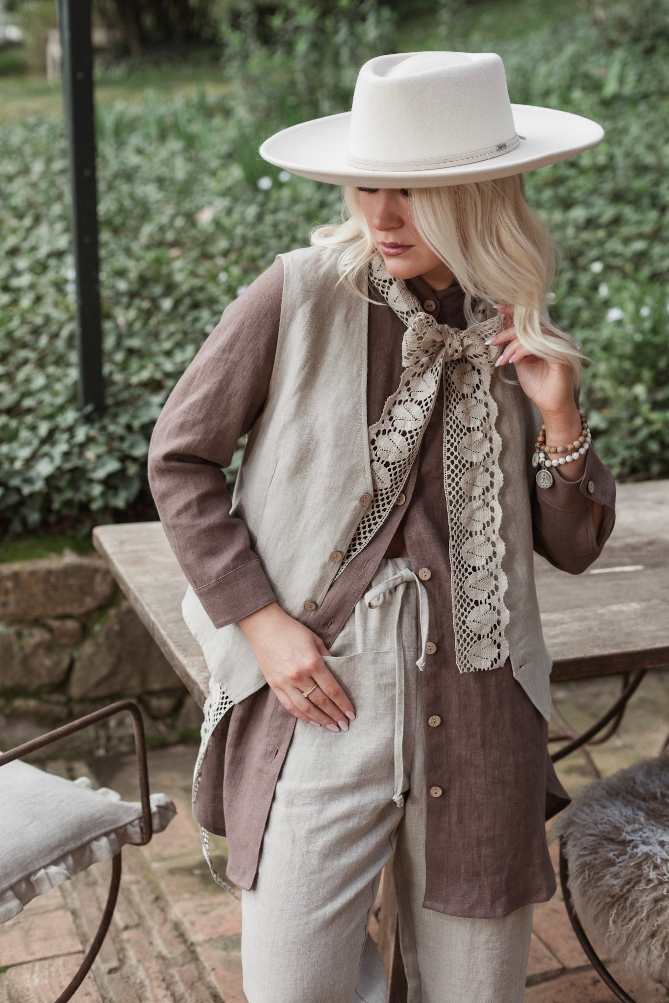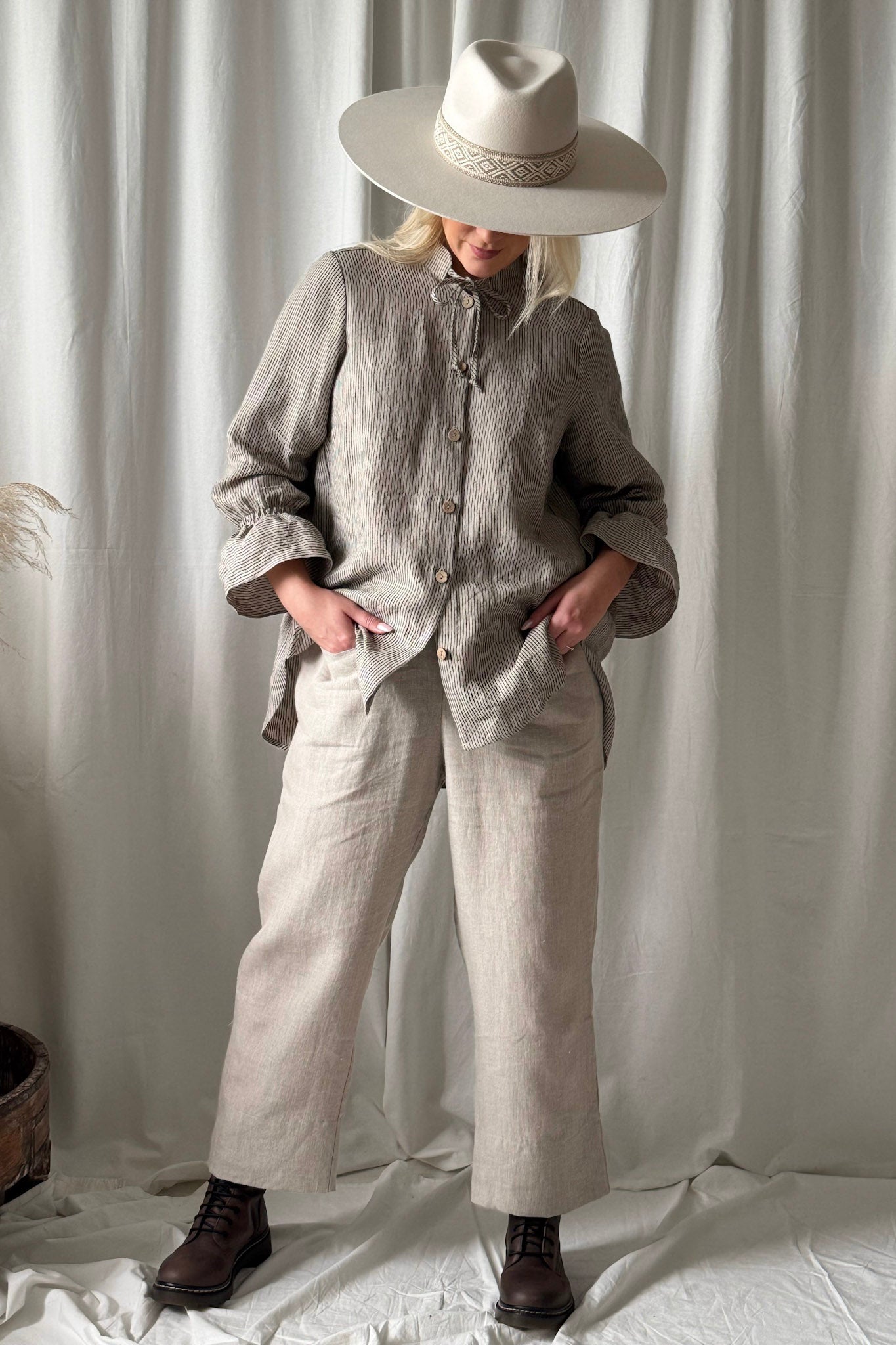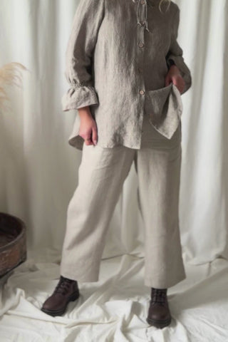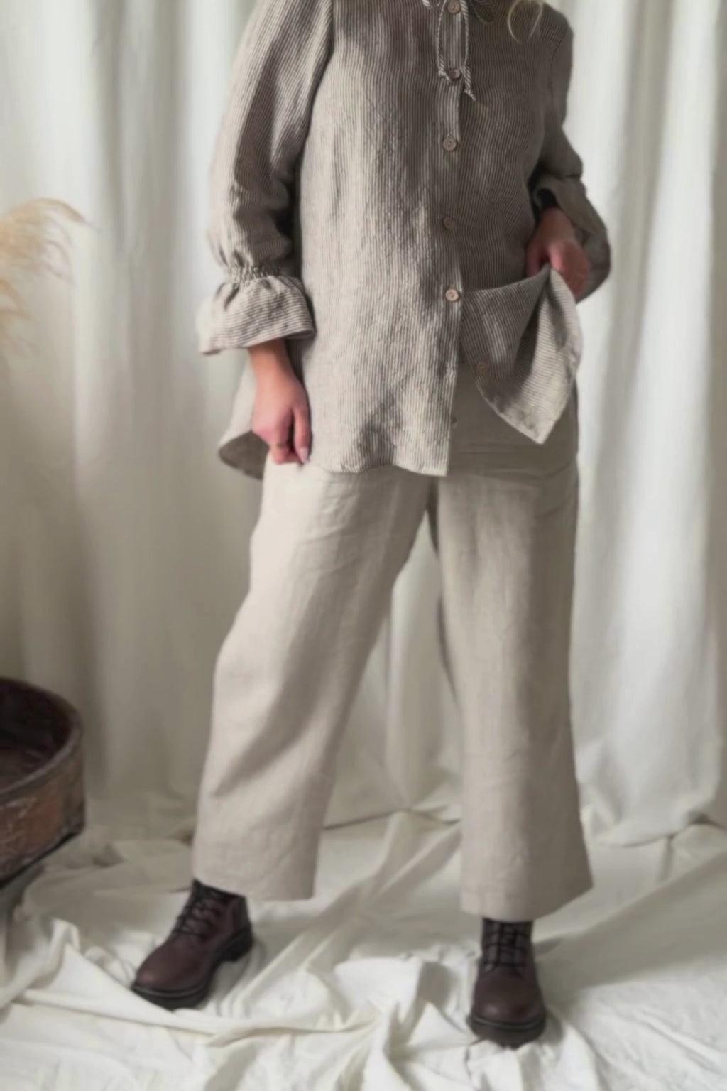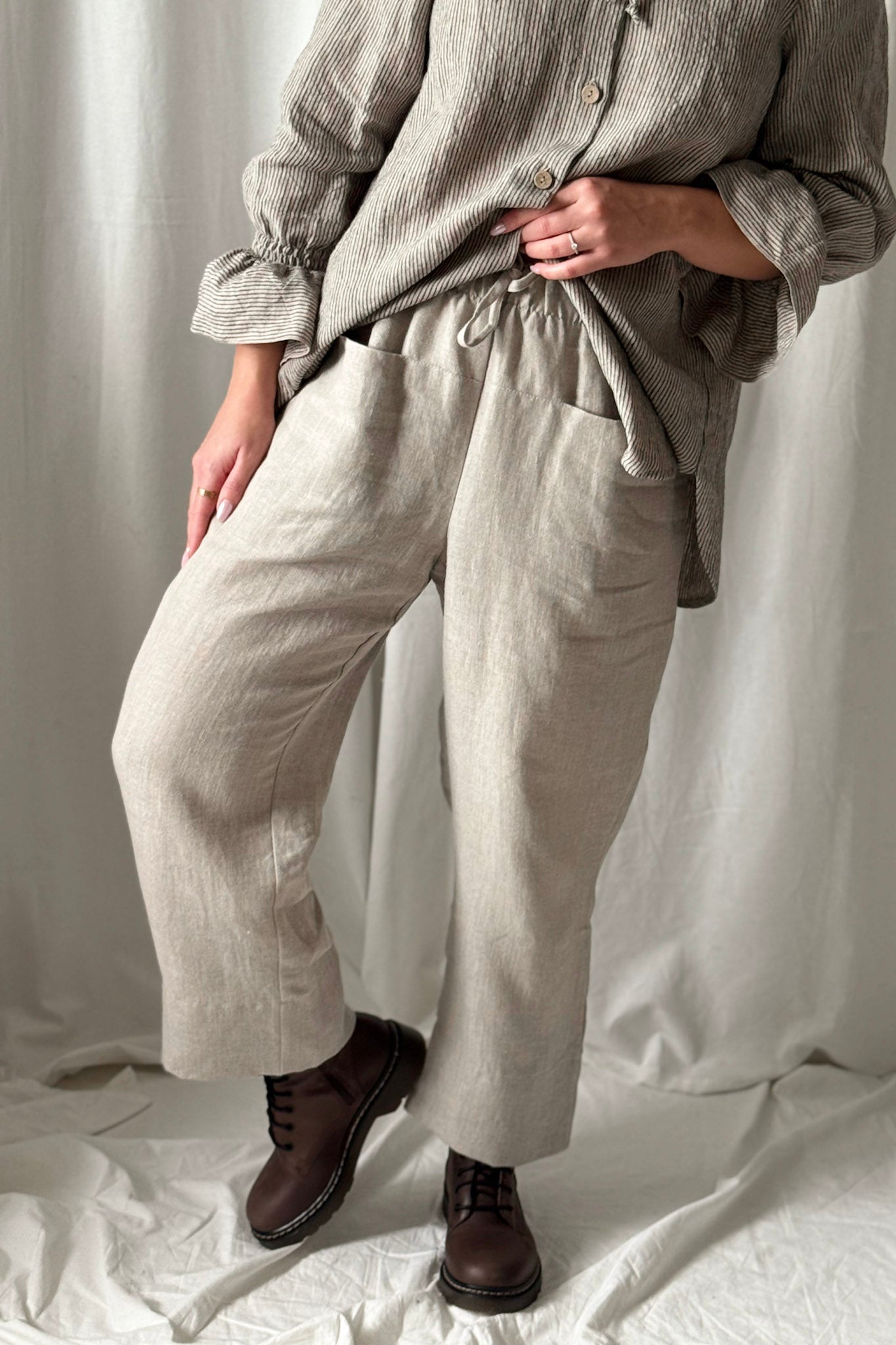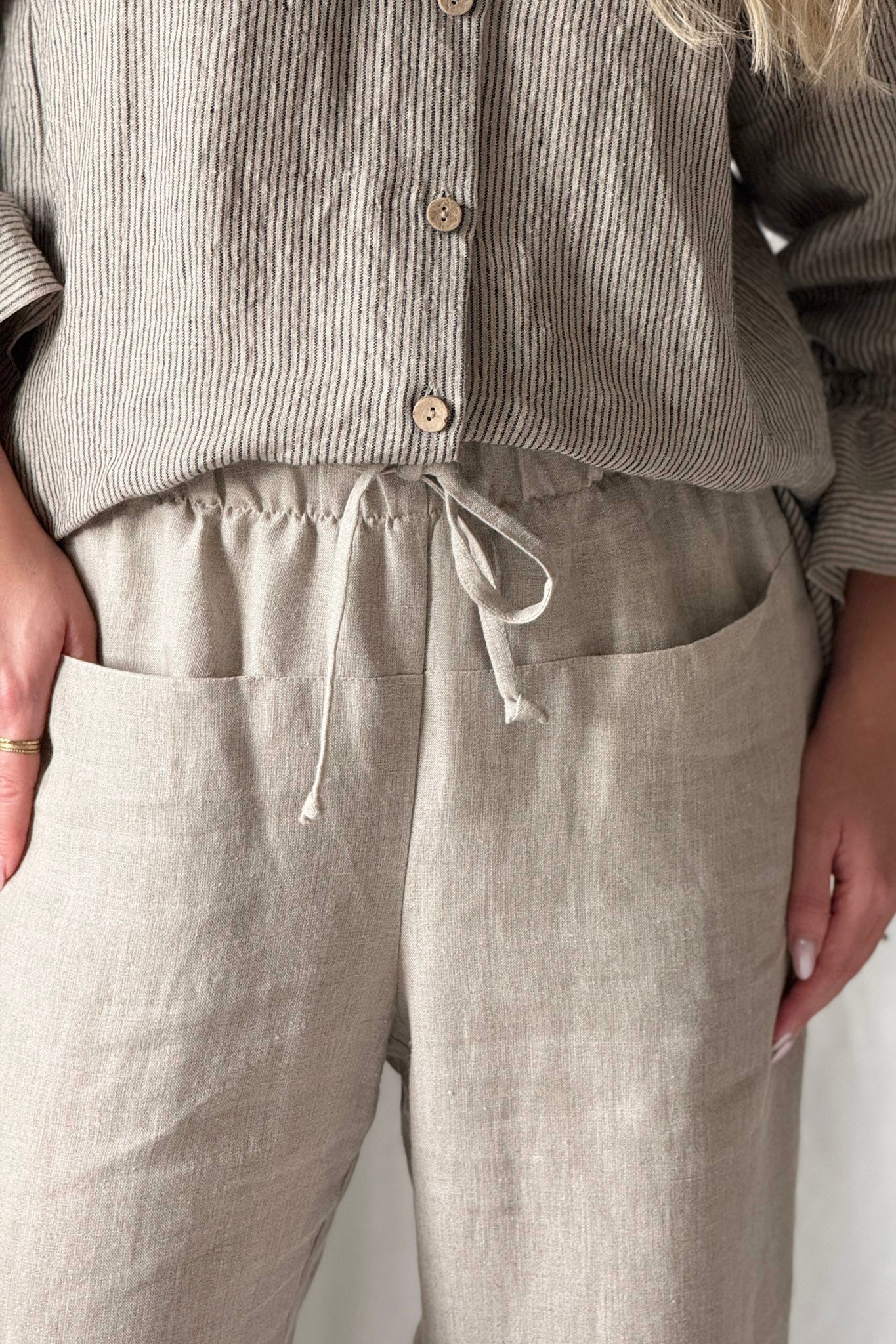 Klassiset pellavahousut leveillä lahkeilla. Housuissa on taskut edessä ja joustava resorivyötärö, jonka saa solmittua nyörillä. Valmistettu hengittävästä ja kestävästä pellavasta.