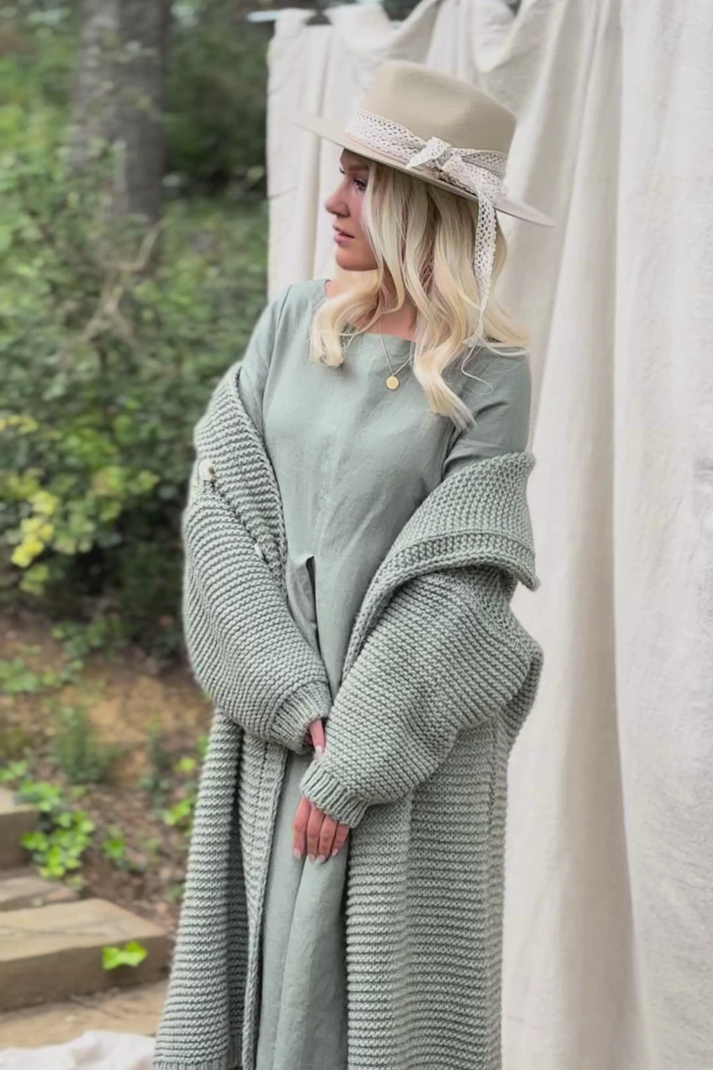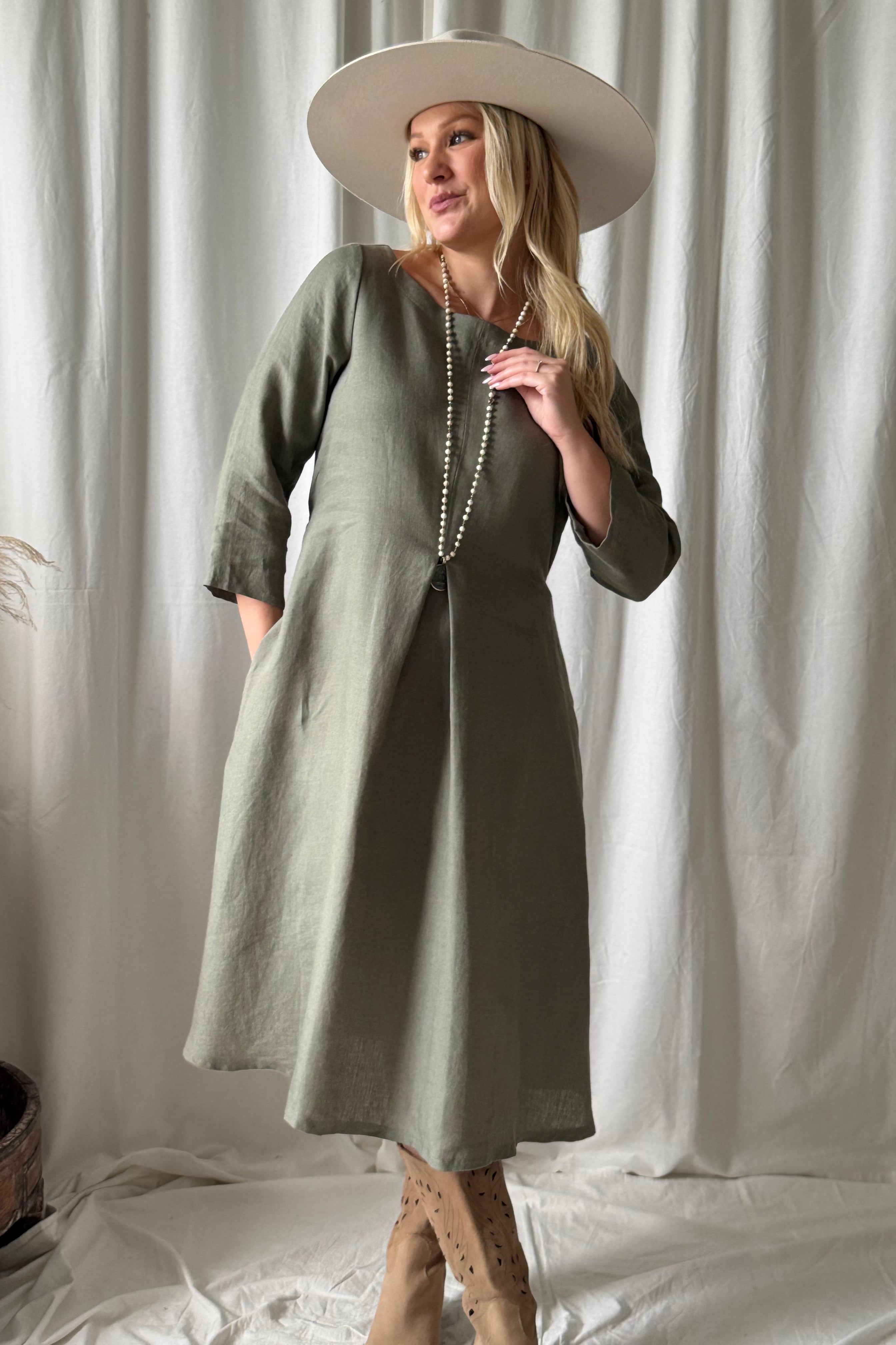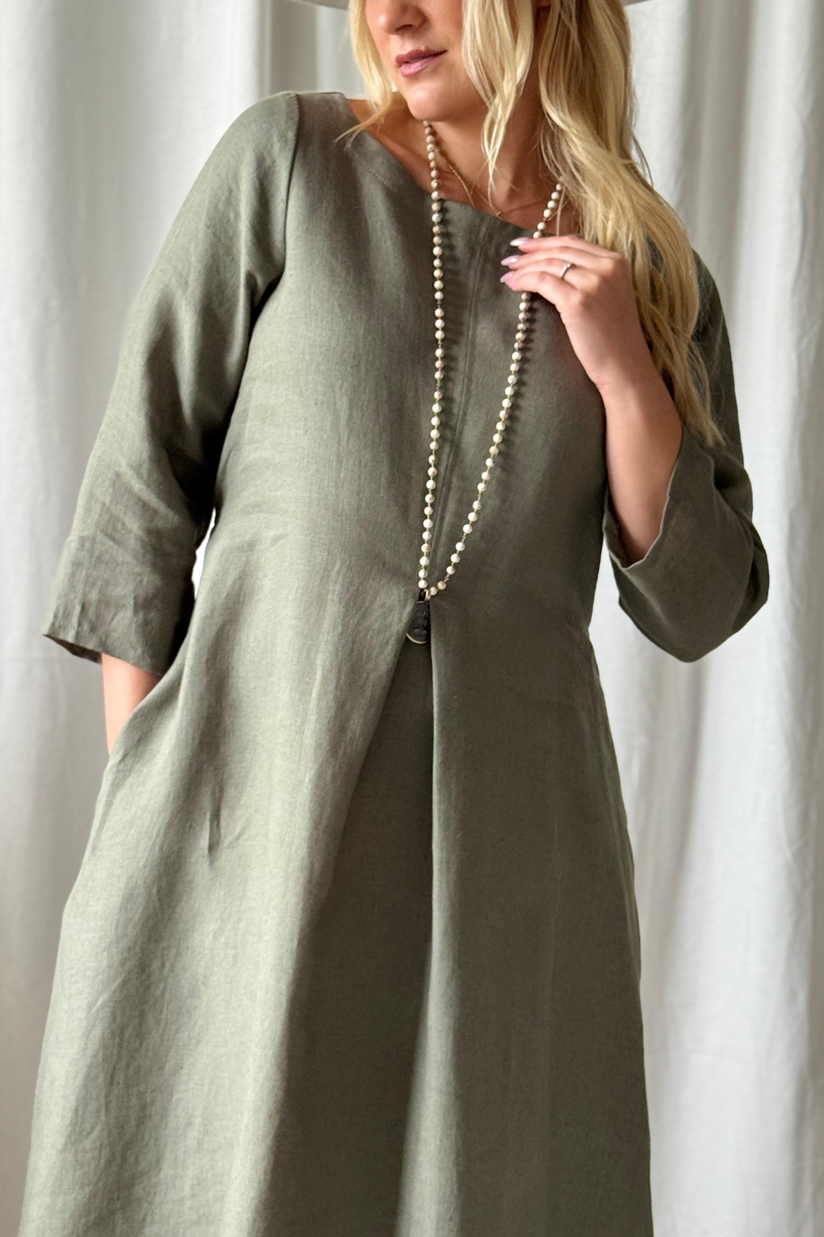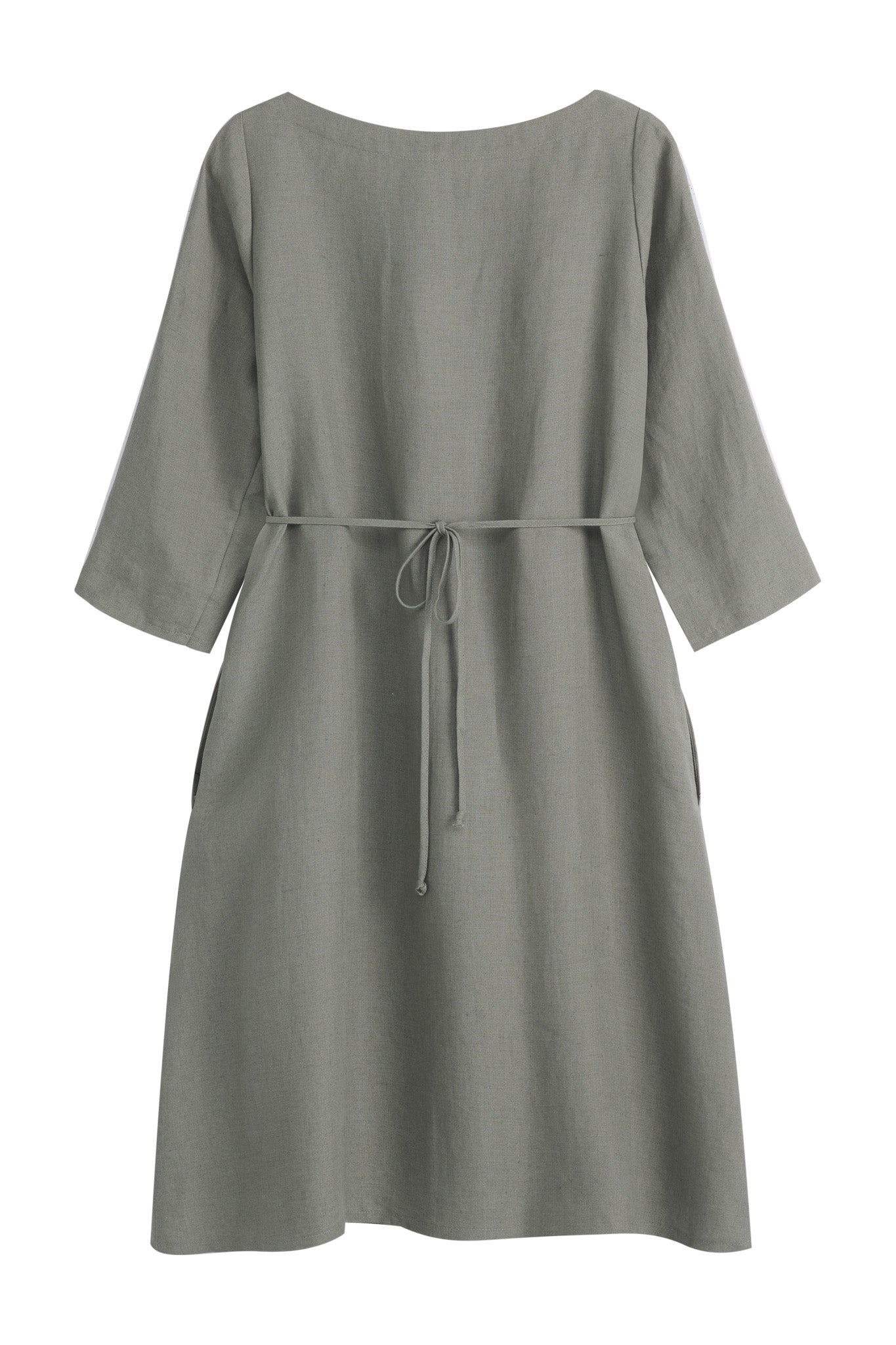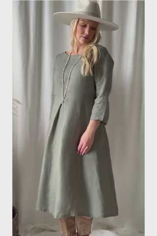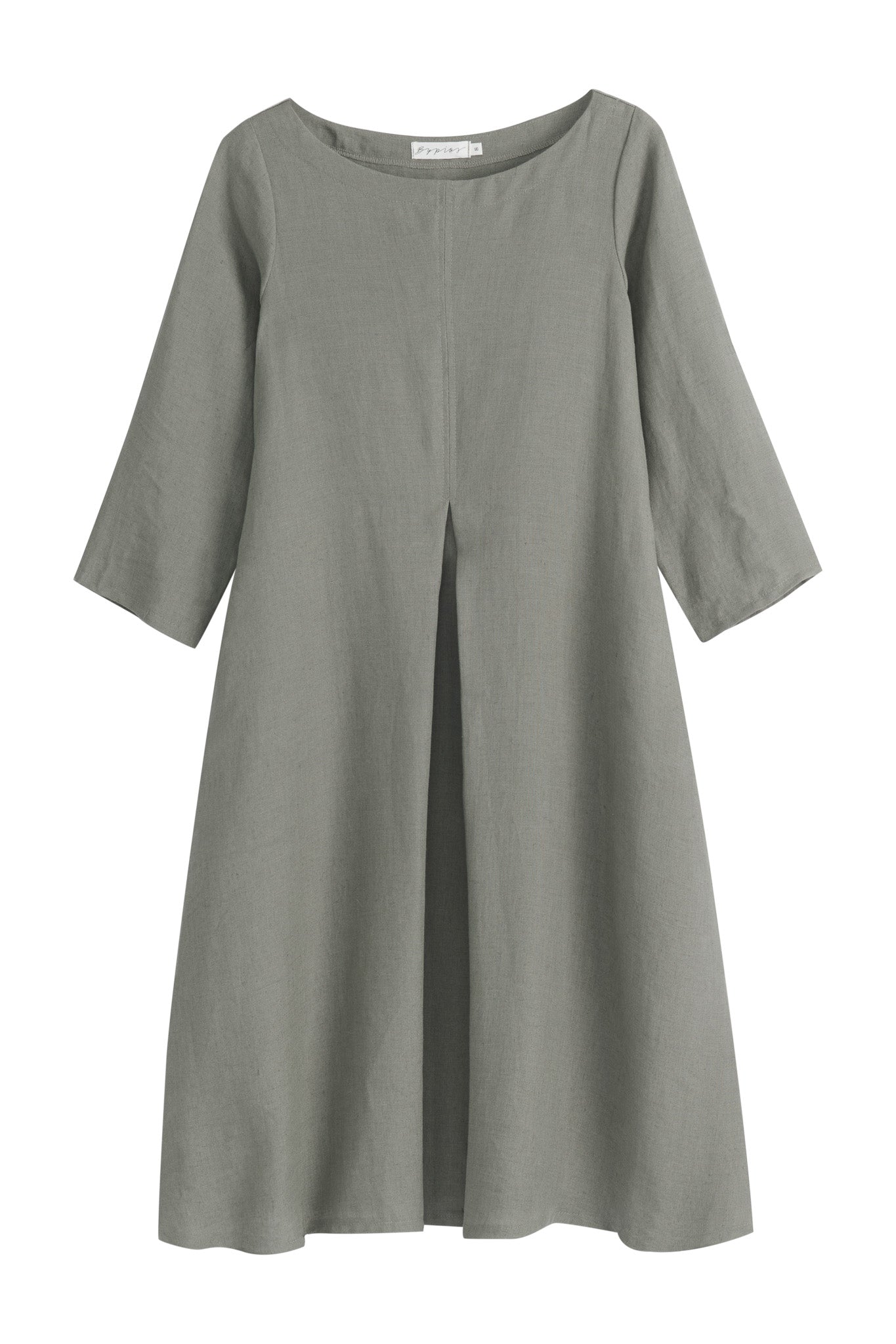 Pitkä ja yksinkertainen pellavamekko kauniilla laskoksella edessä. Mekossa pyöreä pääntie, sivutaskut ja vajailla hihoilla. Vyötäröllä solmittavat nyörit.