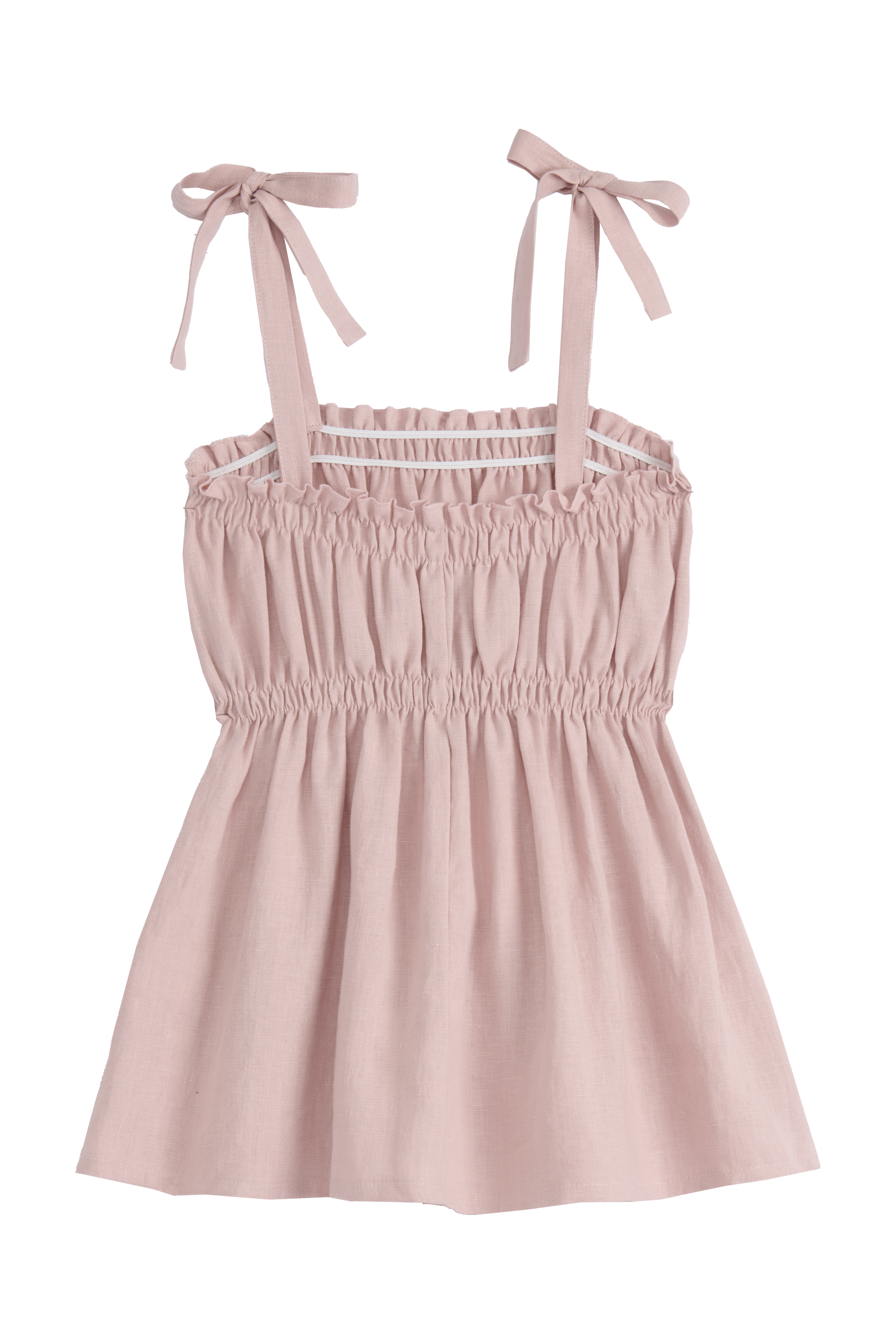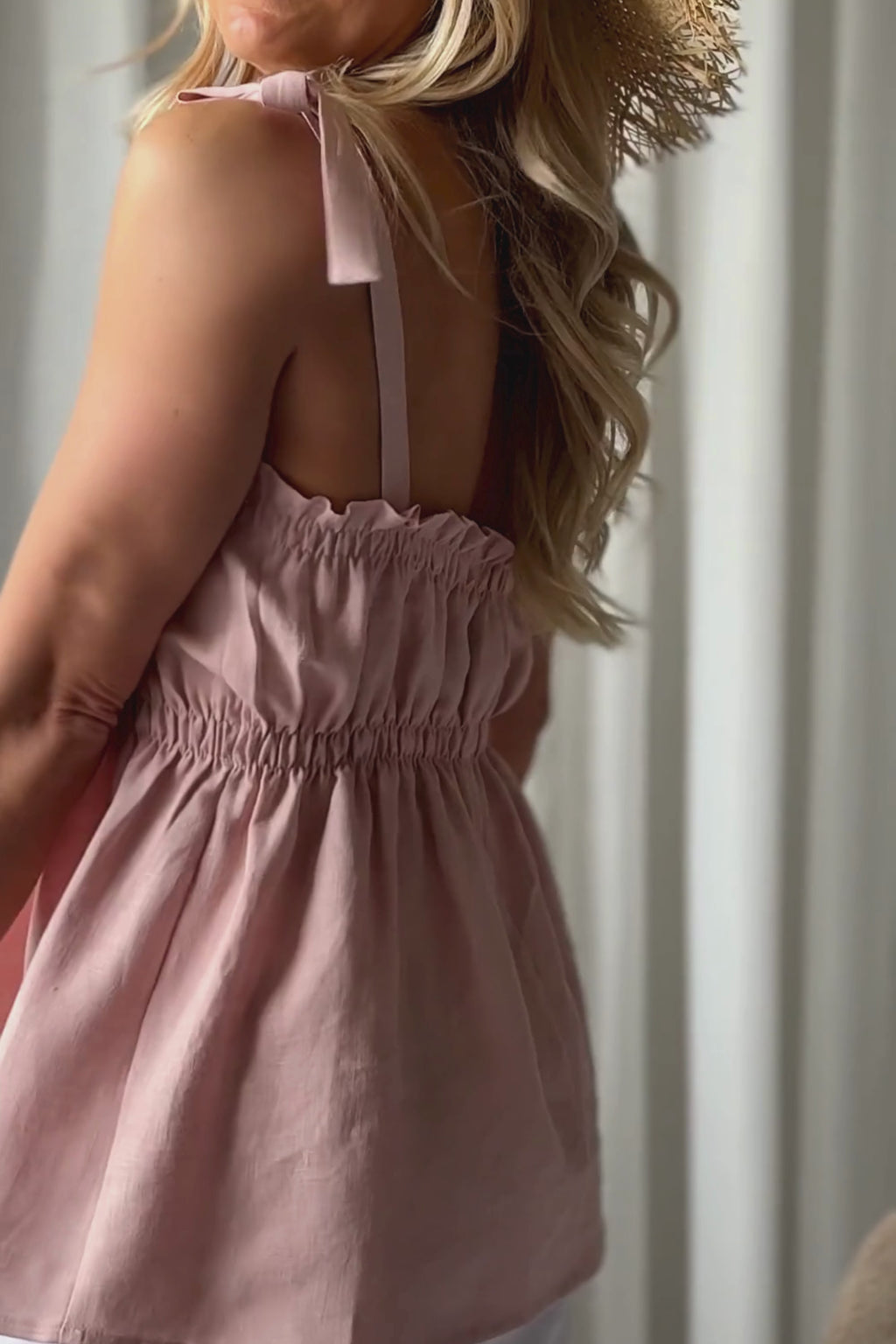 Ihanan kevyt ja ilmava toppi, jossa on solmittavat olkaimet istuvuuden säätämistä varten. Pehmeästi laskeutuva materiaali tuntuu miellyttävältä päällä, ja joustava rypytys rinnan ympärillä lisää mukavuutta ja istuvuutta. Yläreunassa sekä rintamuksen alla resorit.
