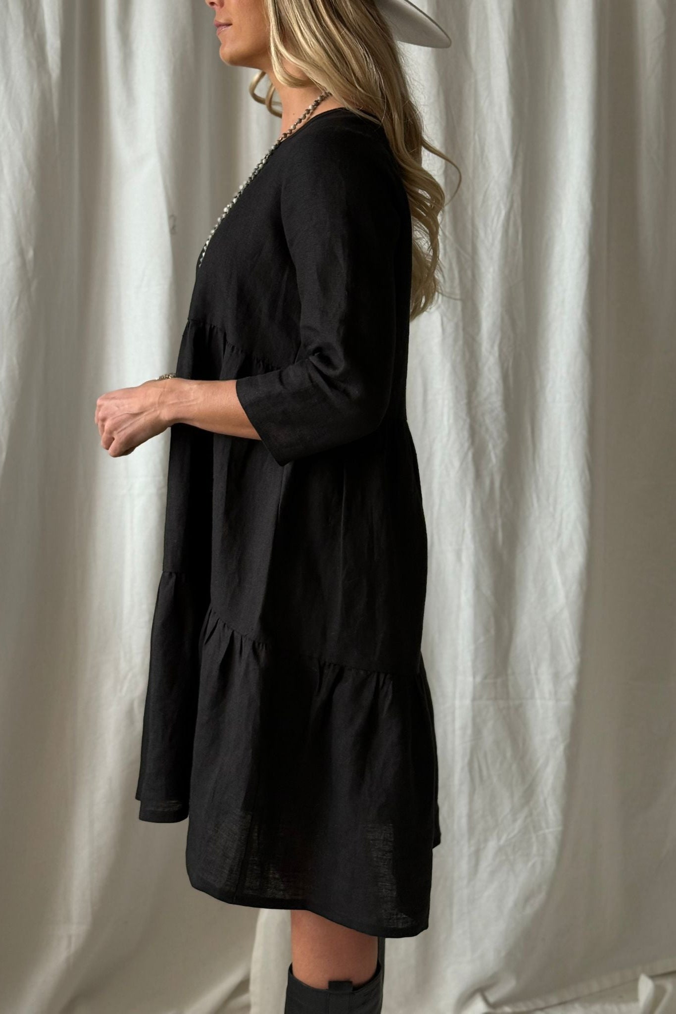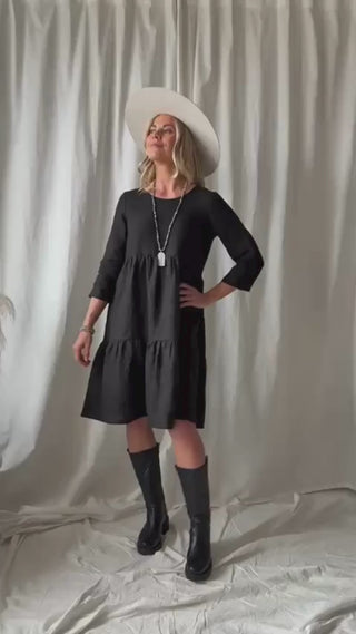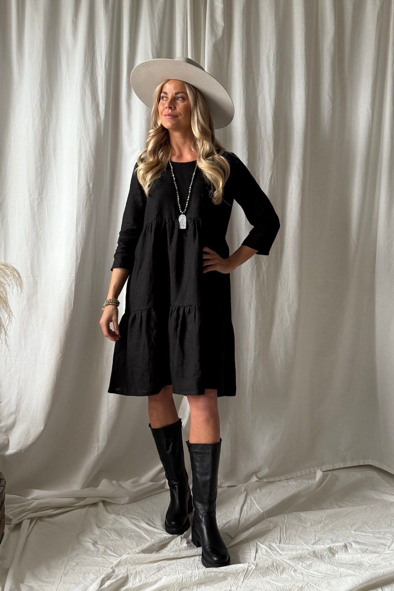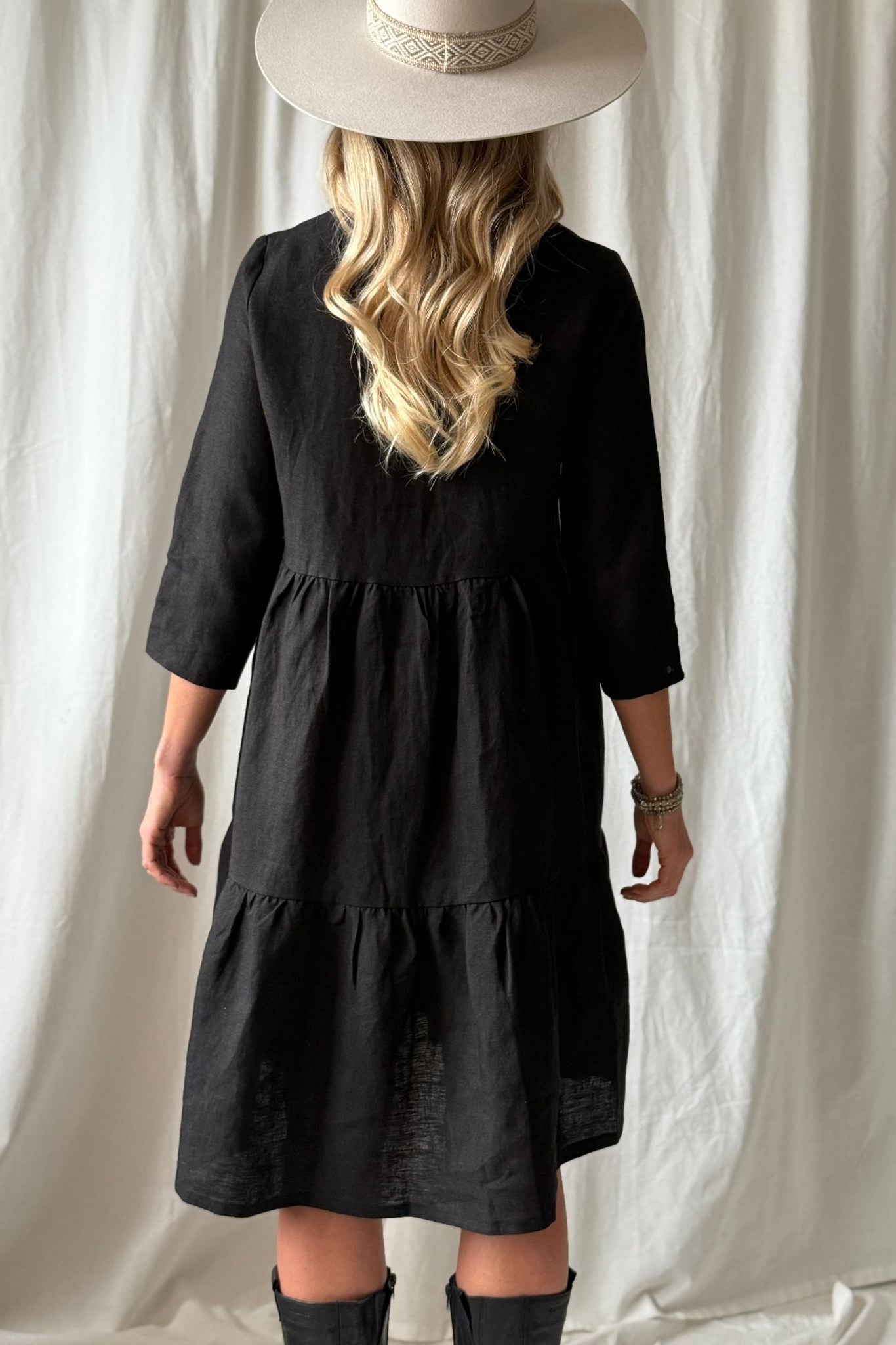 BYPIAS pellavamekkojen ajaton klassikko arkeen kuin juhlaan. Frillahelmaisessa mekossa polvet peittävä pituus ja pyöreä pääntie. 3/4 hihanpituus toimii joka sesonkiin.