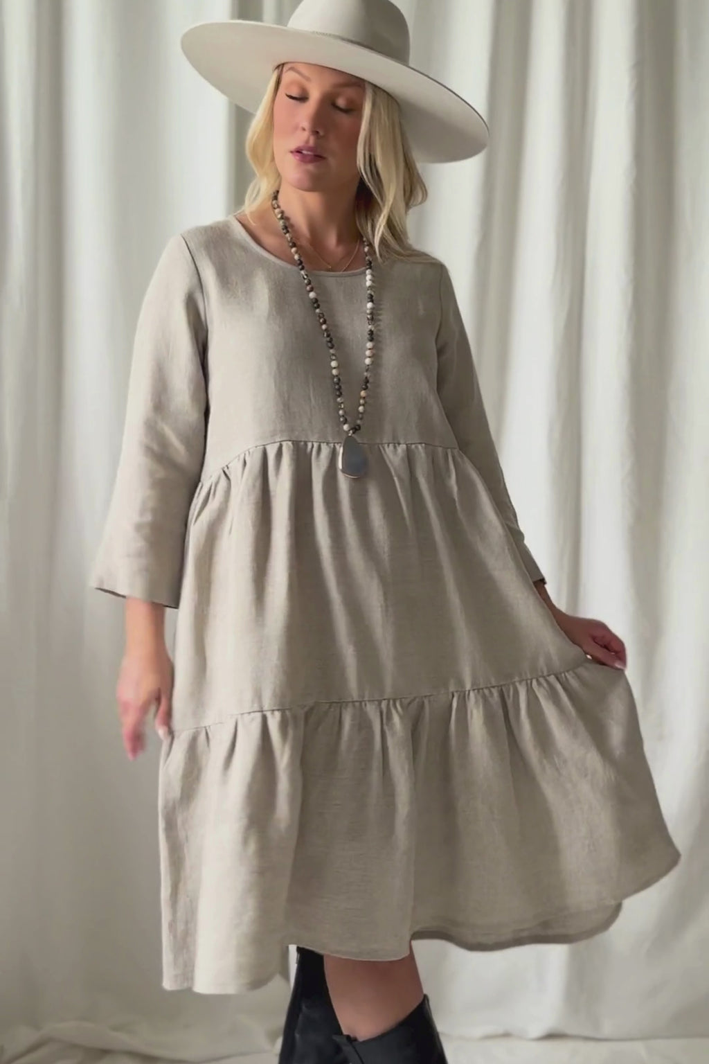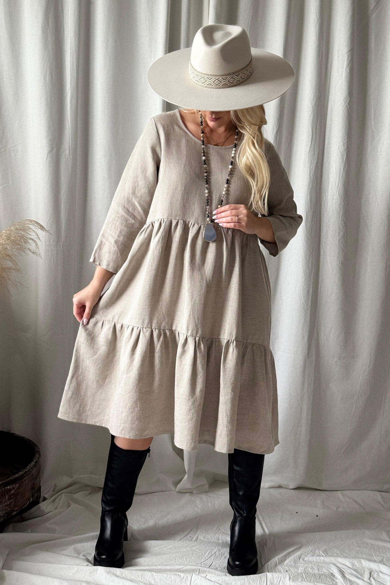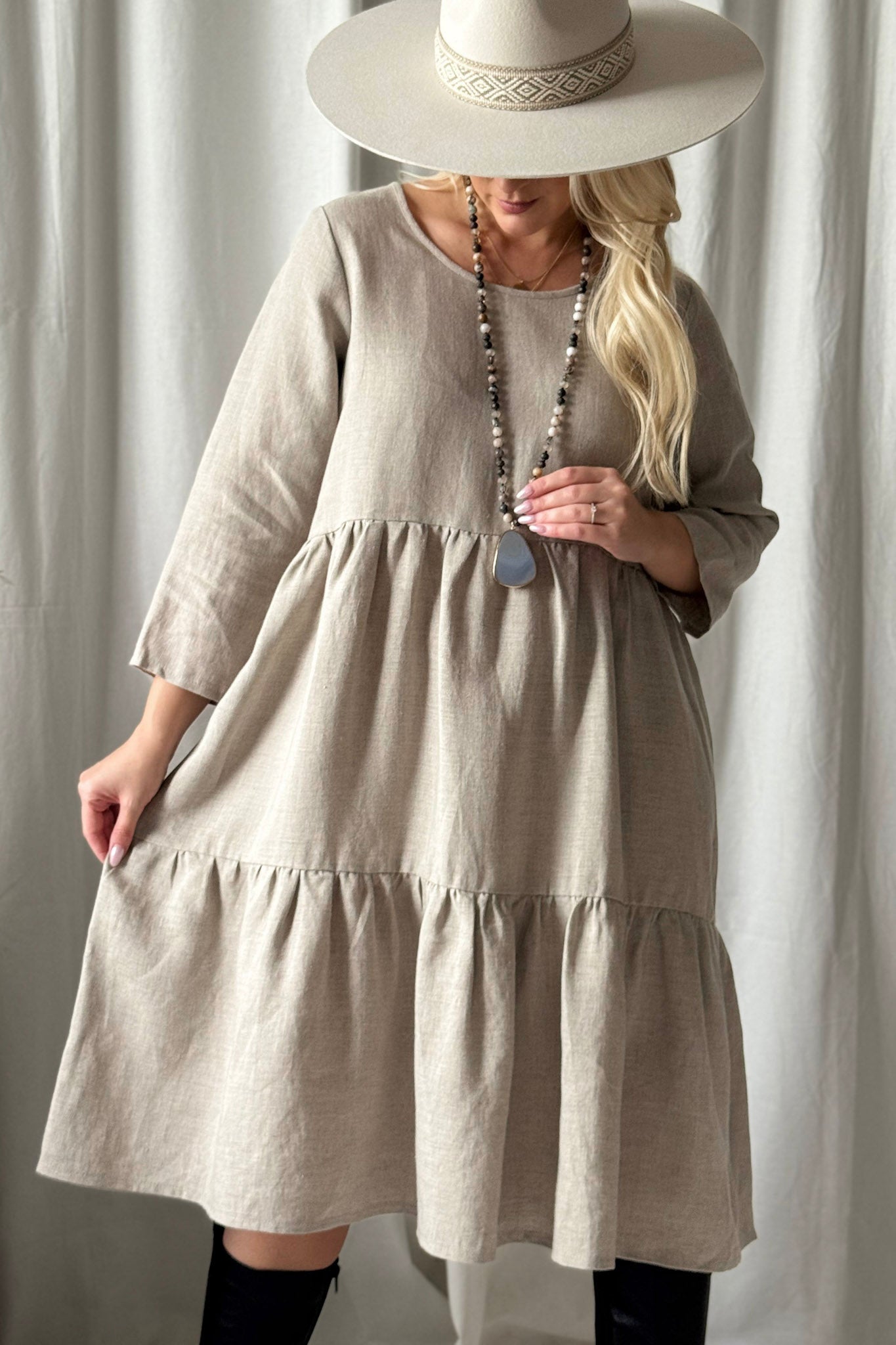 BYPIAS pellavamekkojen ajaton klassikko arkeen kuin juhlaan. Frillahelmaisessa mekossa polvet peittävä pituus ja pyöreä pääntie. 3/4 hihanpituus toimii joka sesonkiin.