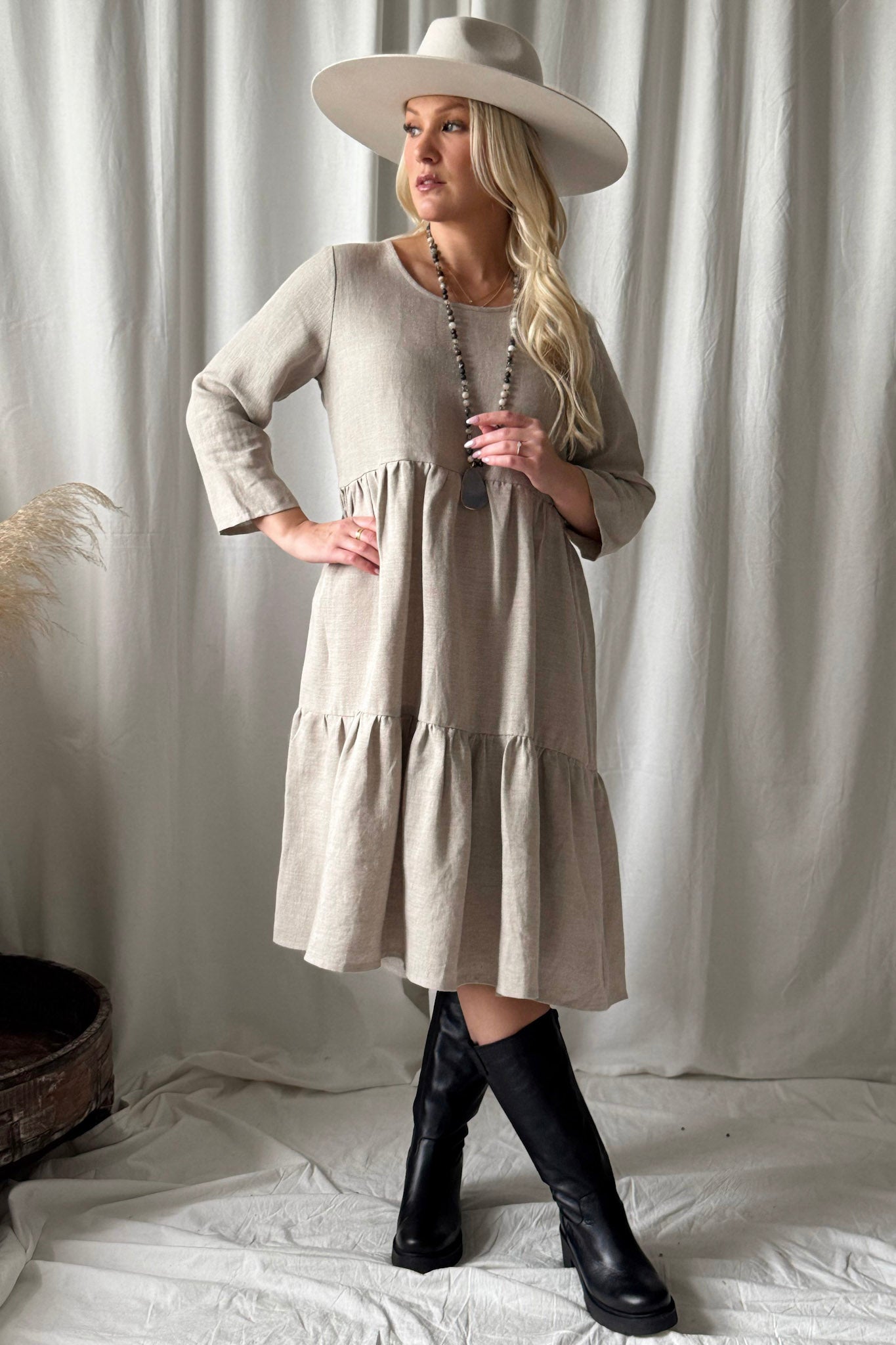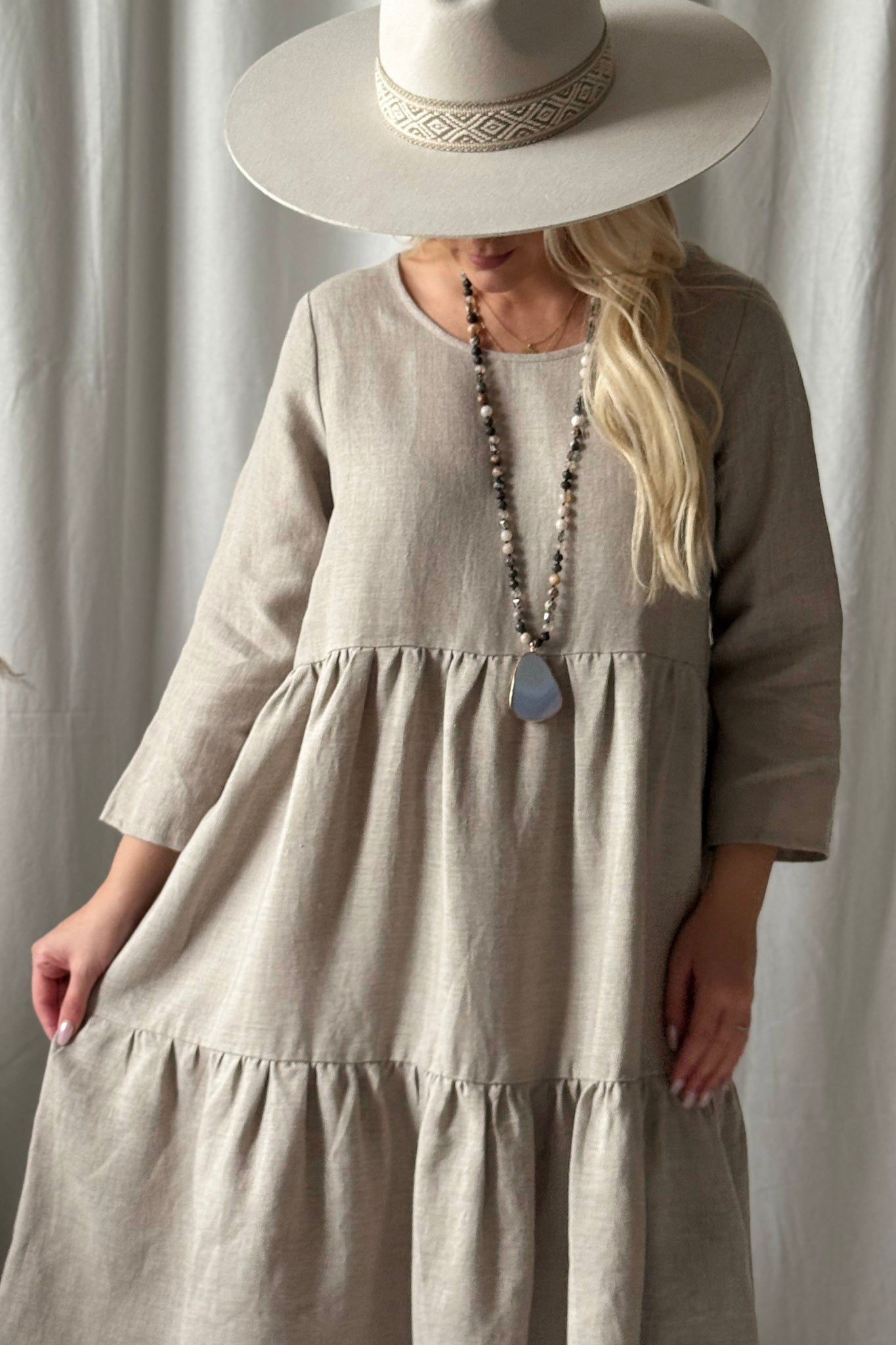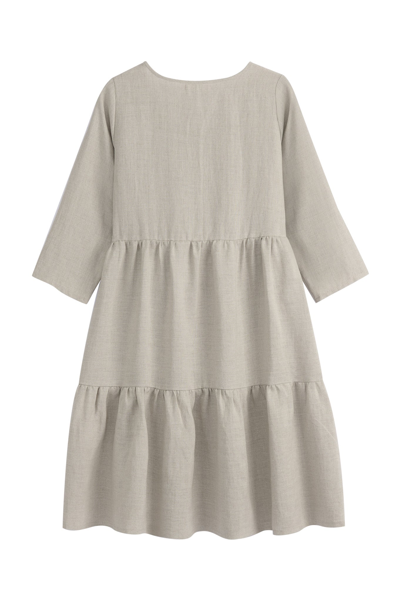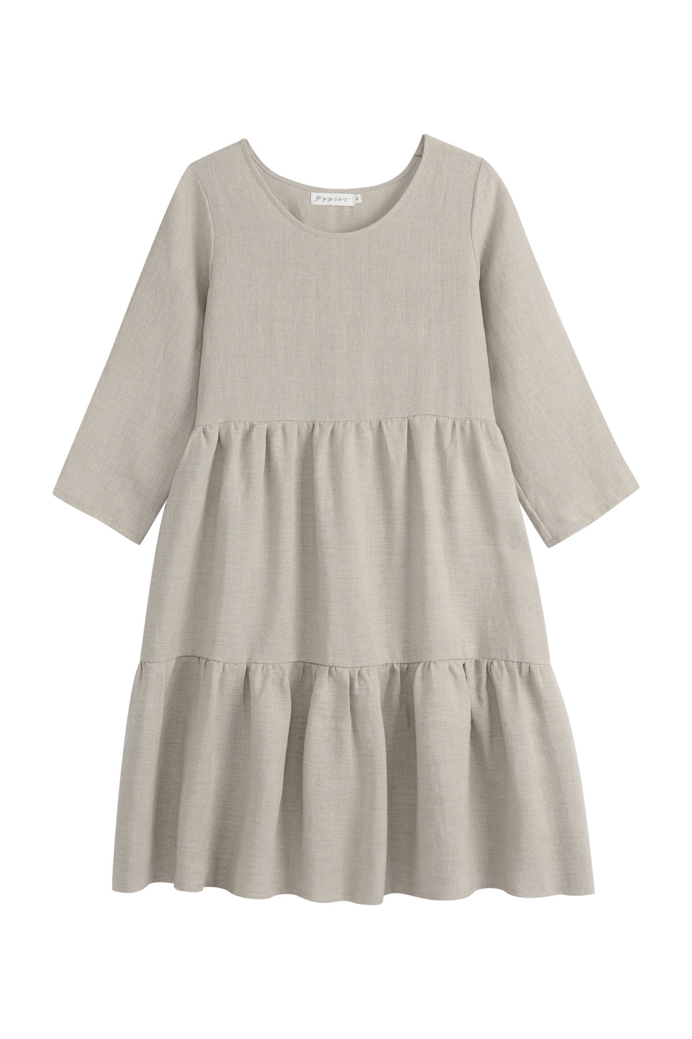 BYPIAS pellavamekkojen ajaton klassikko arkeen kuin juhlaan. Frillahelmaisessa mekossa polvet peittävä pituus ja pyöreä pääntie. 3/4 hihanpituus toimii joka sesonkiin.