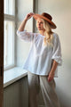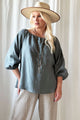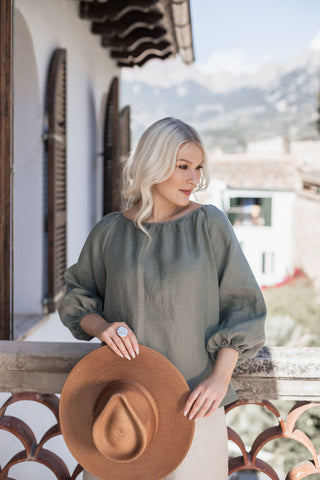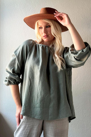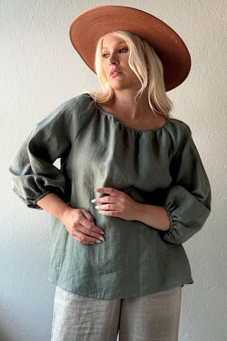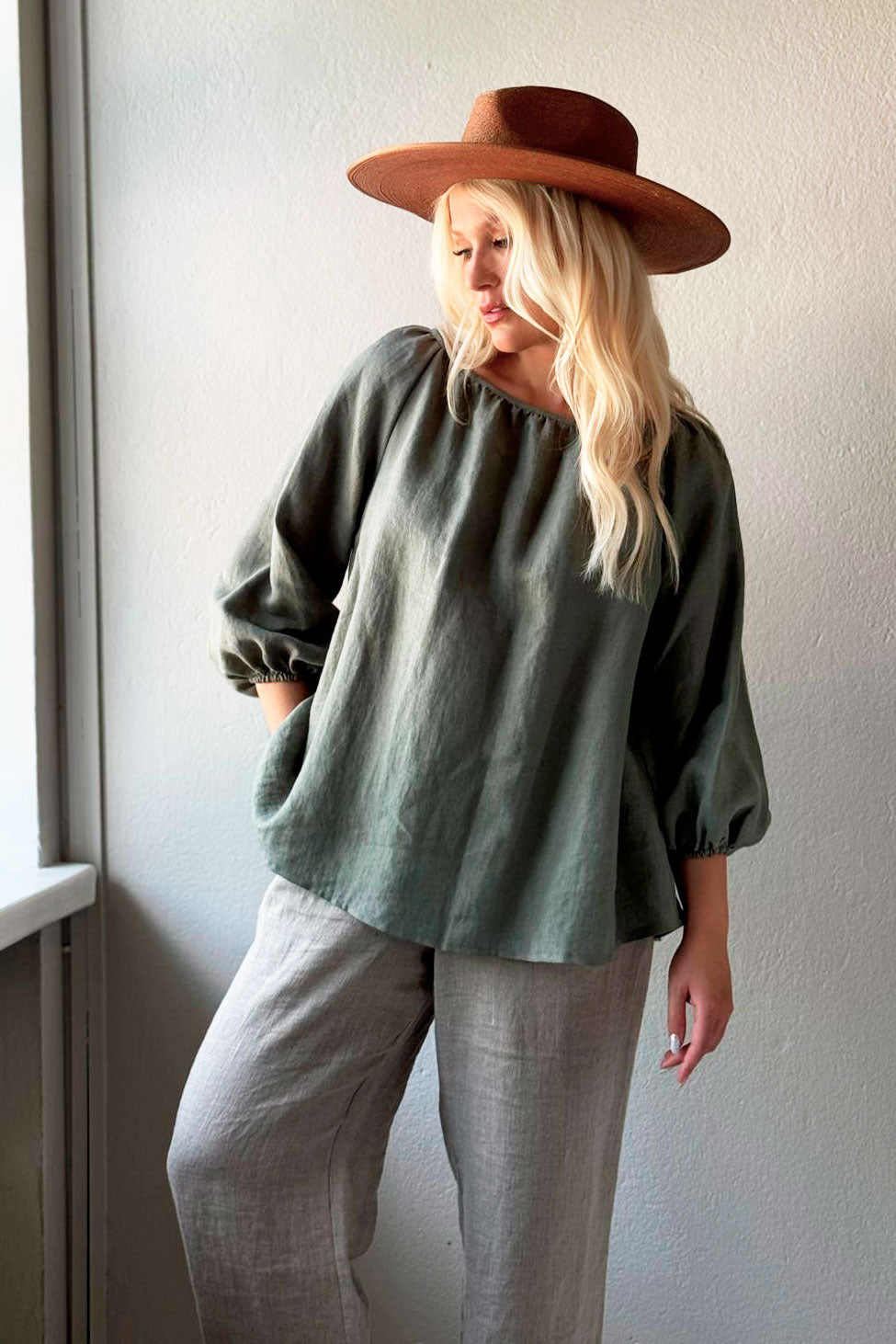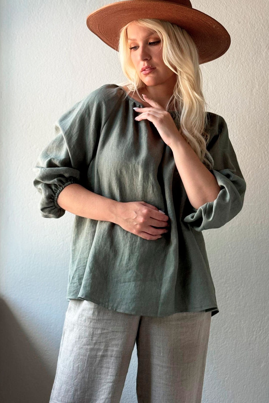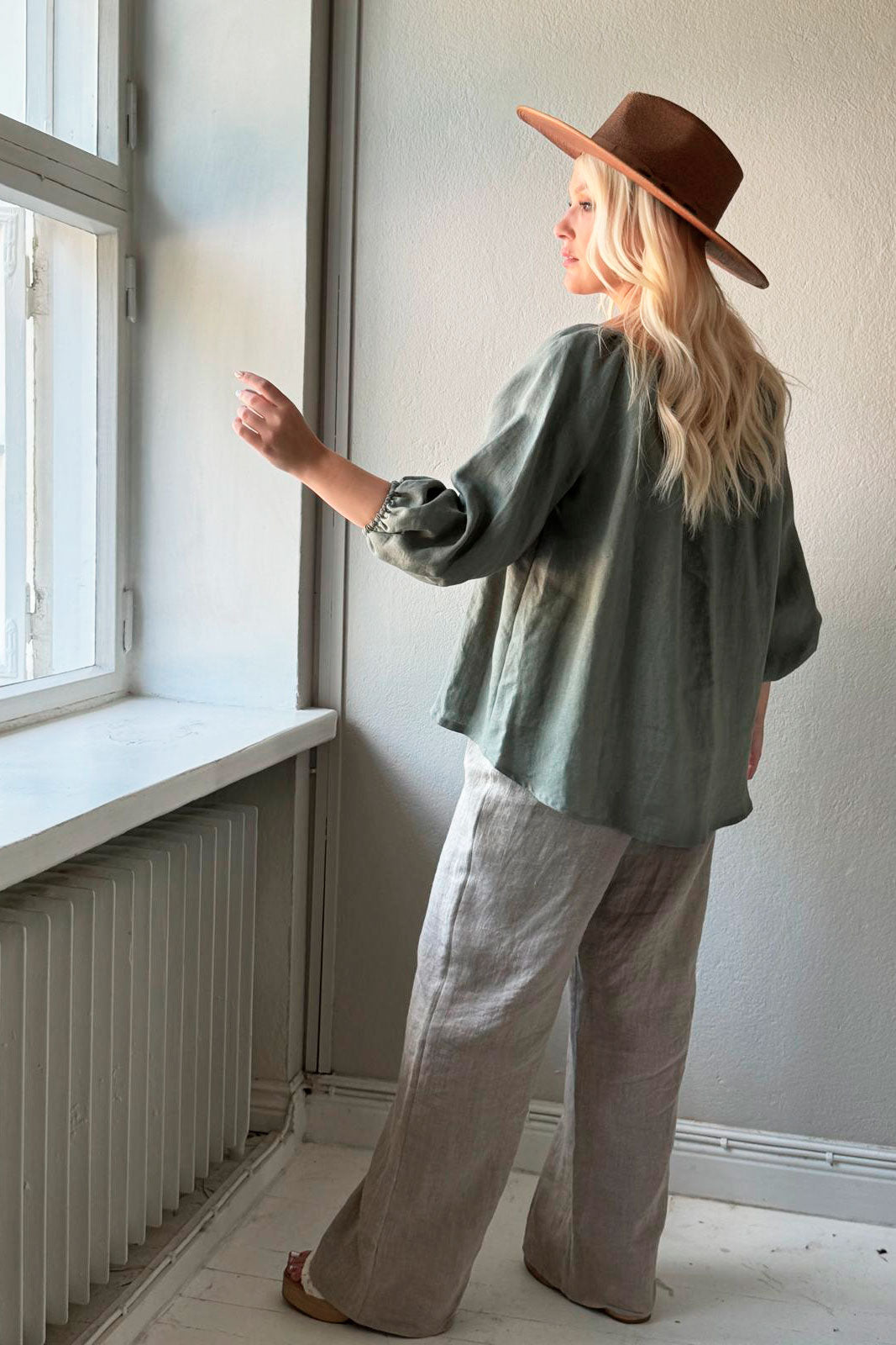 Klassinen pellavapusero, jossa avara pääntie joustorypytyksellä. 3/4-hihat, joissa rypytys hihansuissa.