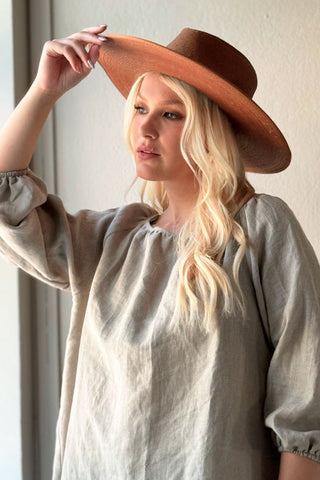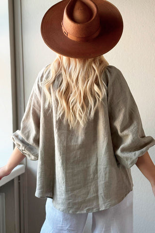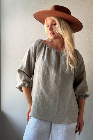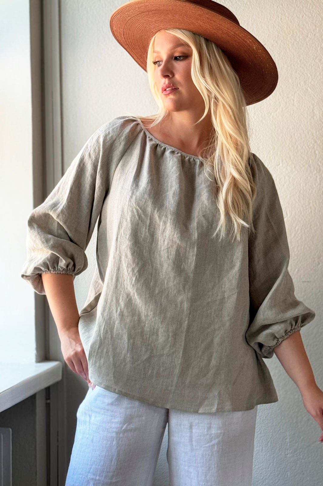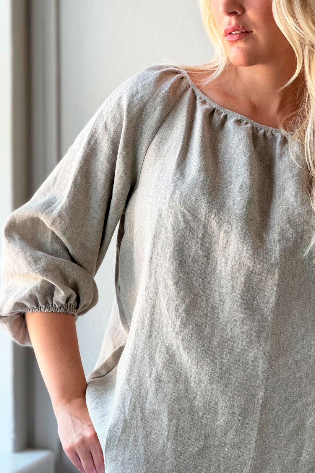 Klassinen pellavapusero, jossa avara pääntie joustorypytyksellä. 3/4-hihat, joissa rypytys hihansuissa.