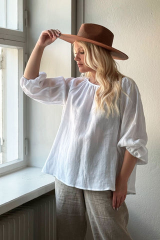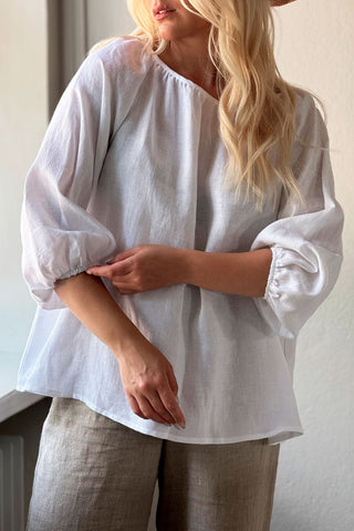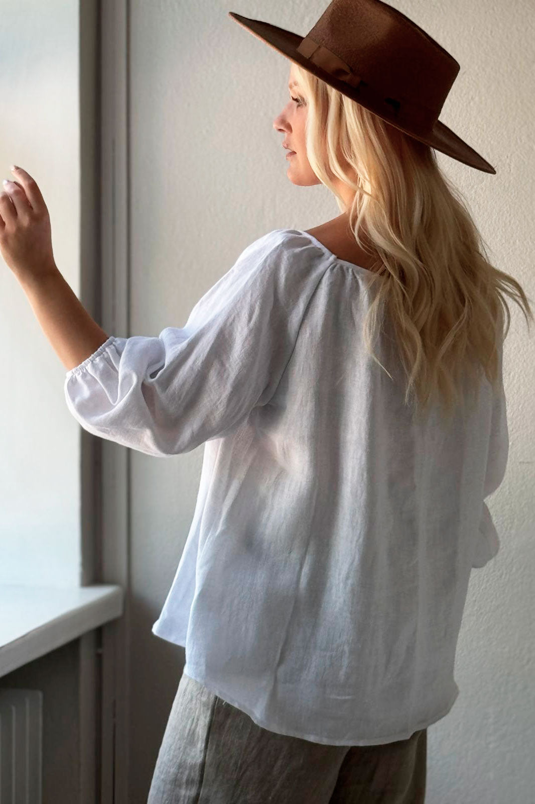 Klassinen pellavapusero, jossa avara pääntie joustorypytyksellä. 3/4-hihat, joissa rypytys hihansuissa.