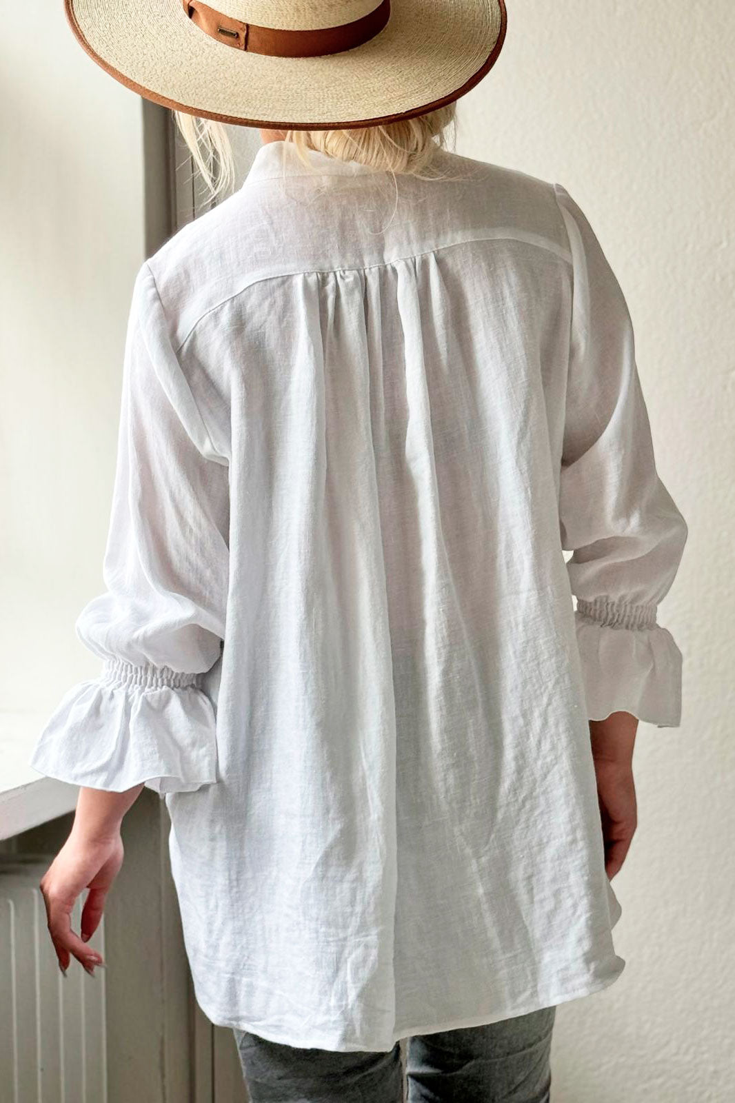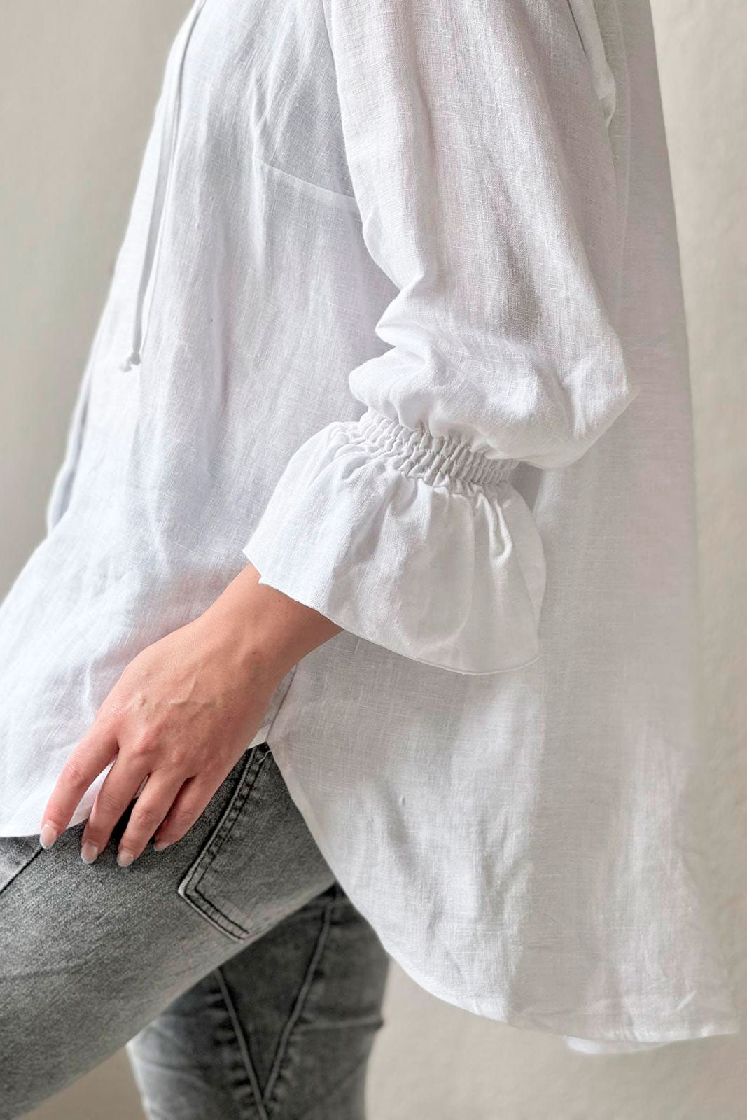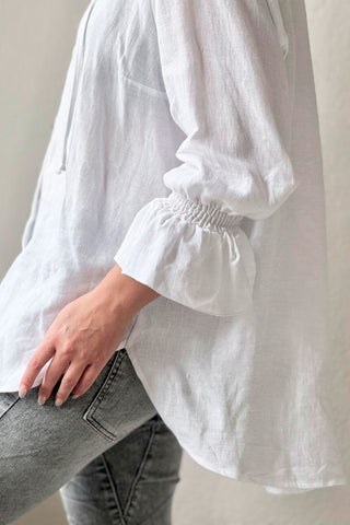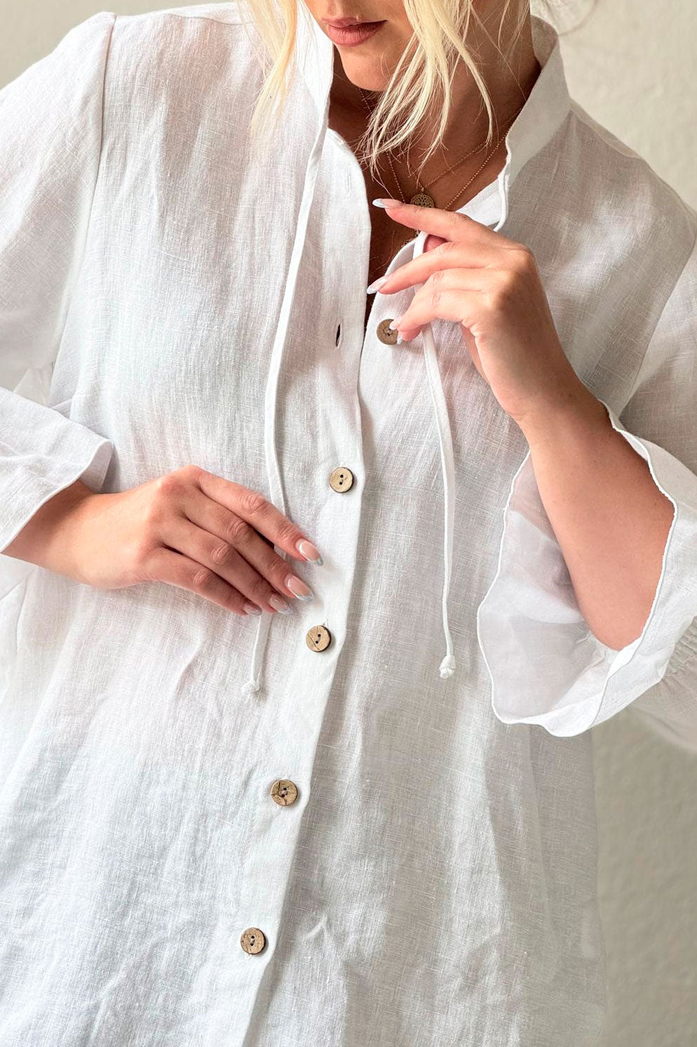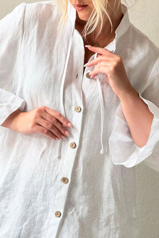 Klassinen pellavapaita, jossa kuminauhat ranteiden kohdalla ja solmittavat nauhat pääntiessä. Pystykaulus.