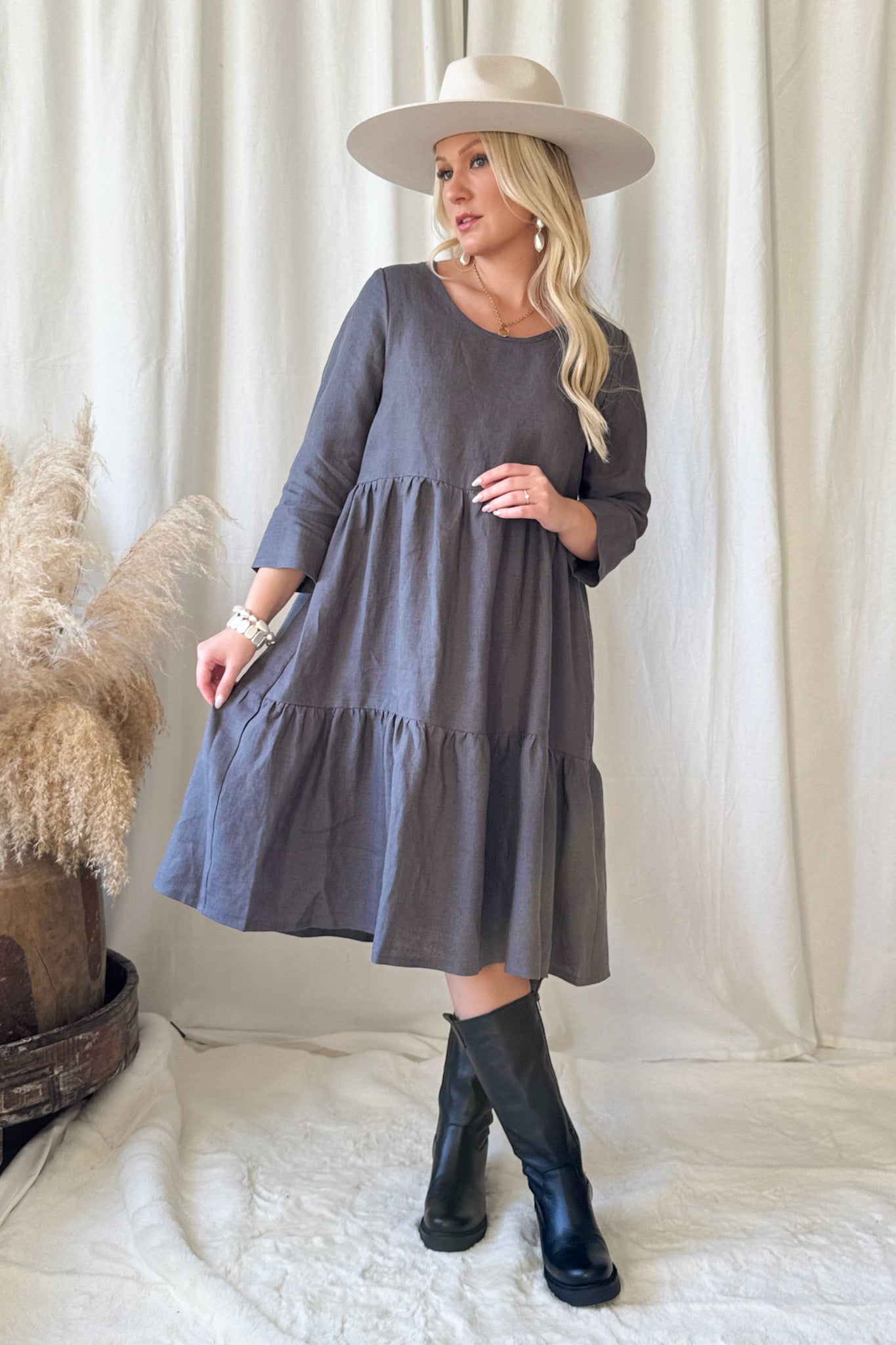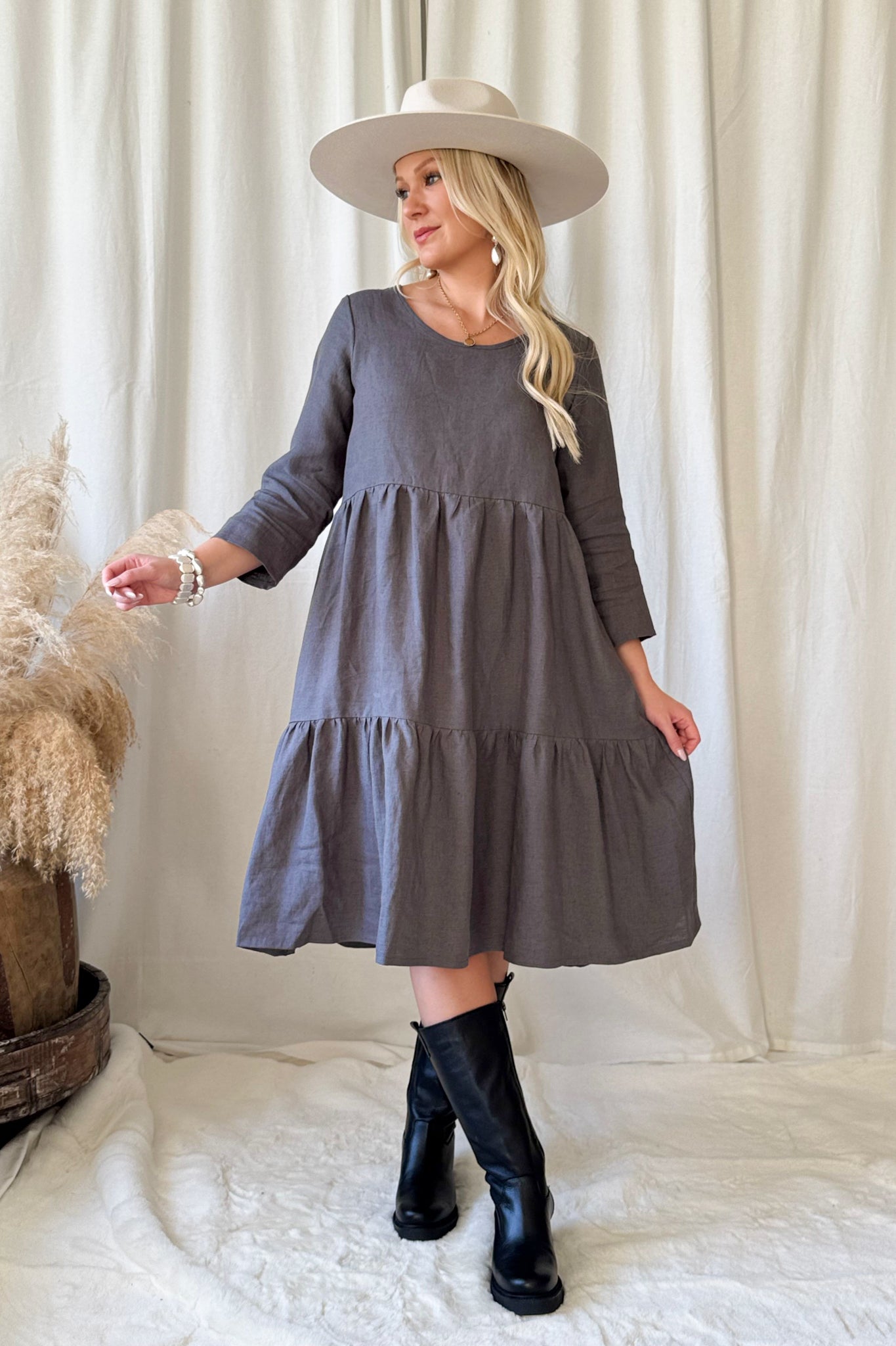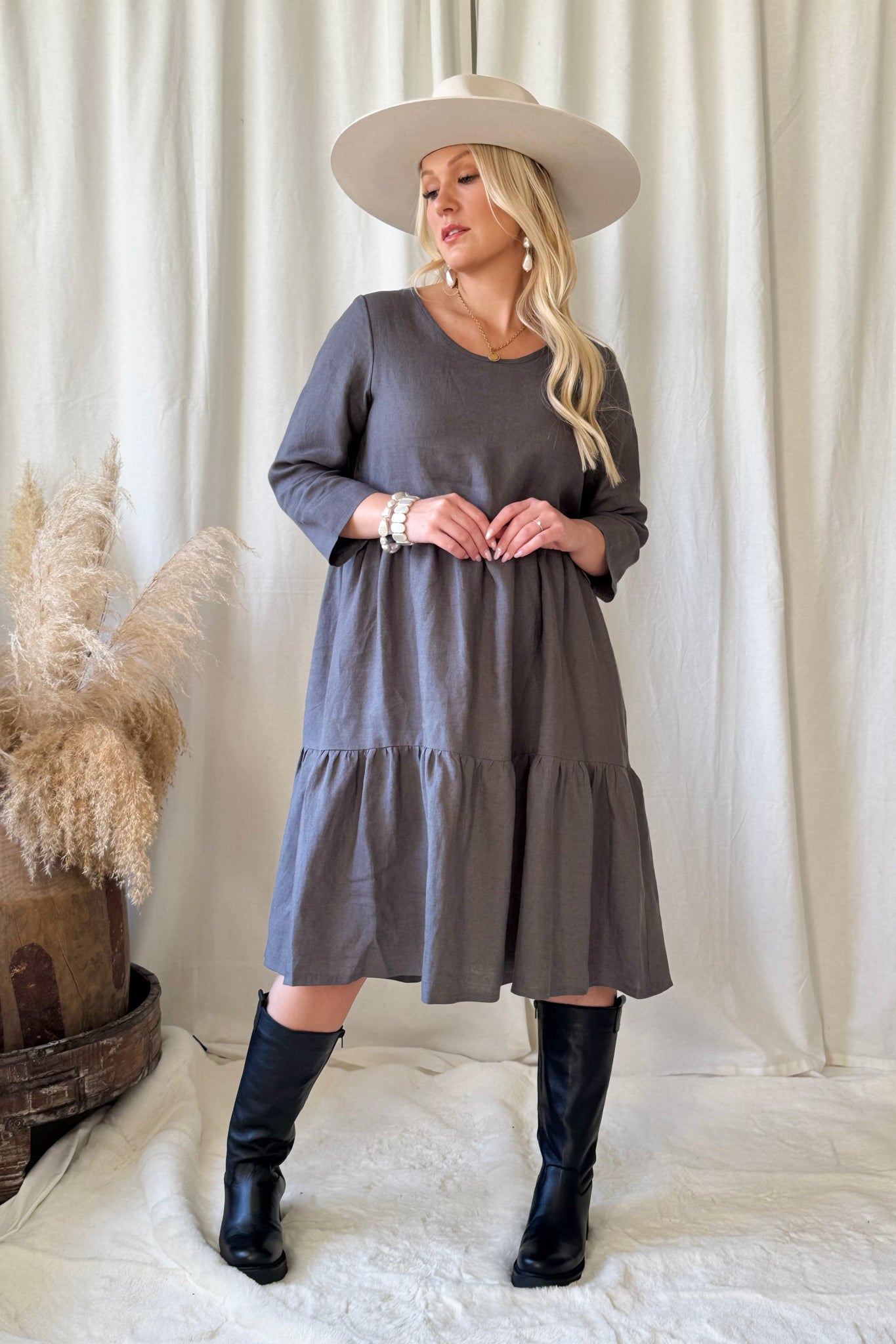BYPIAS pellavamekkojen ajaton klassikko arkeen kuin juhlaan. Frillahelmaisessa mekossa polvet peittävä pituus ja pyöreä pääntie. 3/4 hihanpituus toimii joka sesonkiin.