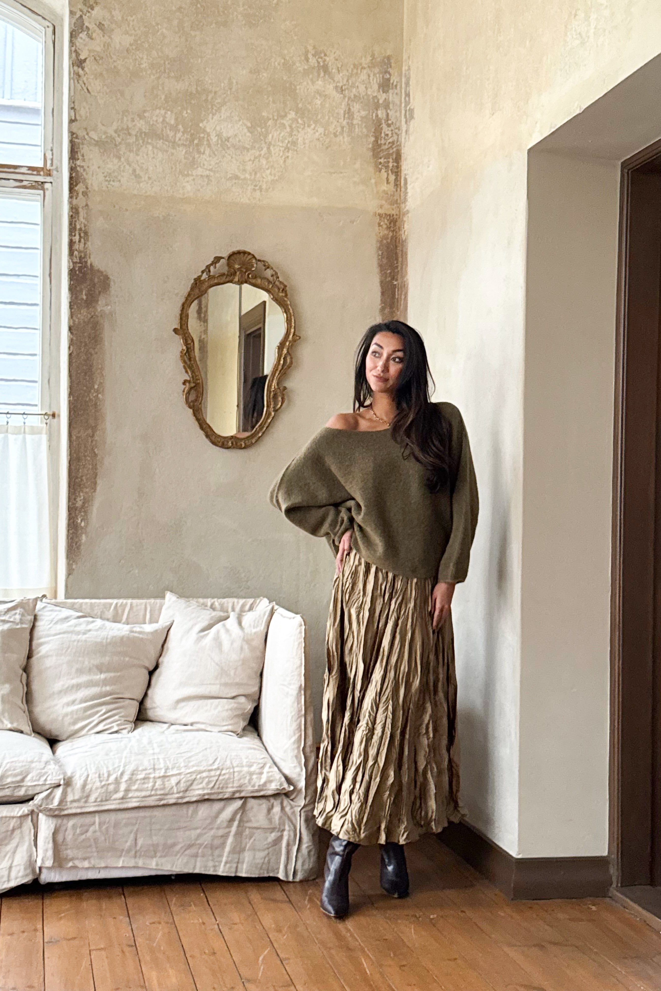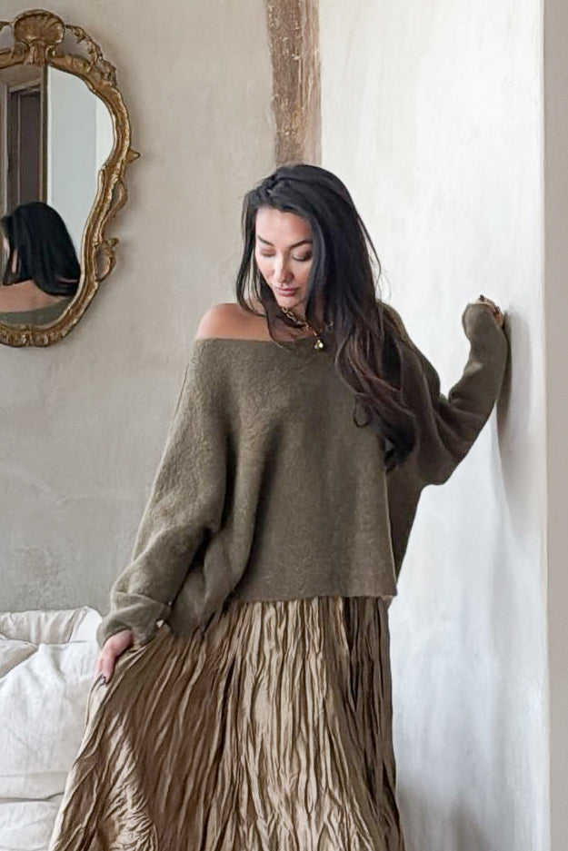 Ihanan pehmeä ja ylellinen neule, jossa venepääntie ja raglanhihat. Vajaamittainen malli, joka käy hyvin myös mekkojen ja paitisten päälle. Hyvin joustava materiaali.
