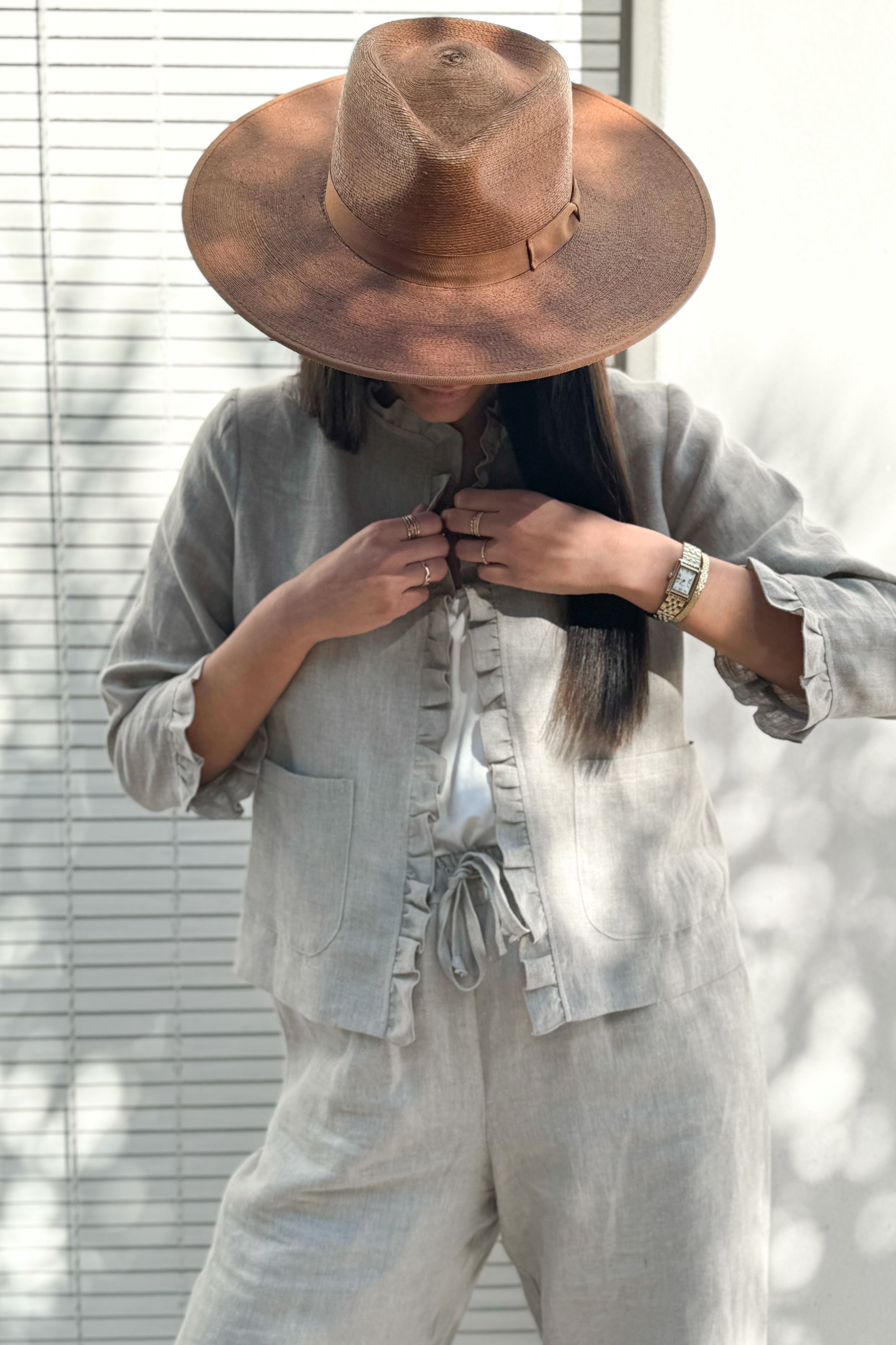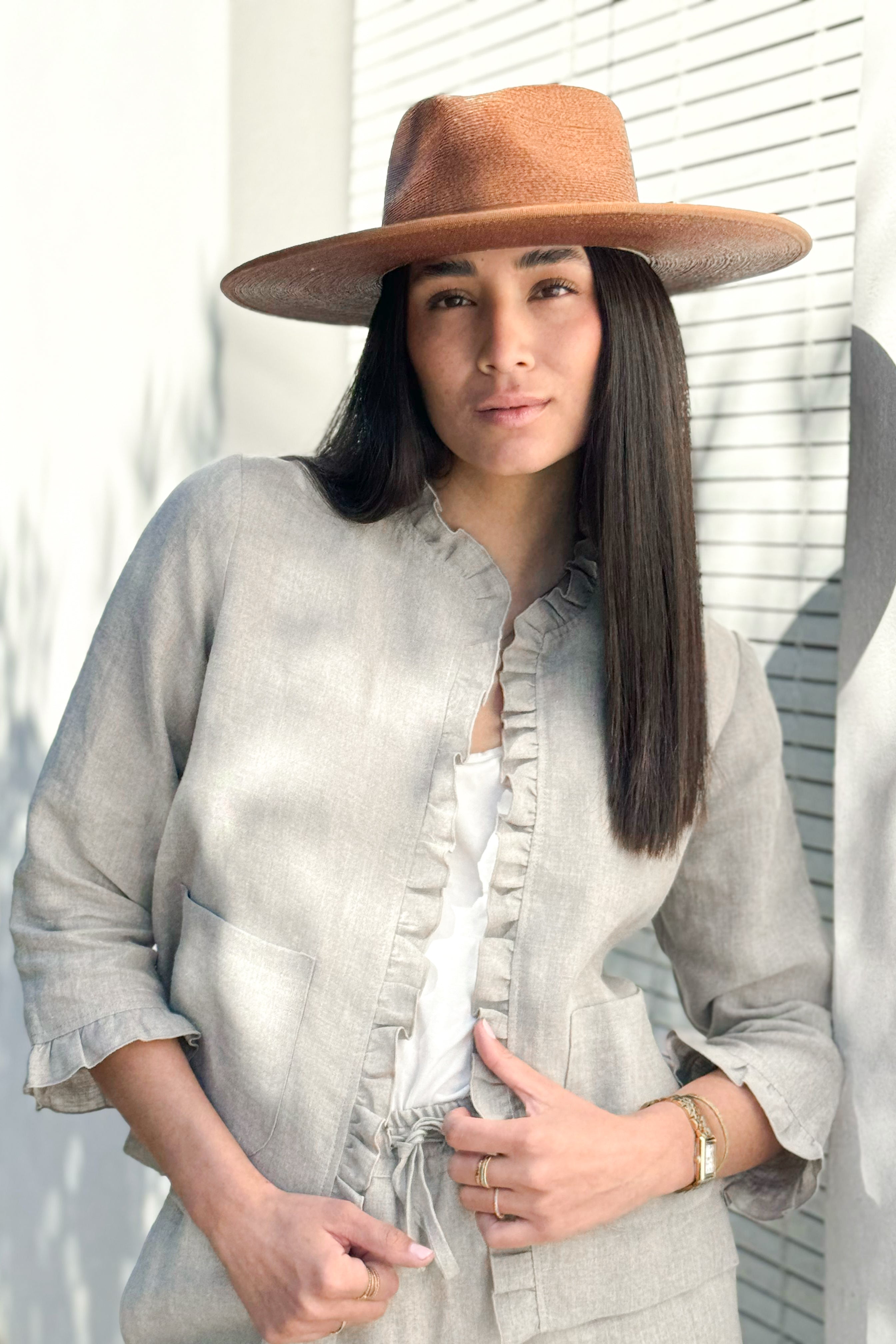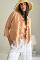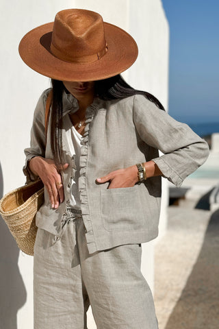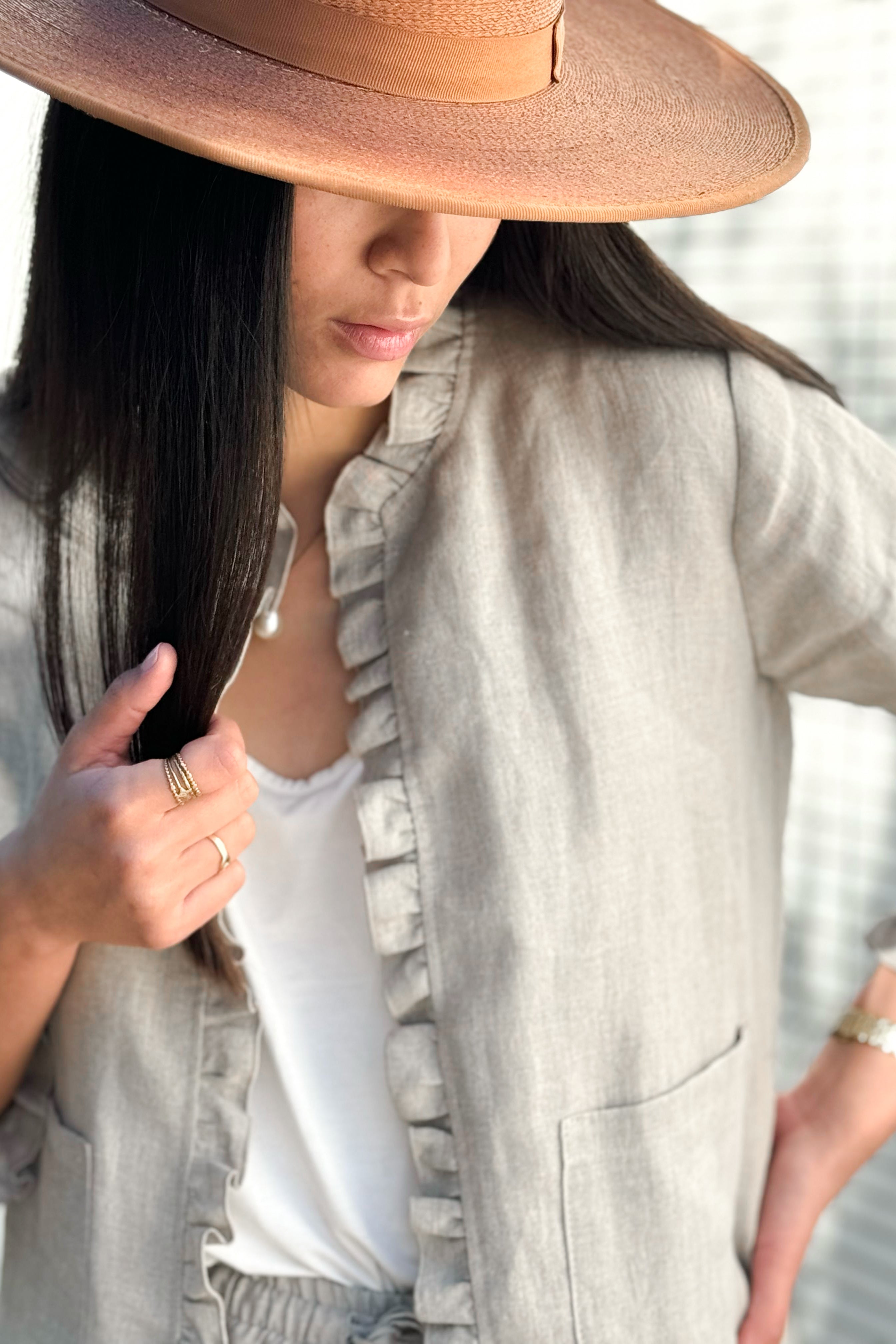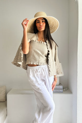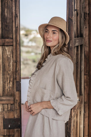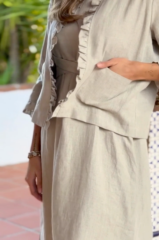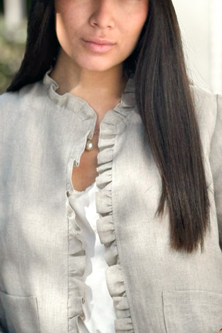 Kaunis, vyötärömittainen pellavabolero, jossa upea röyhelö reunassa. 3/4-pituiset hihat.