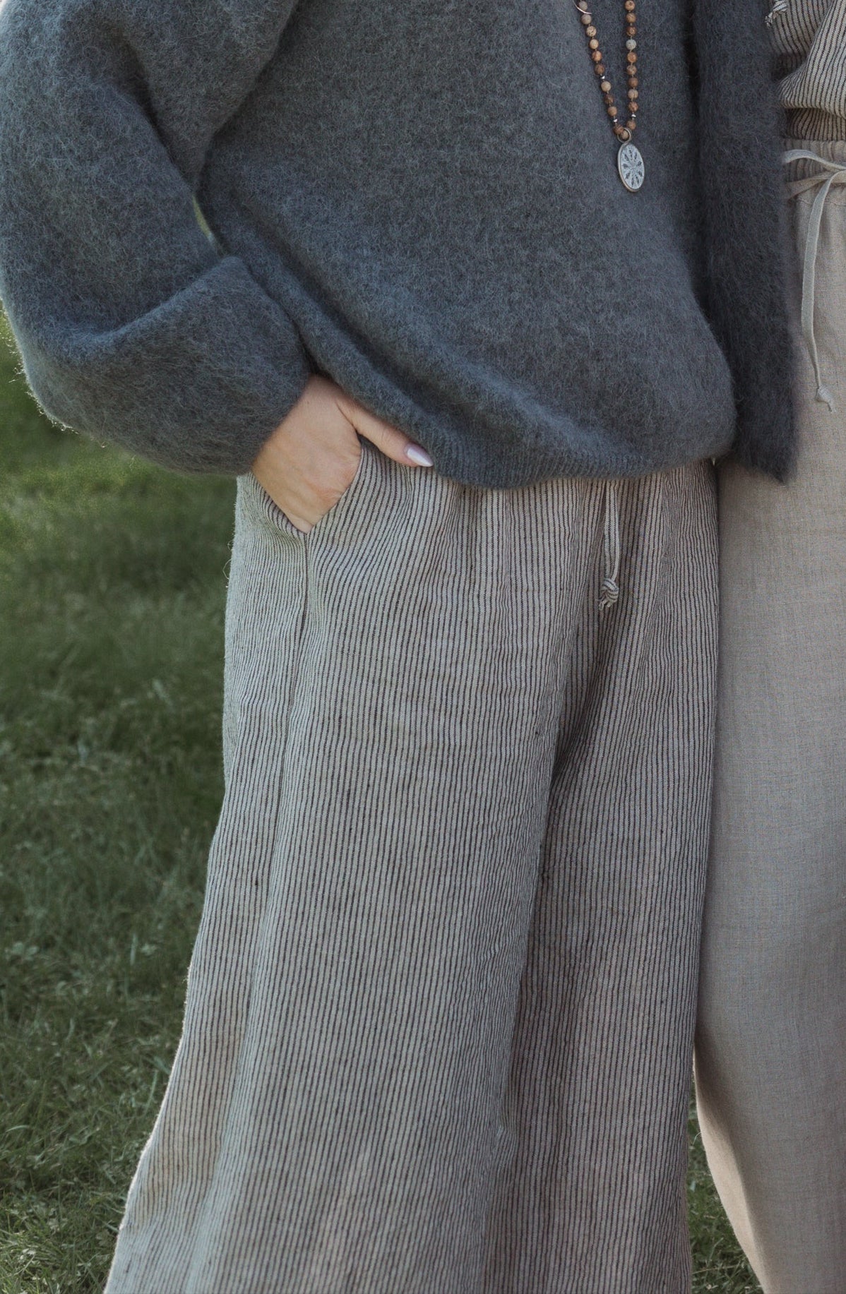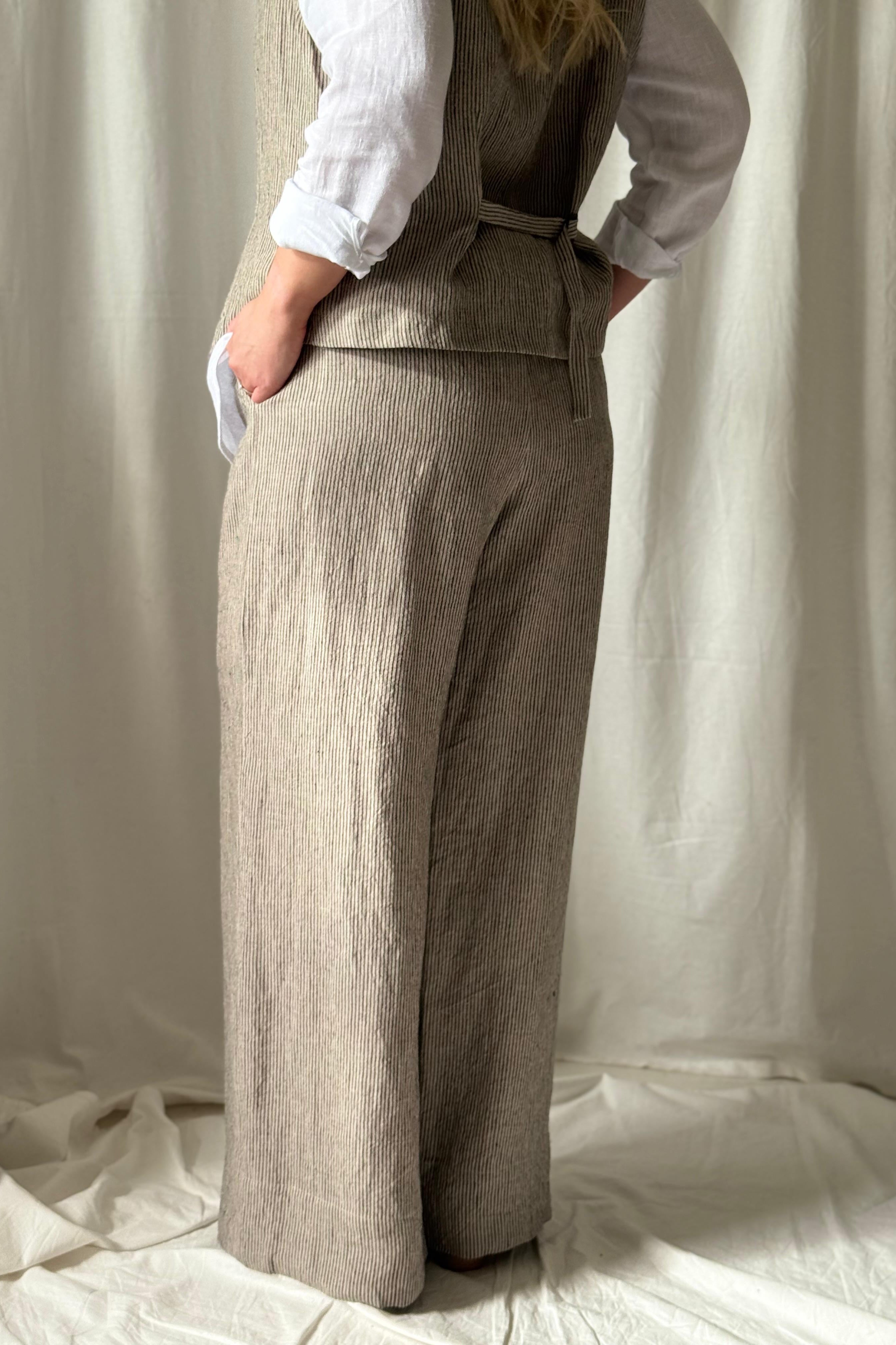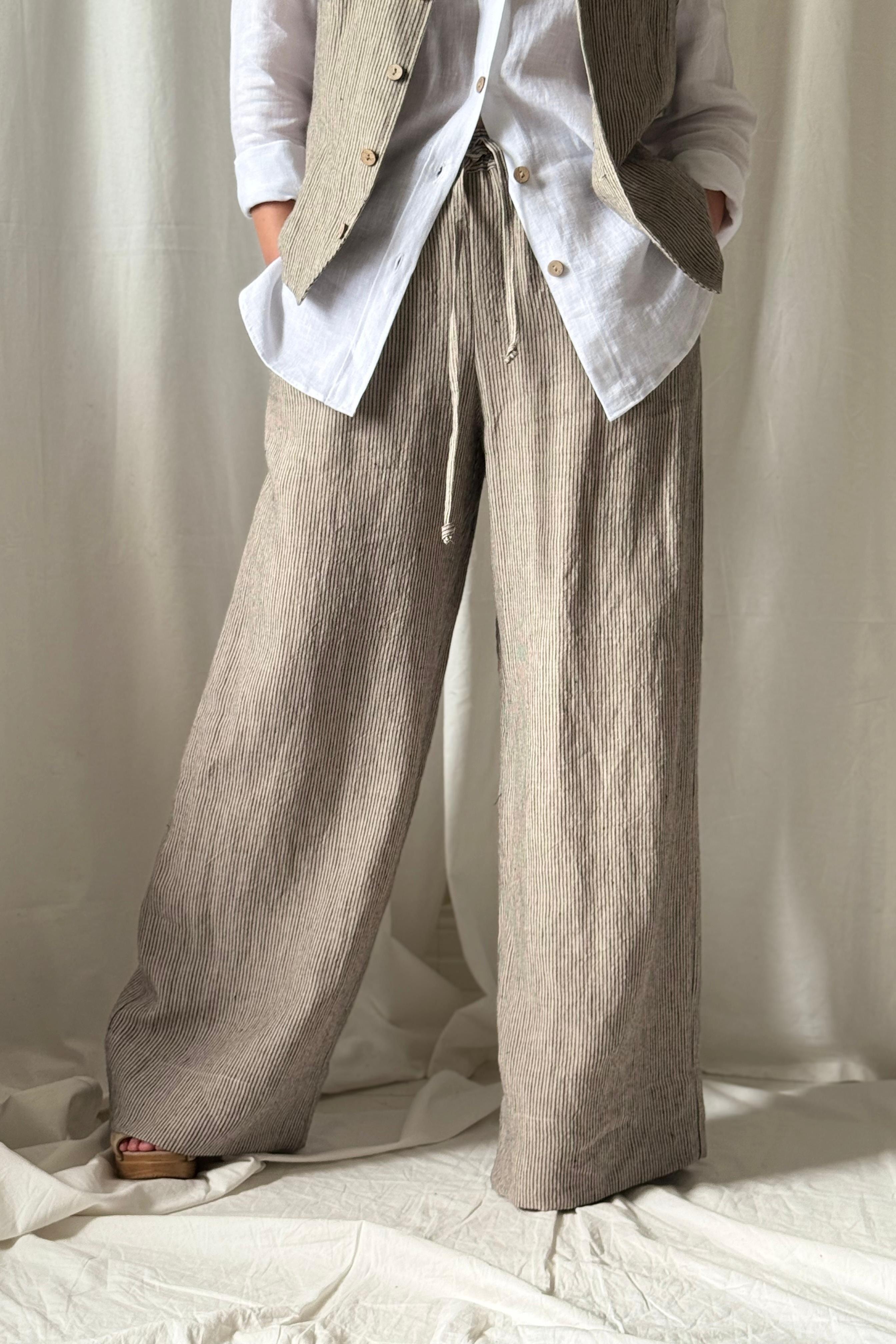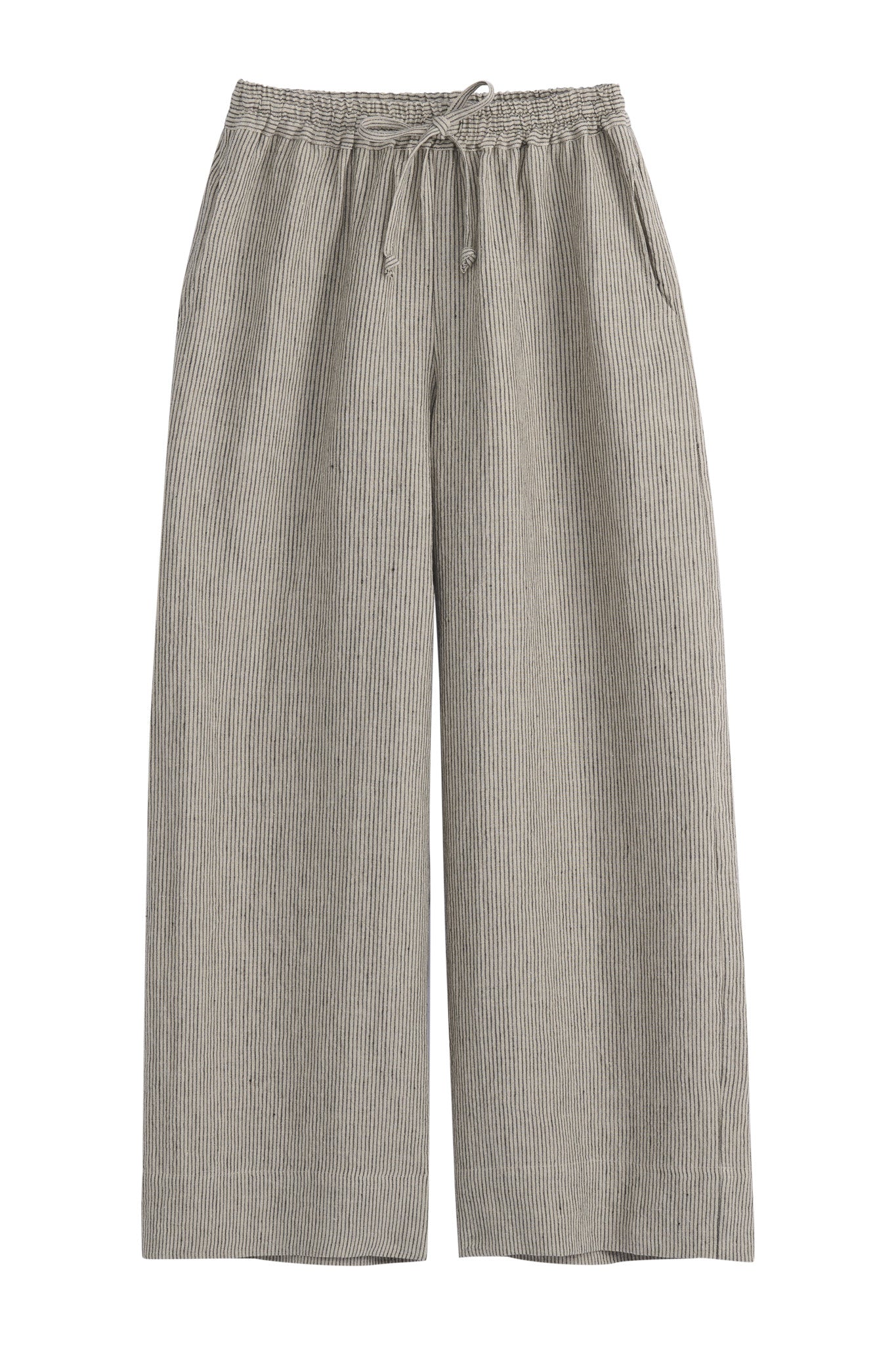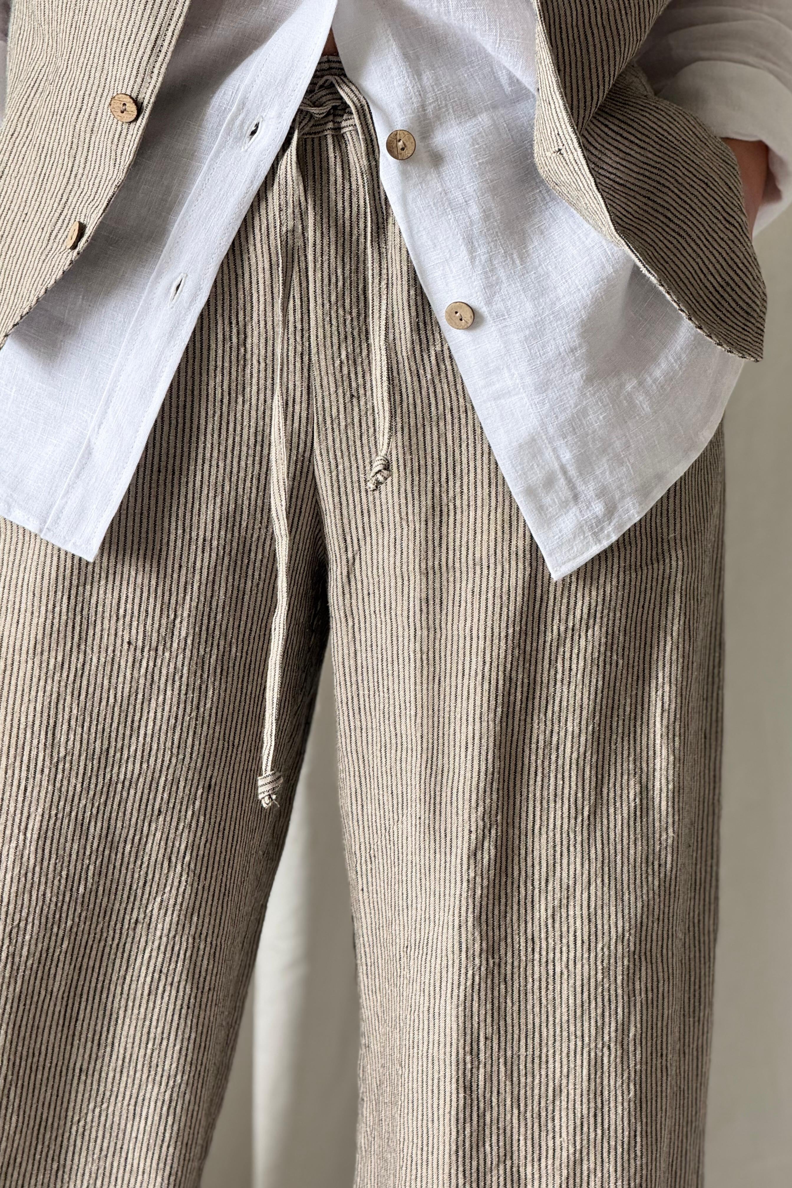 Klassiset pellavahousut aavistuksen levenevillä lahkeilla. Housuissa on sivutaskut ja joustava resorivyötärö kiristysnyörillä. Valmistettu ohuemmasta pellavasta, joka laskeutuu kauniisti. Yhdistä nämä housut esimerkiksi Linen Blazer pellavajakun pariksi.