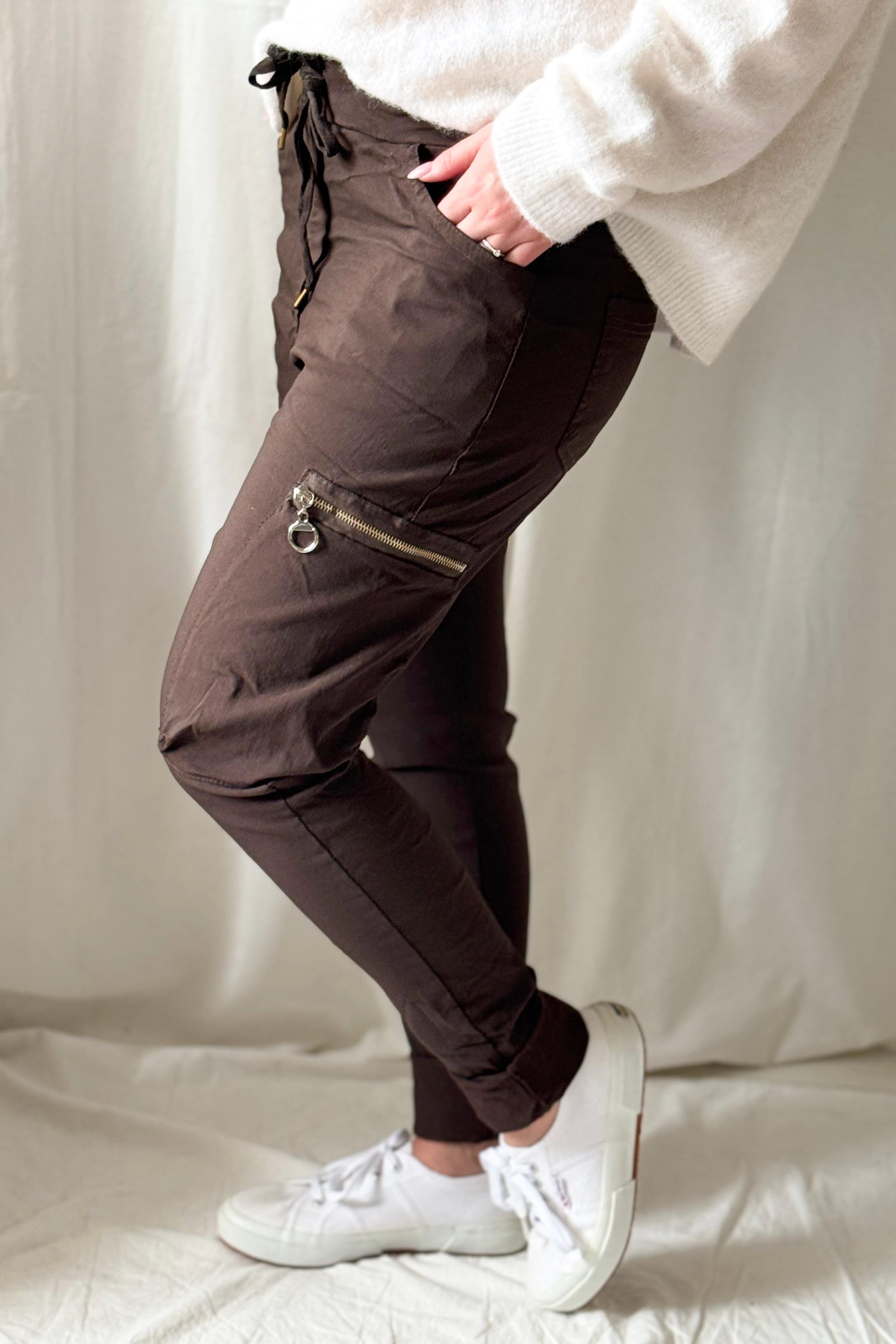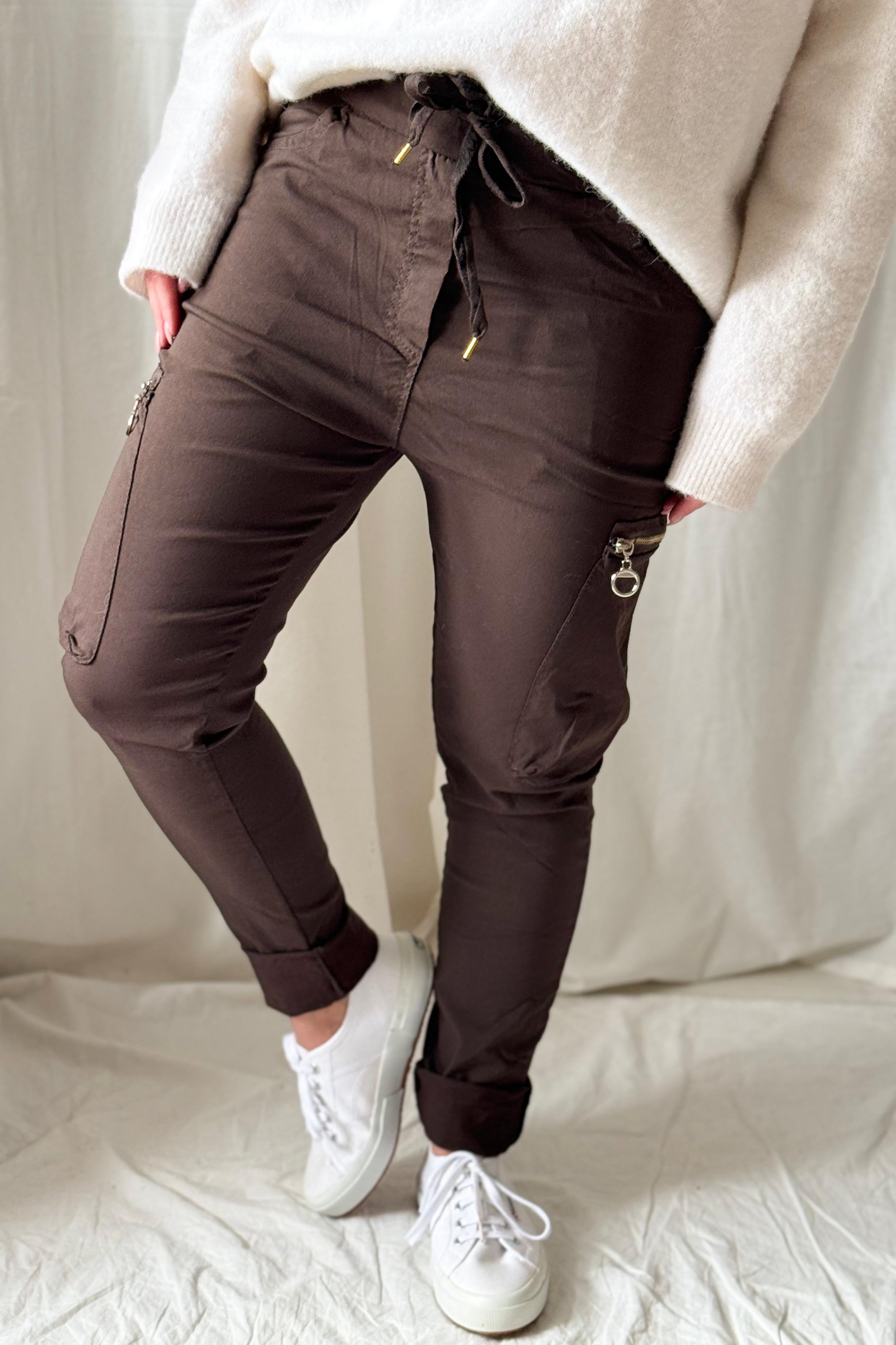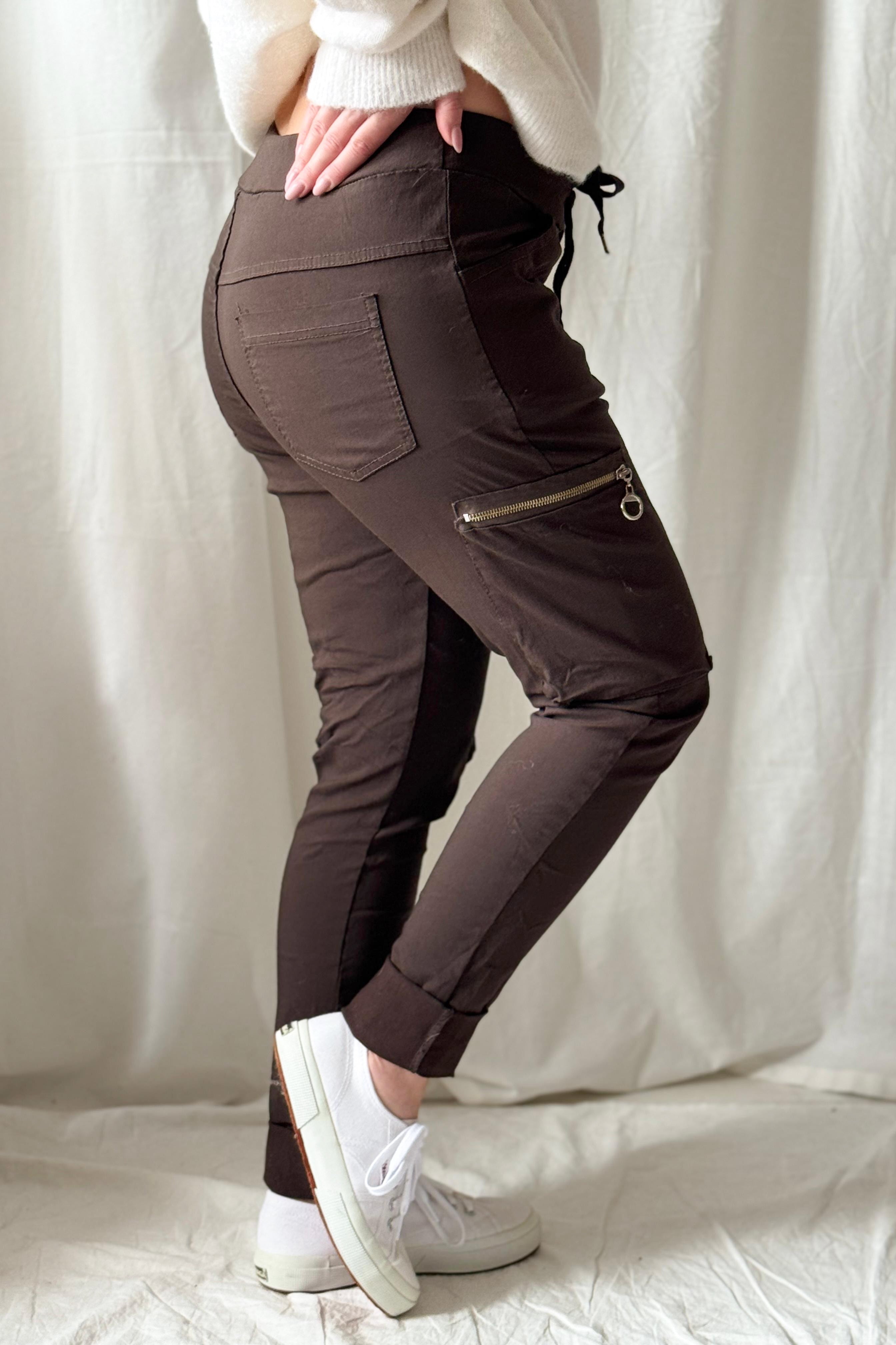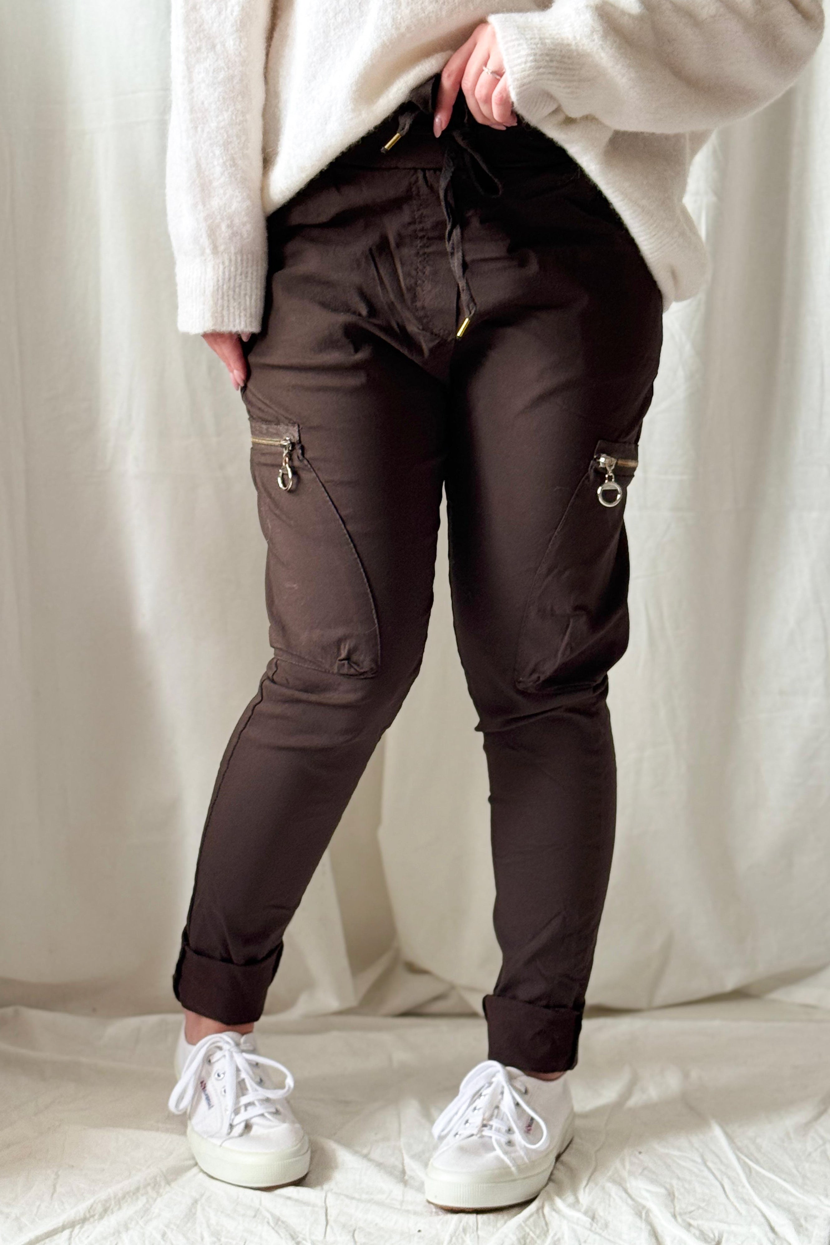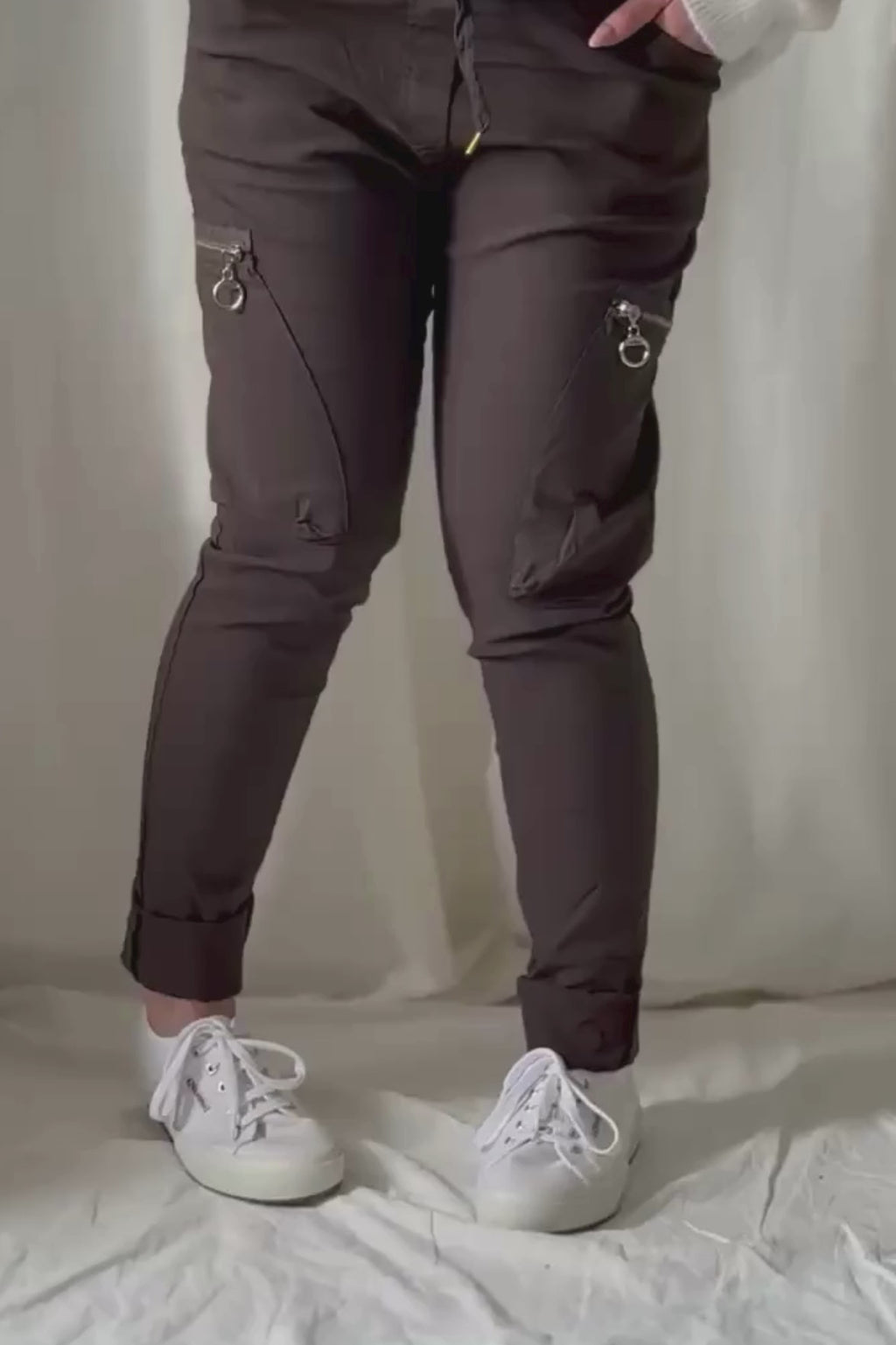 Joustavat ja mukavat joggerit, jotka istuvat kaikille vartalotyypeille. Korkeahko vyötärö, jossa kiristysnyörit. Pull on malli, ei nappeja eikä kinnaavia vetoketjuja. Reisitaskut joissa somisteena vetoketjut. Sopii myös pitkäsäärisille, käärittävät lahkeet. Materiaali bengalinea.