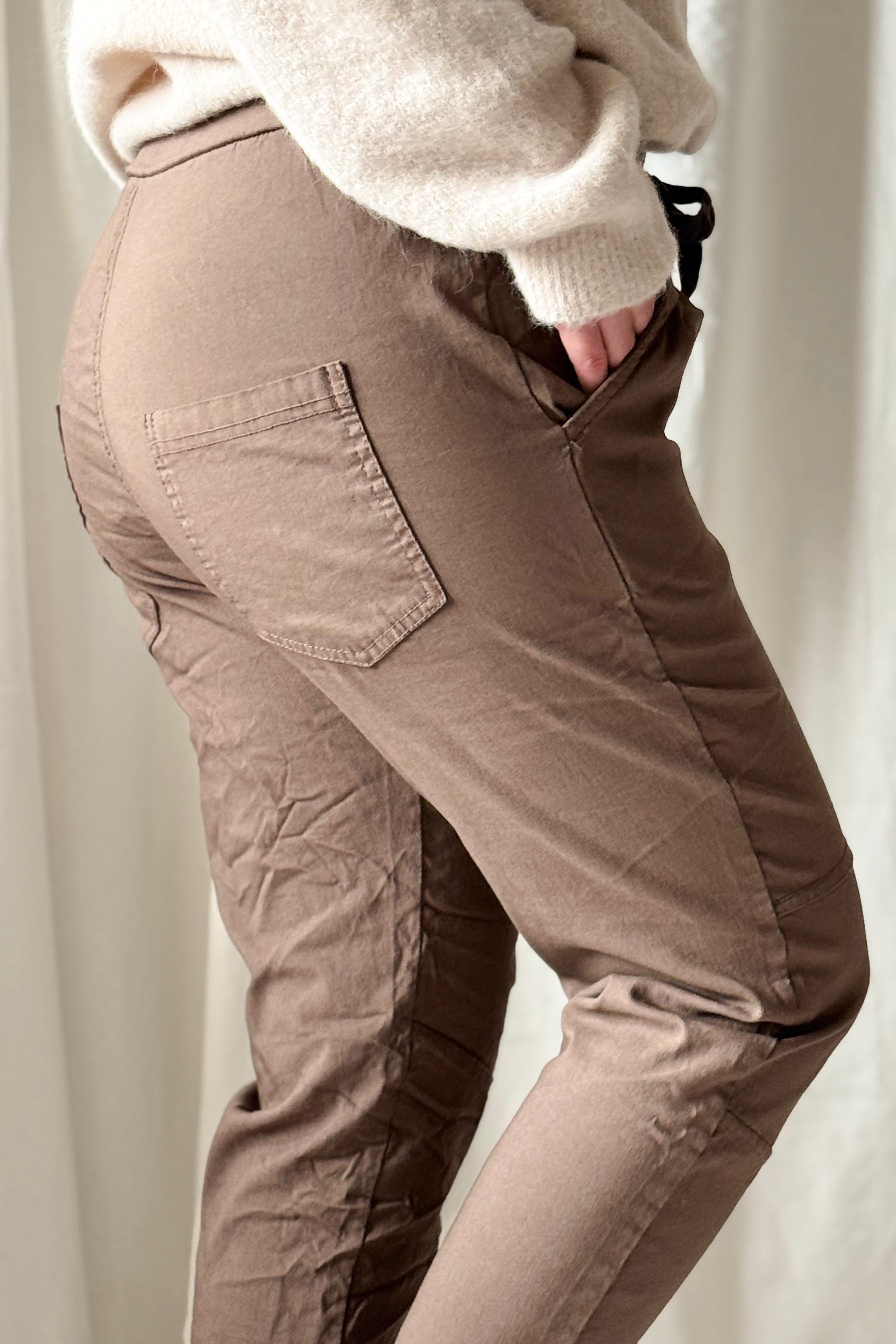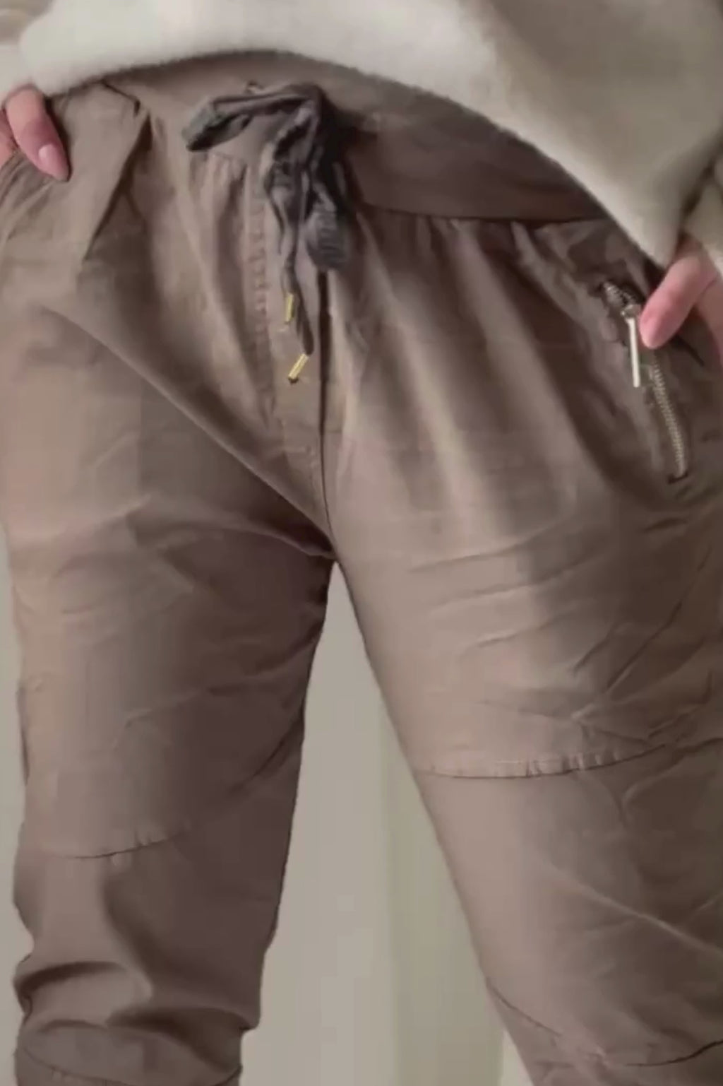 Hyvin joustavissa joggereissa on jujuna epäsymmetriset tikkaukset lahkeiden etuosassa. Toisella puolen piilovetoketju somisteena, ja joggereissa sivutaskut. Pull on malli, ei kiristäviä vetoketjuja tai nappeja. Huikea istuvuus eri vartalonmalleille, materiaali stretchaava bengaline.