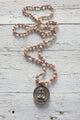 Luonnonkivistä valmistettu helminauha 43cm, jossa patinoitu laatta tinaa 3cm.