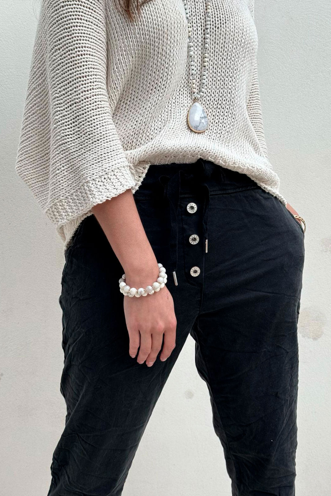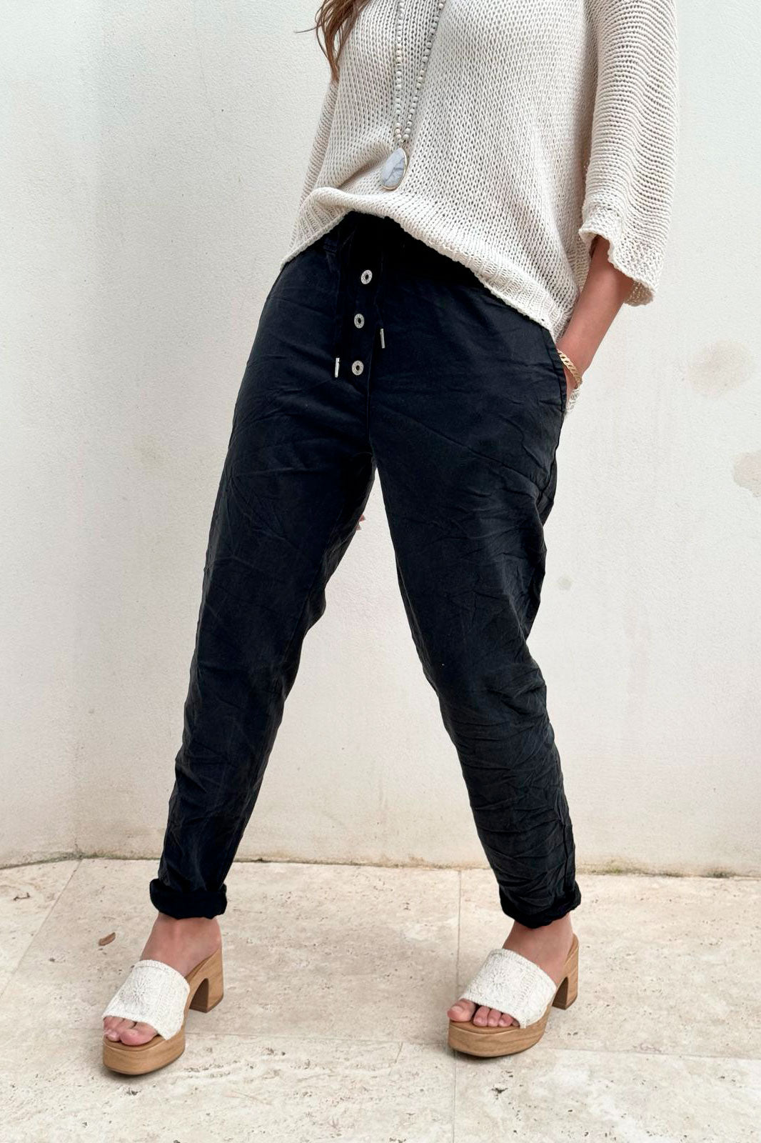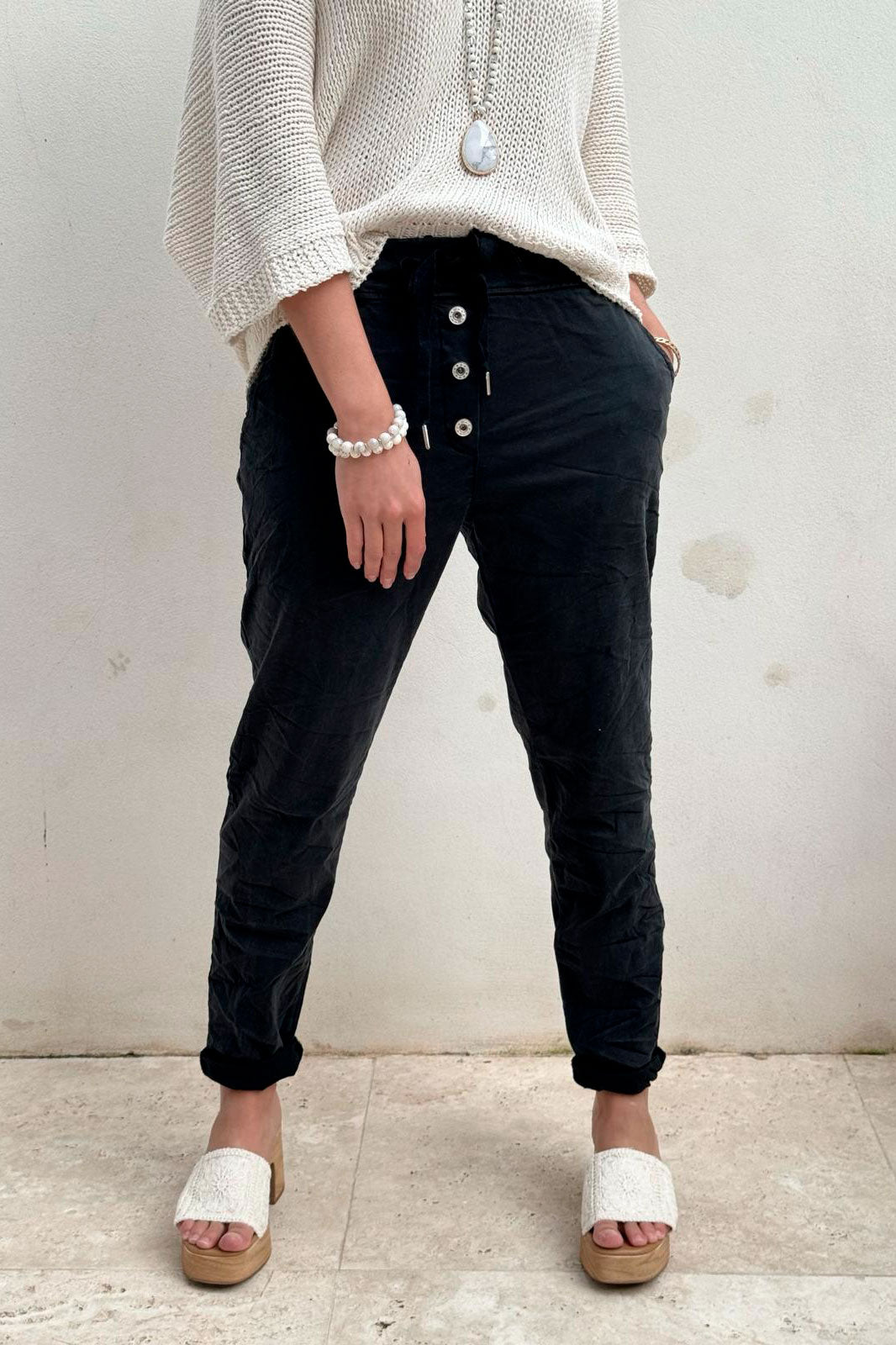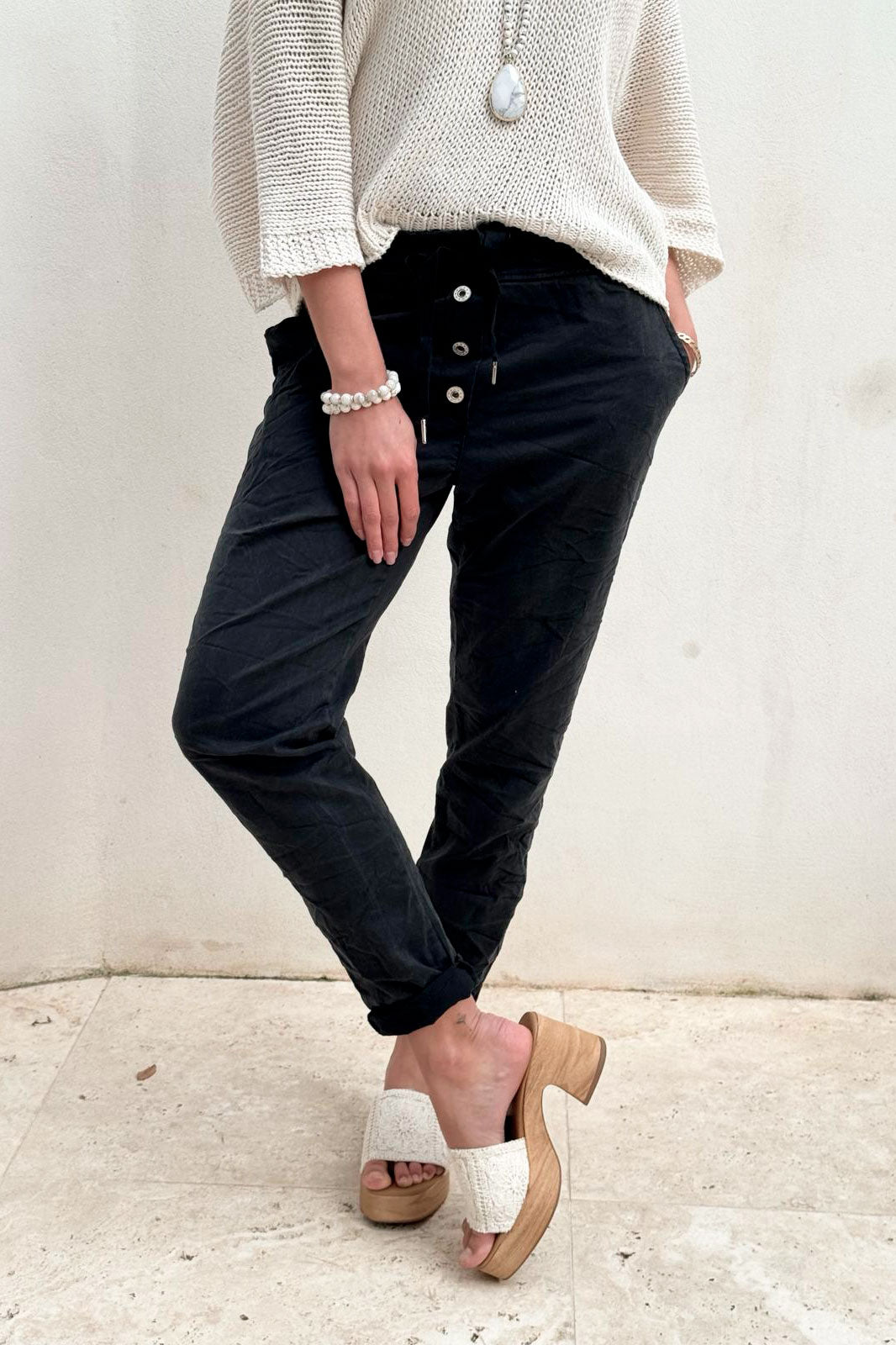 Supermukavat joggerit ihanan pehmeästä tencelistä! Joggereissa on edessä koristeena kolme nappia ja taskut ja ne sujahtavat mukavasti jalkaan. Kiristysnauha vyötäröllä.