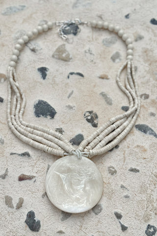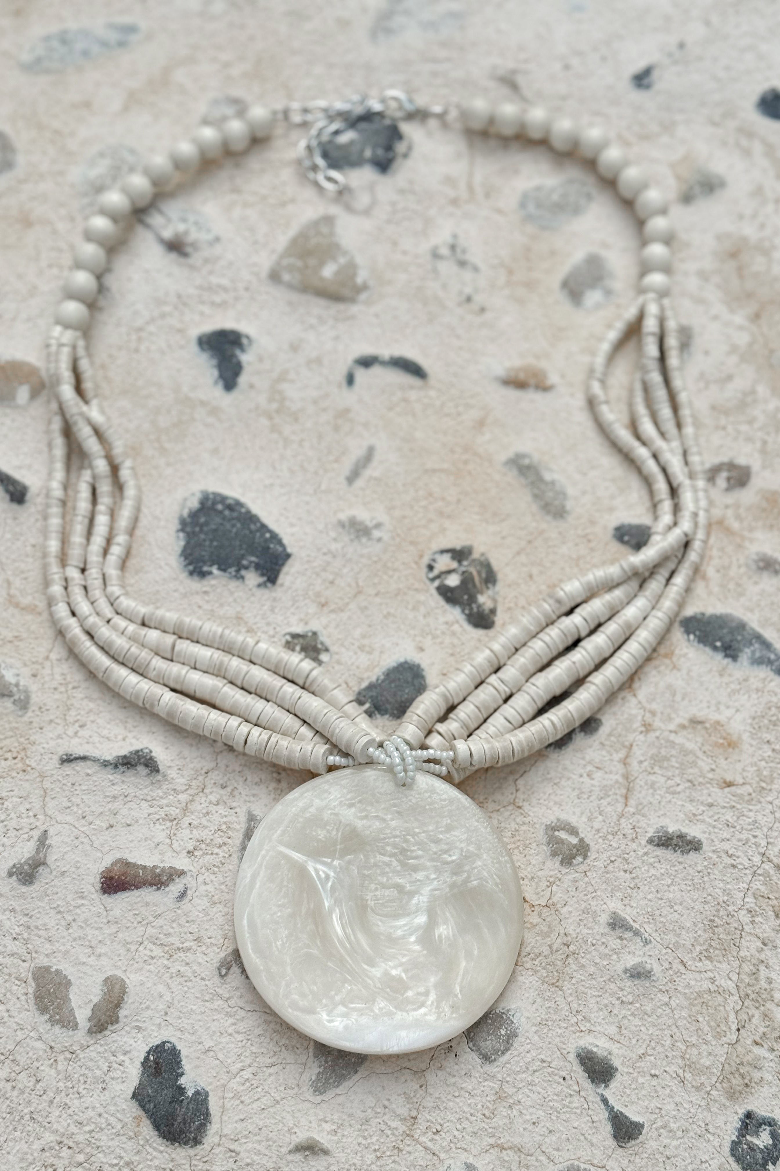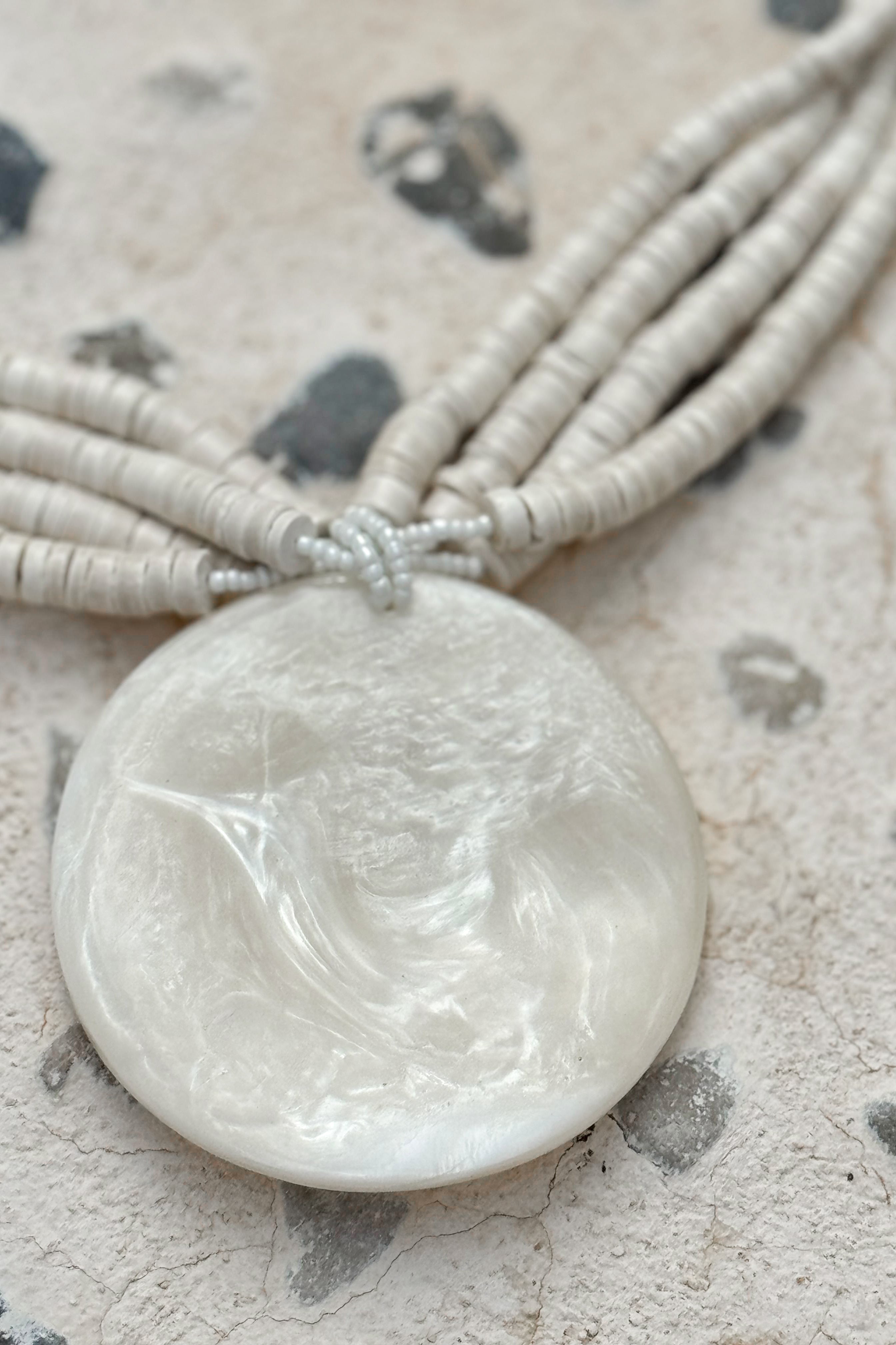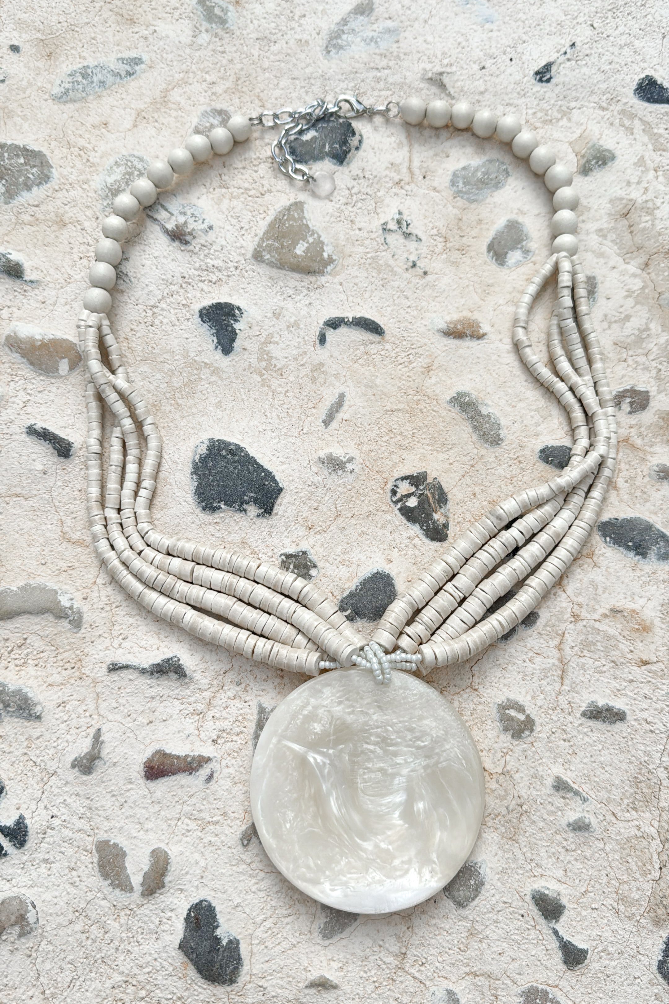 Tämä upea boheemi kaulakoru tuo luonnon kauneuden ja eleganssin yhteen. Moniriviset helmiäiskorut ja suuri, hohtava simpukkariipus tekevät tästä korusta ainutlaatuisen lisän mihin tahansa asukokonaisuuteen.