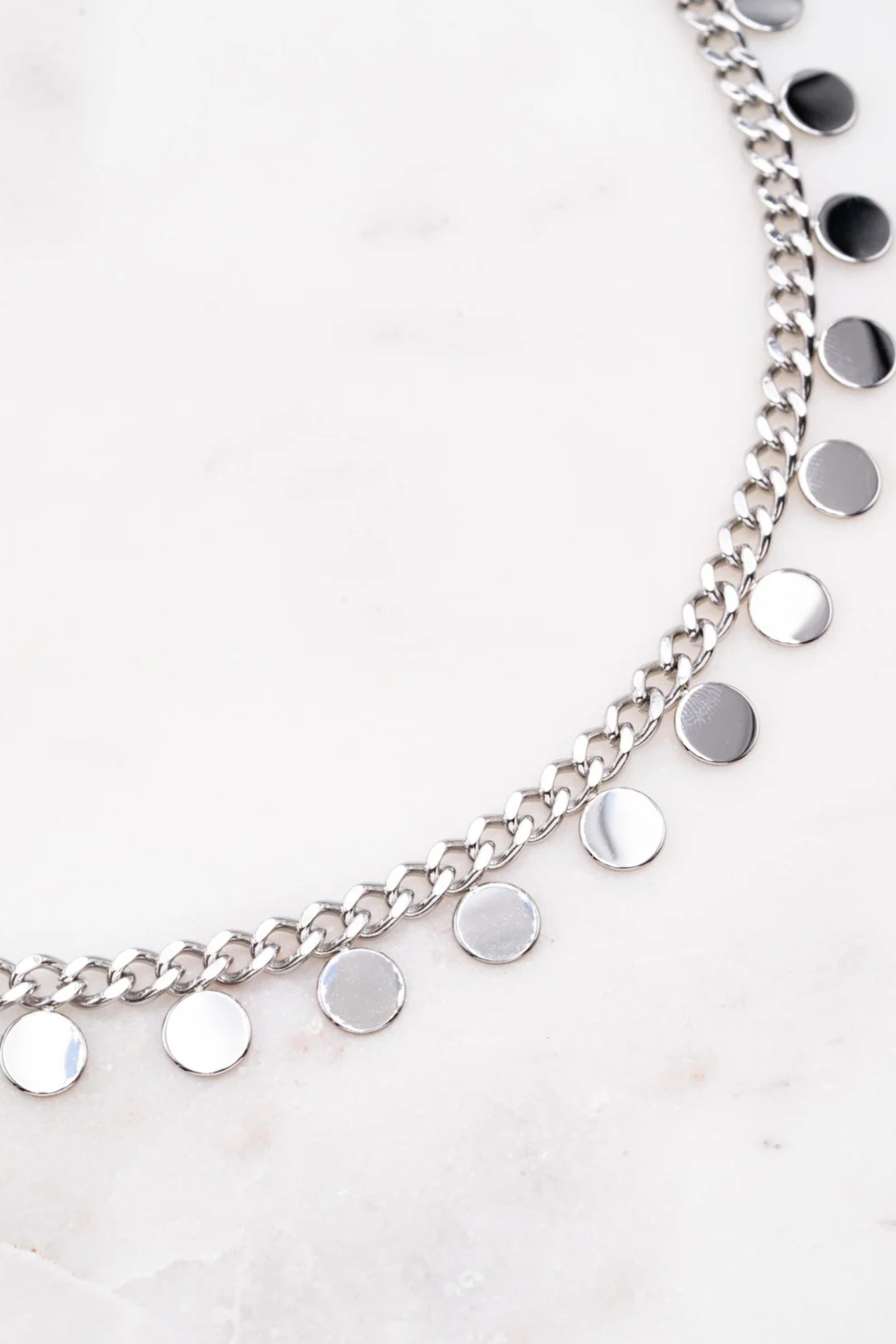 Hienostunut hopeanvärinen kaulakoru, jossa pyöreitä laattoja.