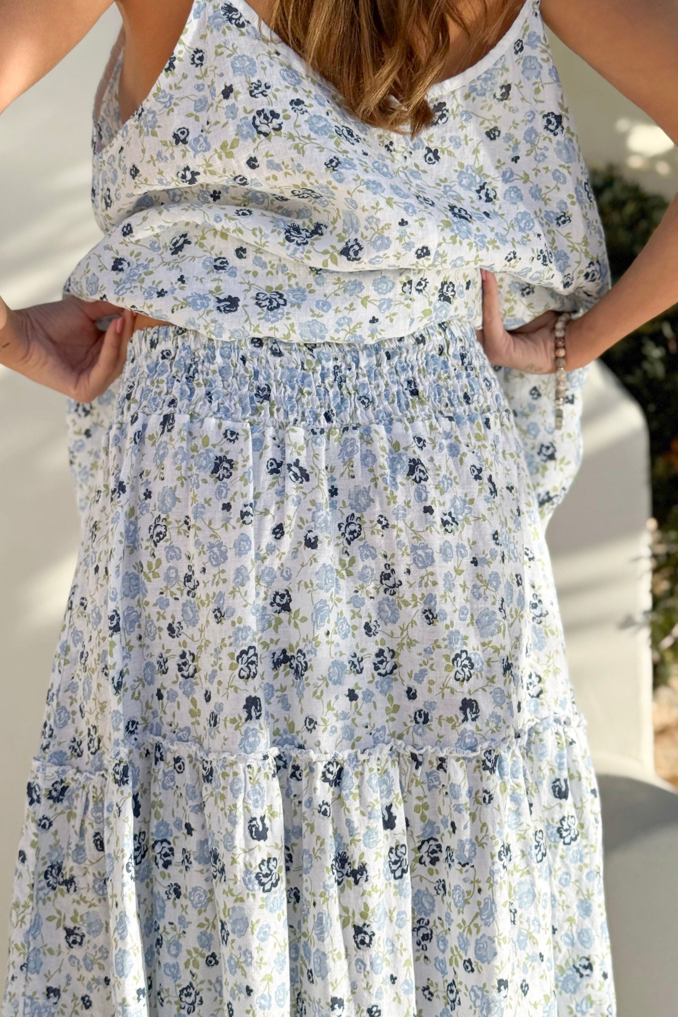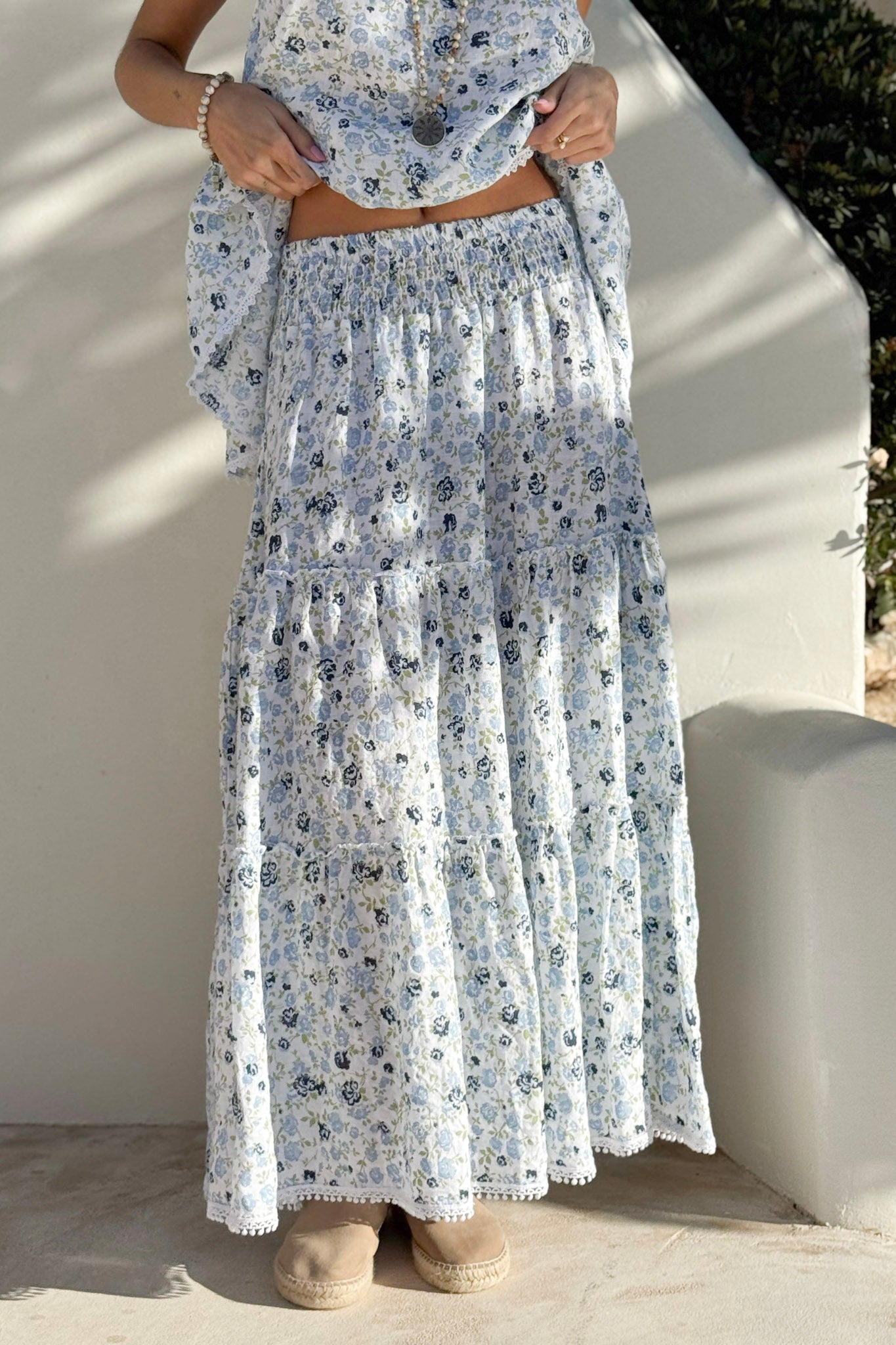 Ilmava ja kauniisti laskeutuva pellavahame hurmaa ajattomalla tyylikkyydellään. Hame on valmistettu kevyestä ja pehmeästä pellavasta, joka tuntuu miellyttävältä iholla myös lämpiminä kesäpäivinä. Korkea, smokkirypytetty vyötärö takaa mukavan ja imartelevan istuvuuden, ja monikerroksinen helma tuo ilmeeseen ilmavuutta ja boheemia eleganssia. Hameen yksityiskohtina kulkevat pienet, huolitellut saumat, jotka antavat asulle kauniin ja yksityiskohtaisen viimeistelyn.