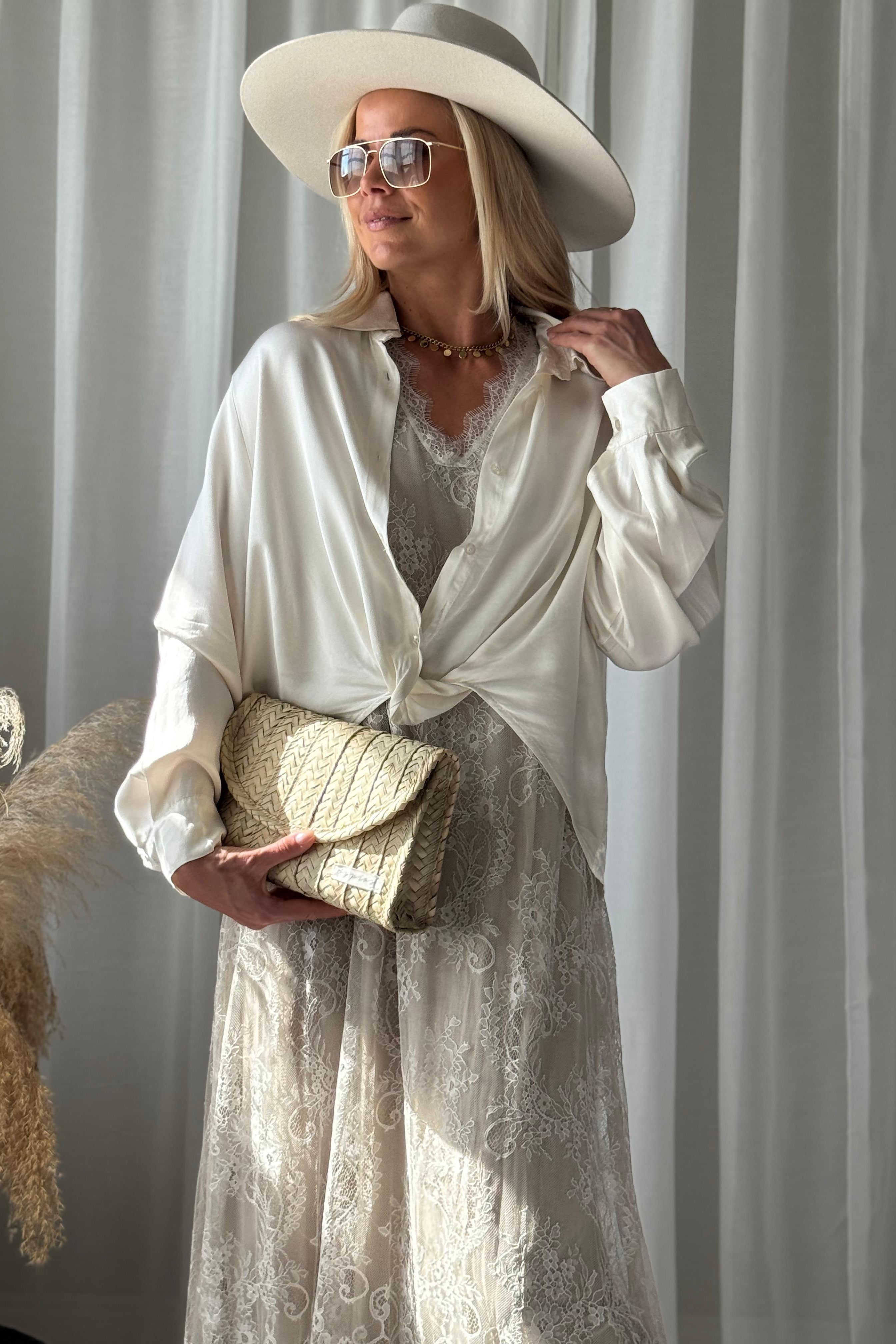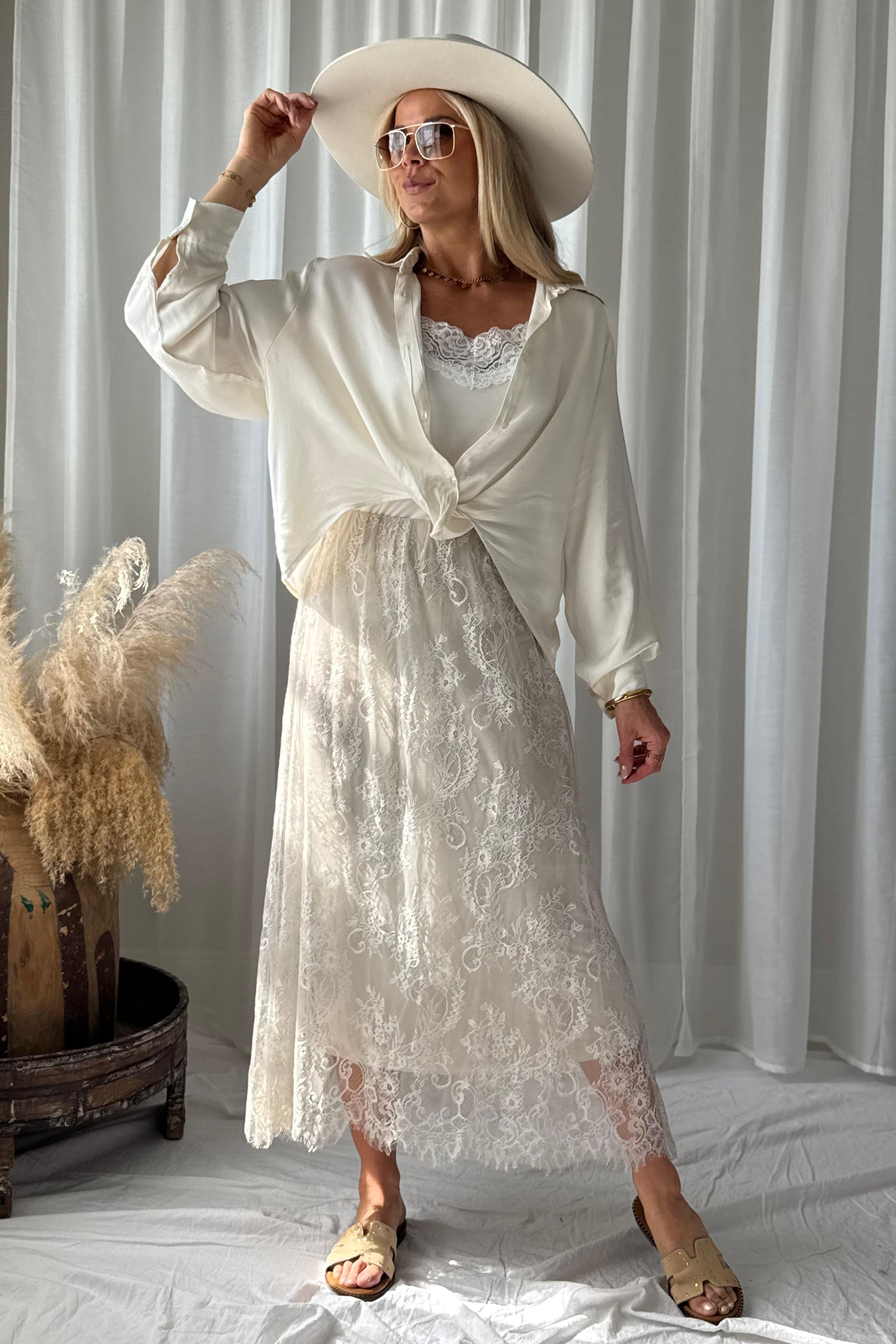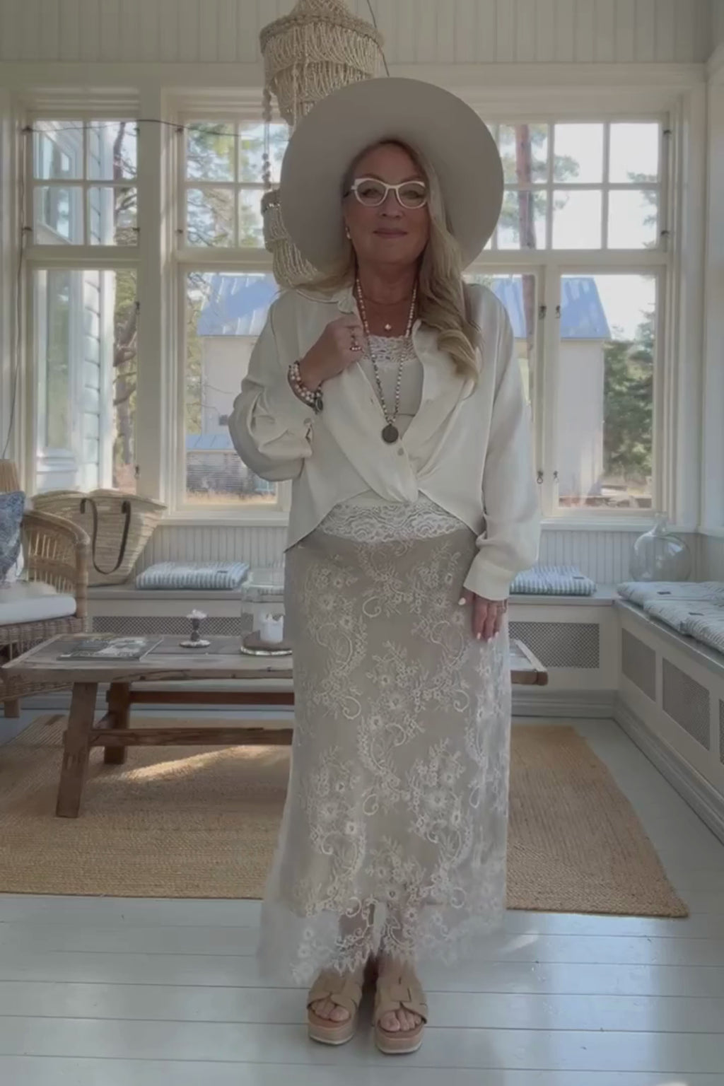 Kevyt pitsihame, jossa on kaunis kauttaaltaan pitsinen pinta ja elegantti pitsireunainen helma. Malli on suoralinjainen ja ajaton. Hameessa on joustava vyötärö, joka takaa hyvän istuvuuden ja käyttömukavuuden. Materiaali on miellyttävän joustavaa.