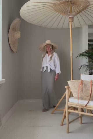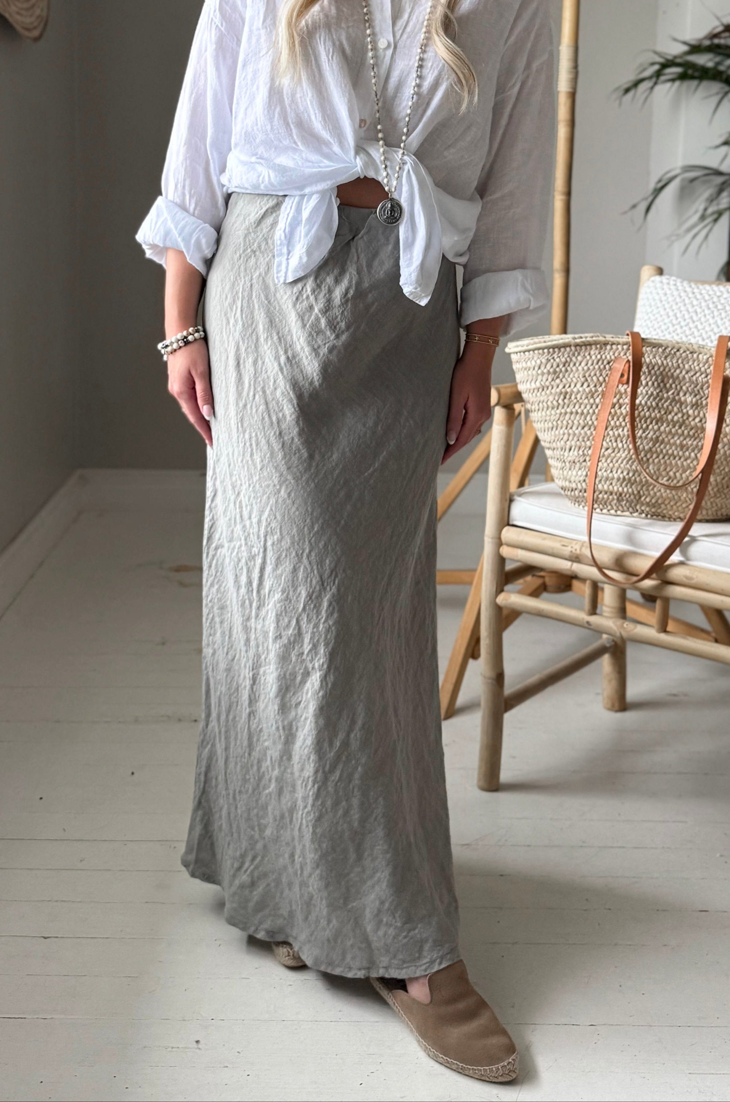 Naisellinen pitkä pellavahame on kauniin yksinkertainen ja sopii sekä arkeen, että juhliin. A-linjainen kapea hamemalli on helppo yhdistää eri paitojen ja neuleiden kanssa. Vyötäröllä on venyvä kuminauha.