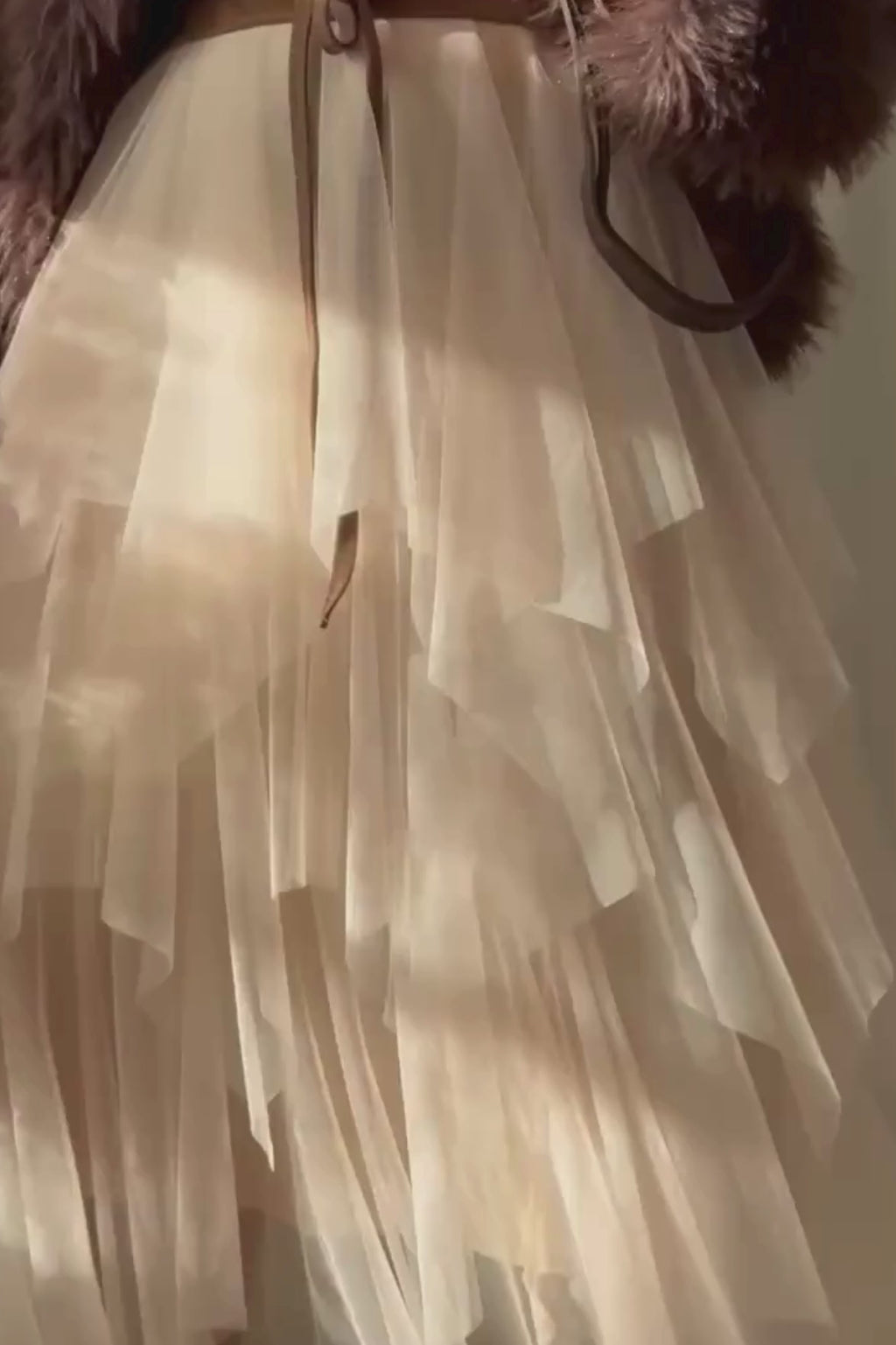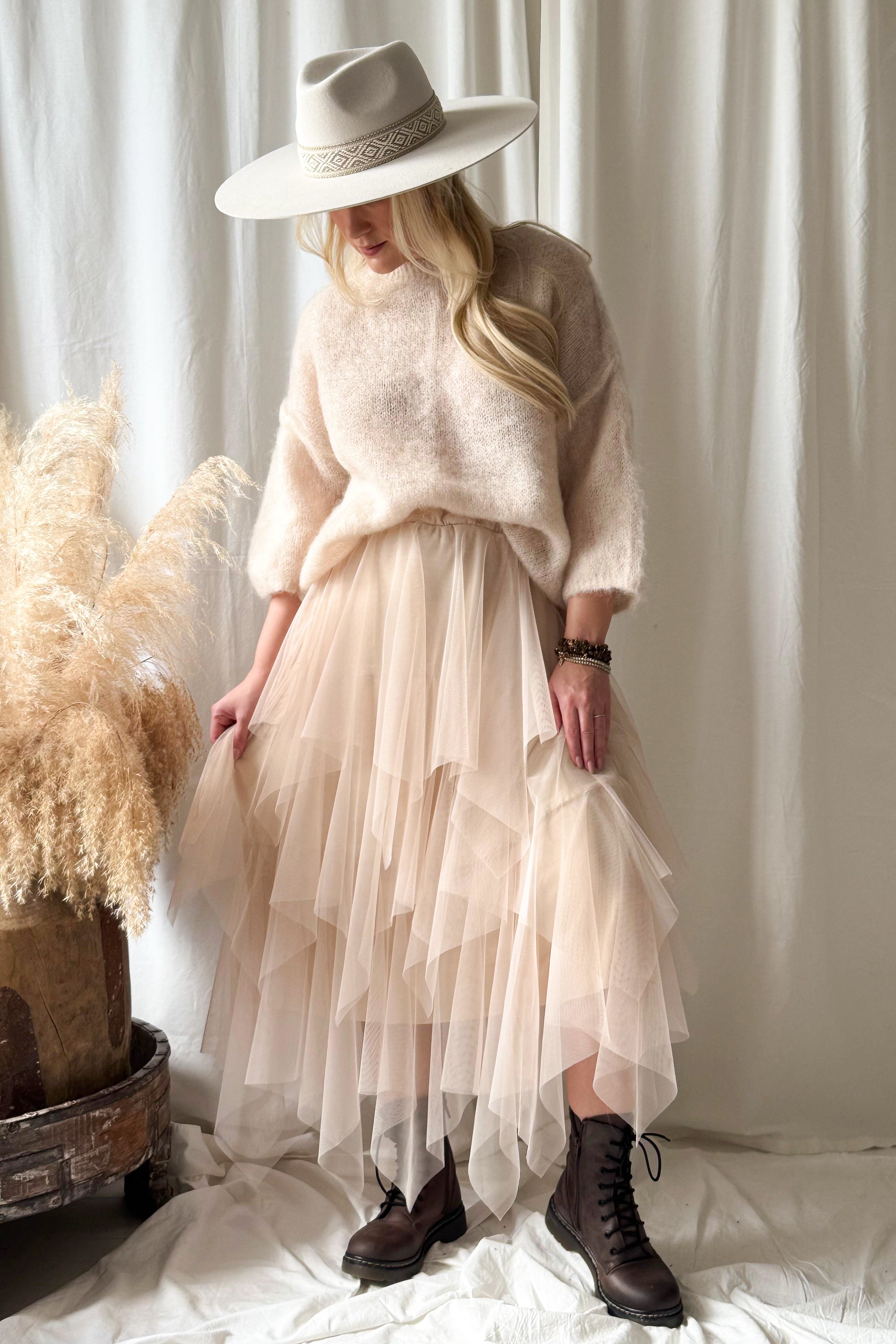 Unelmainen tyllihame, jonka viistosti leikatut kerrokset hulmuavat upeasti liikkuessa. Vyötäröllä tyllikankaalla vuorattu kuminauha. Kaksi kokoa, joista pienempi käy 34-38 kokoiselle ja reilumpi 40-42 kokoiselle. Vuorihame on joustavaa viskoositrikoota.